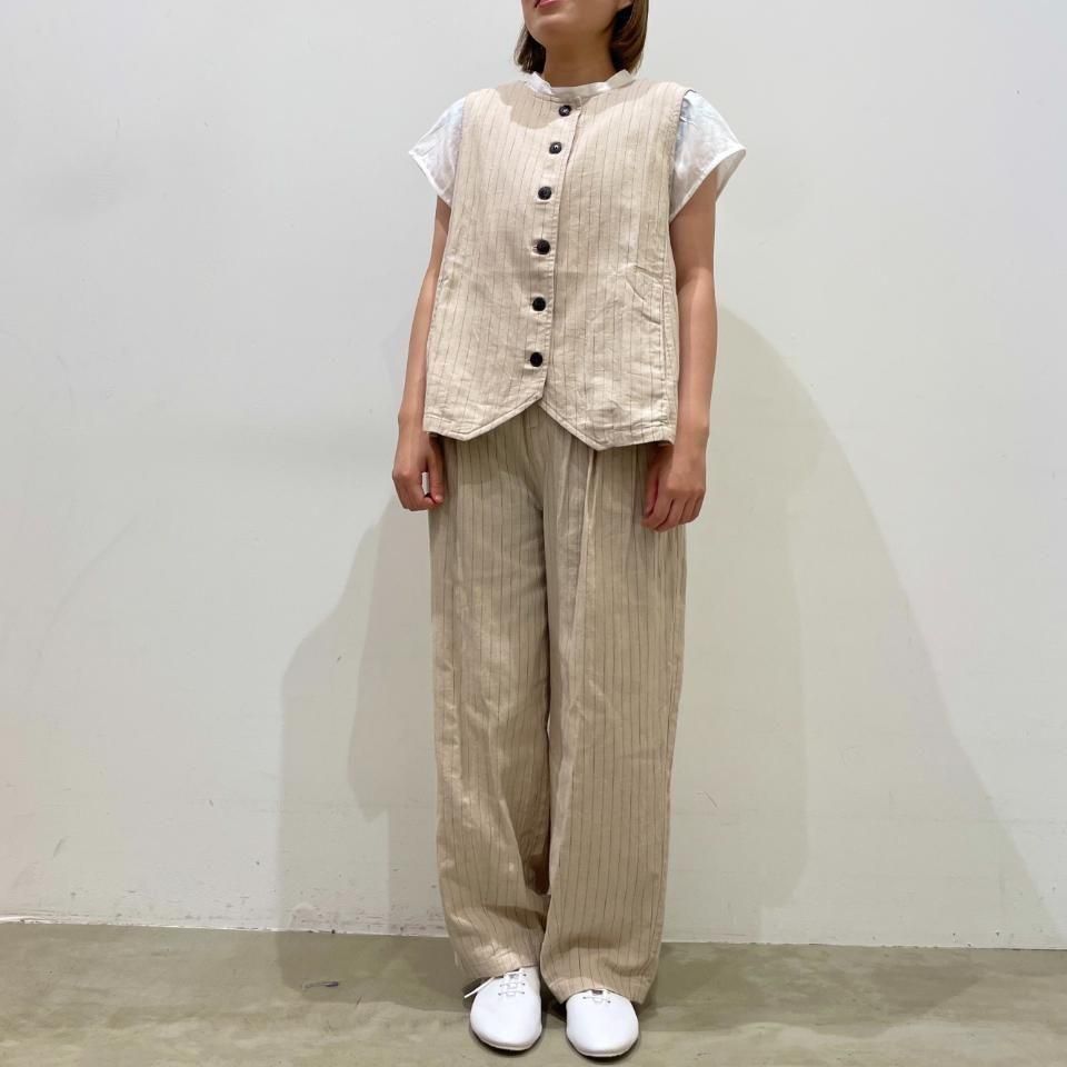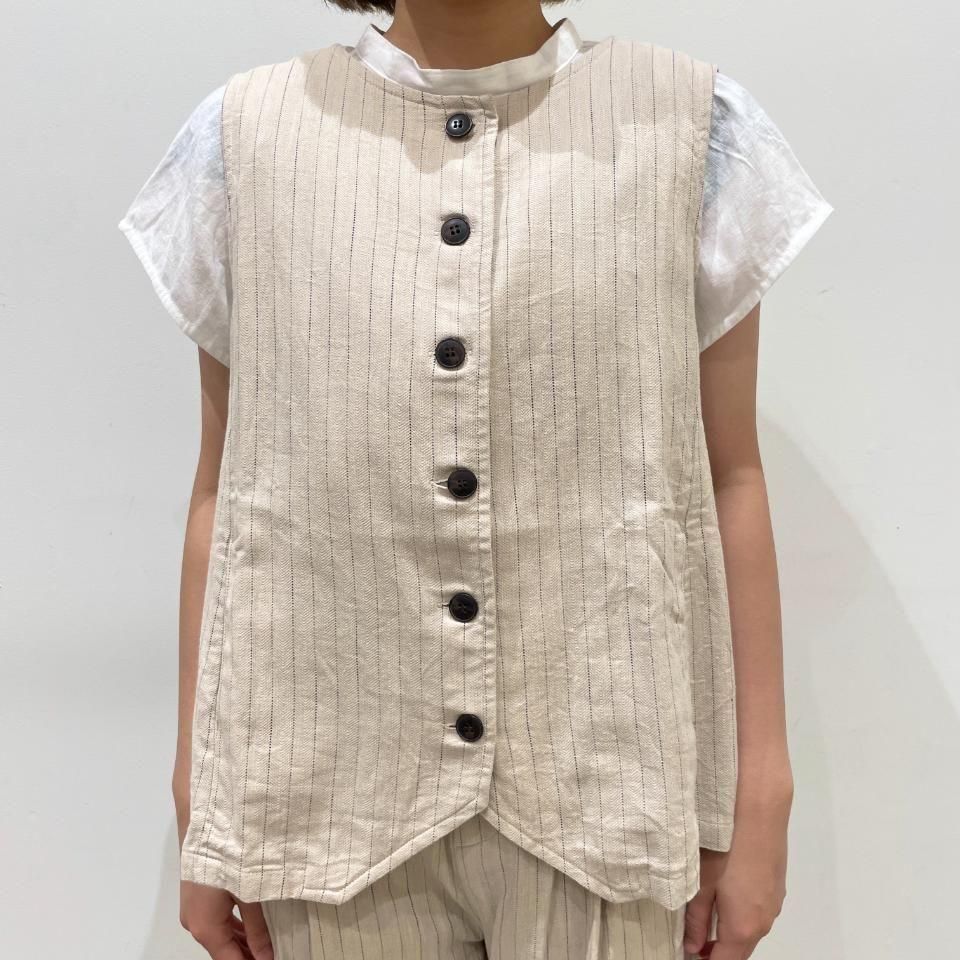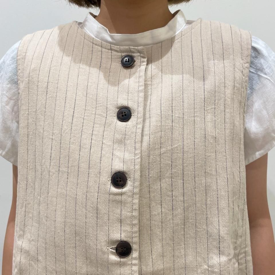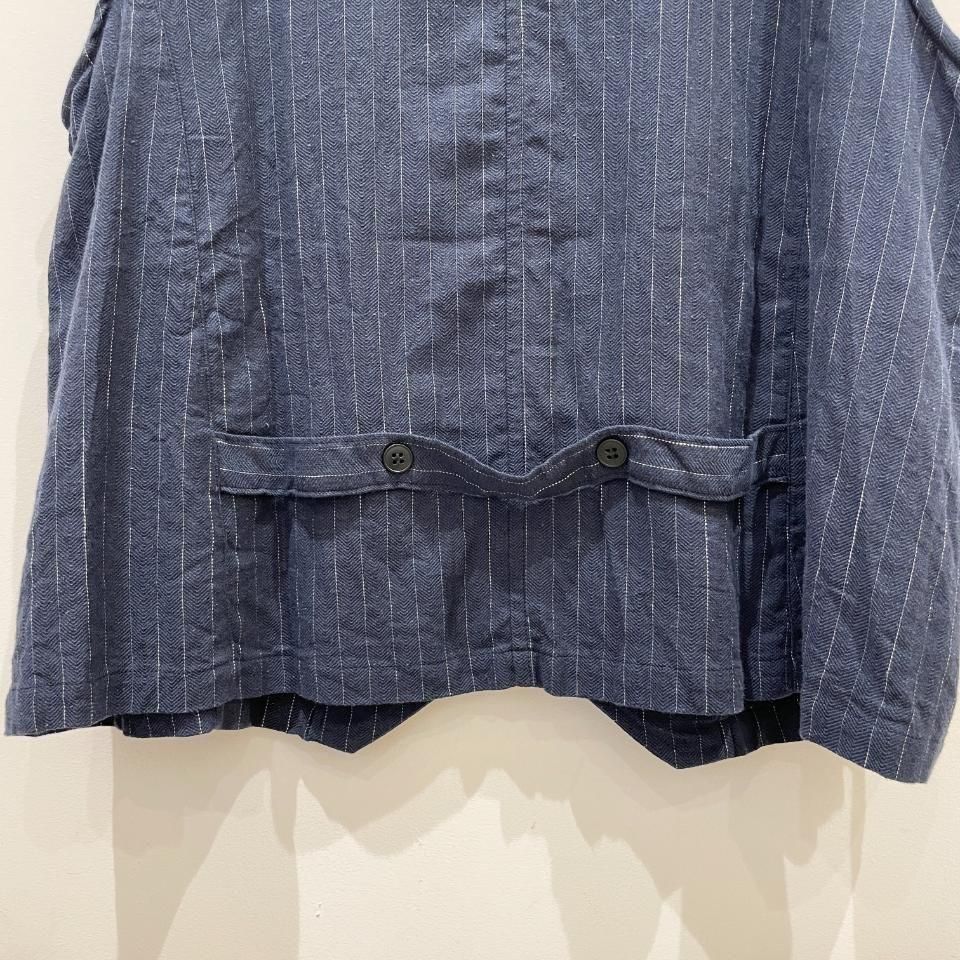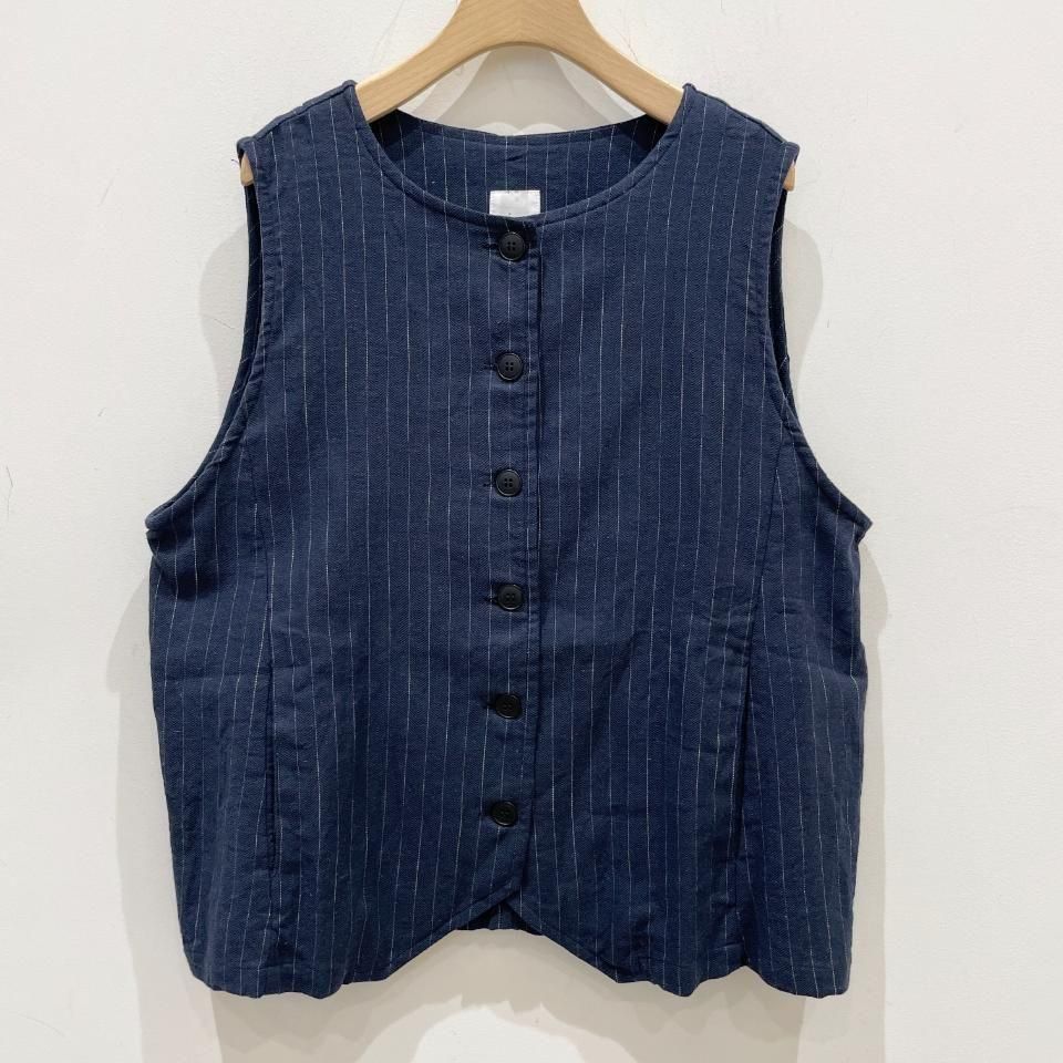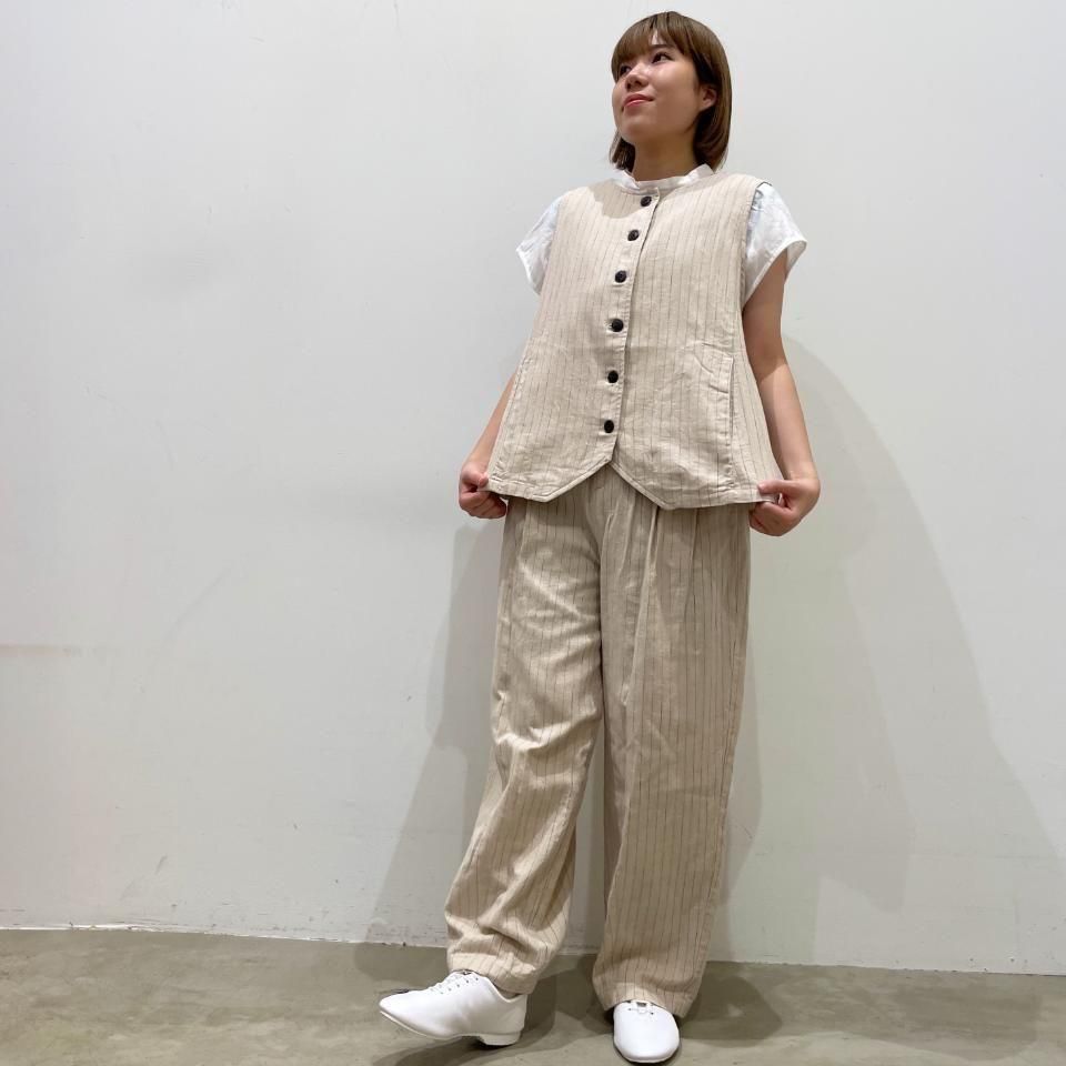 コーデにプラスしたい後ろベルト付きのストライプベスト。