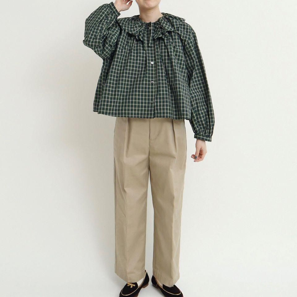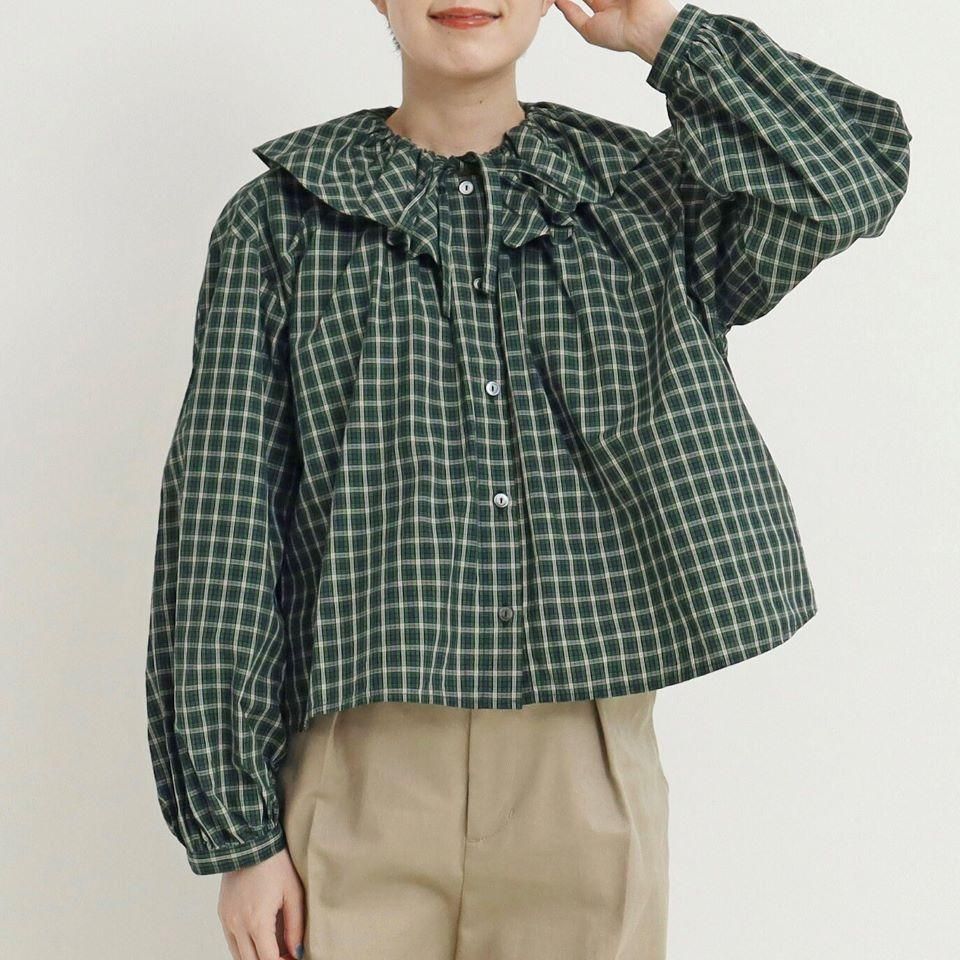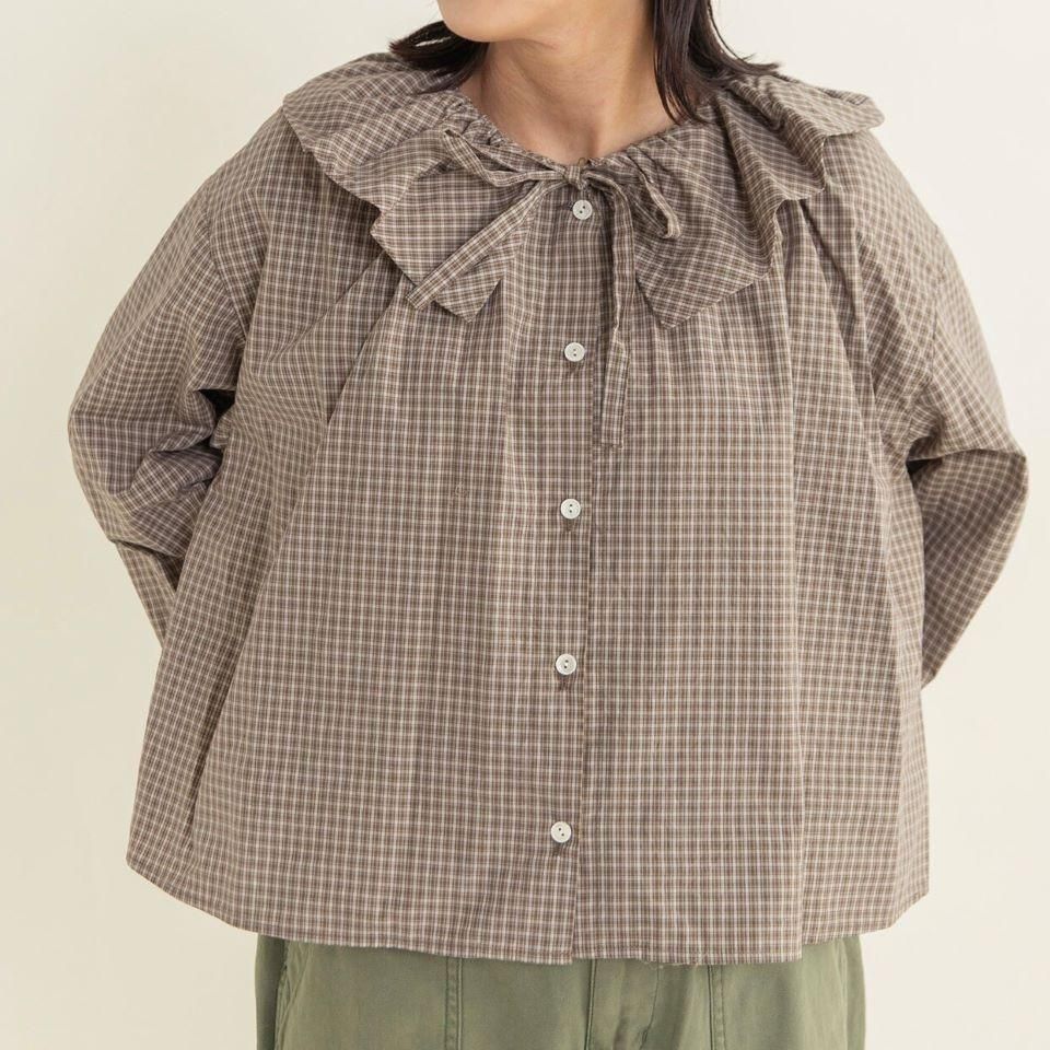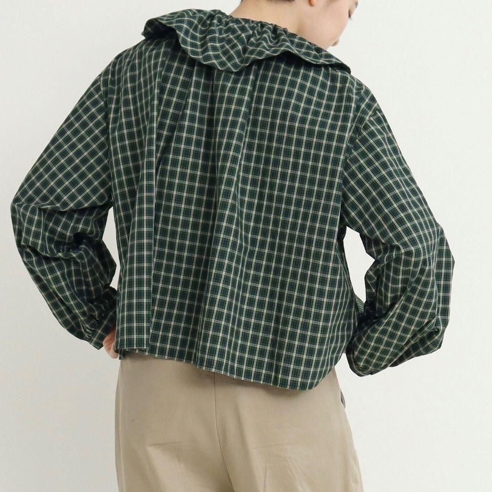 カジュアルな印象のチェック柄ですが、敢えてフリルやギャザー、ボリュームのあるお袖で甘さをプラス。