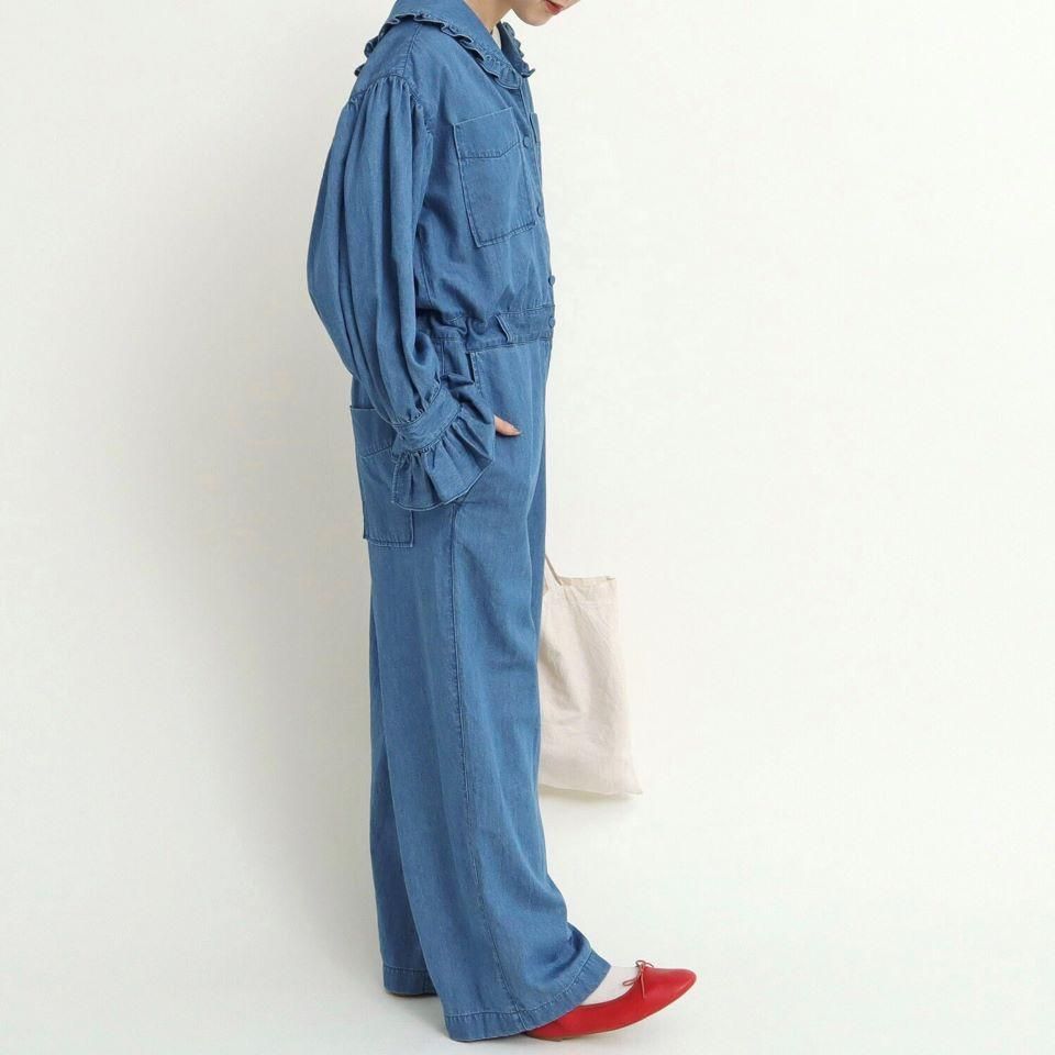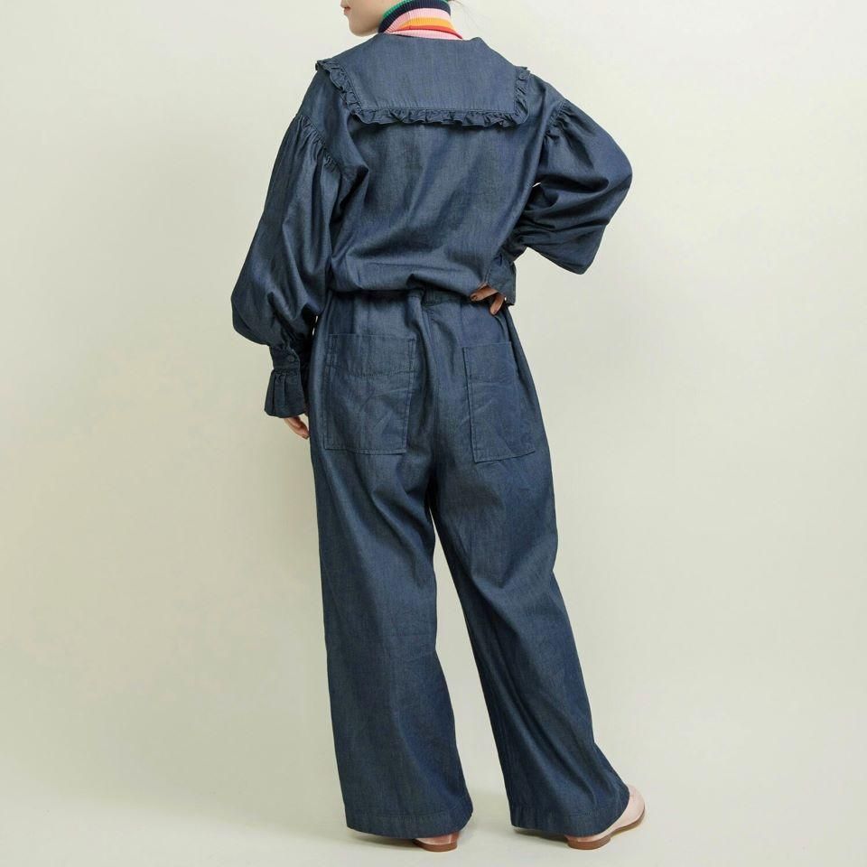 ワークなイメージの強いジャンプスーツもセーラーカラーにすることでCHILD WOMANらしいフレンチカジュアルな雰囲気に。