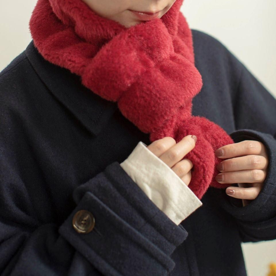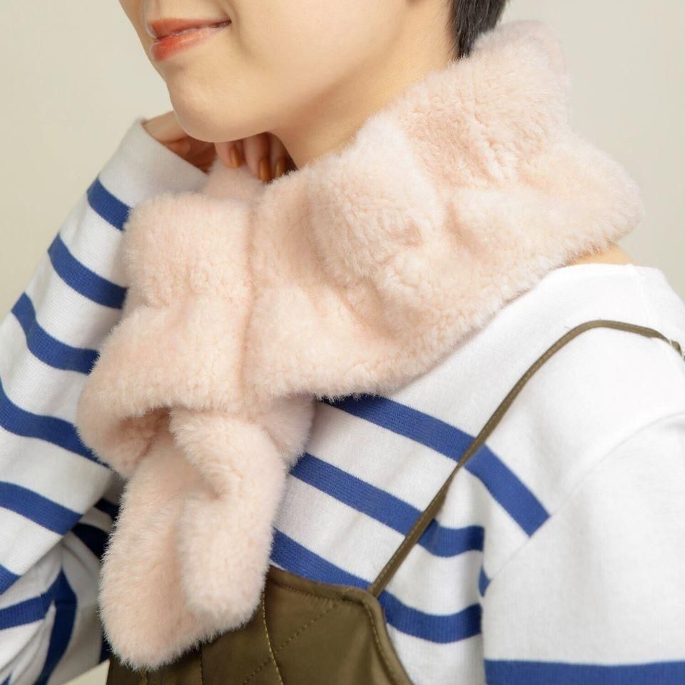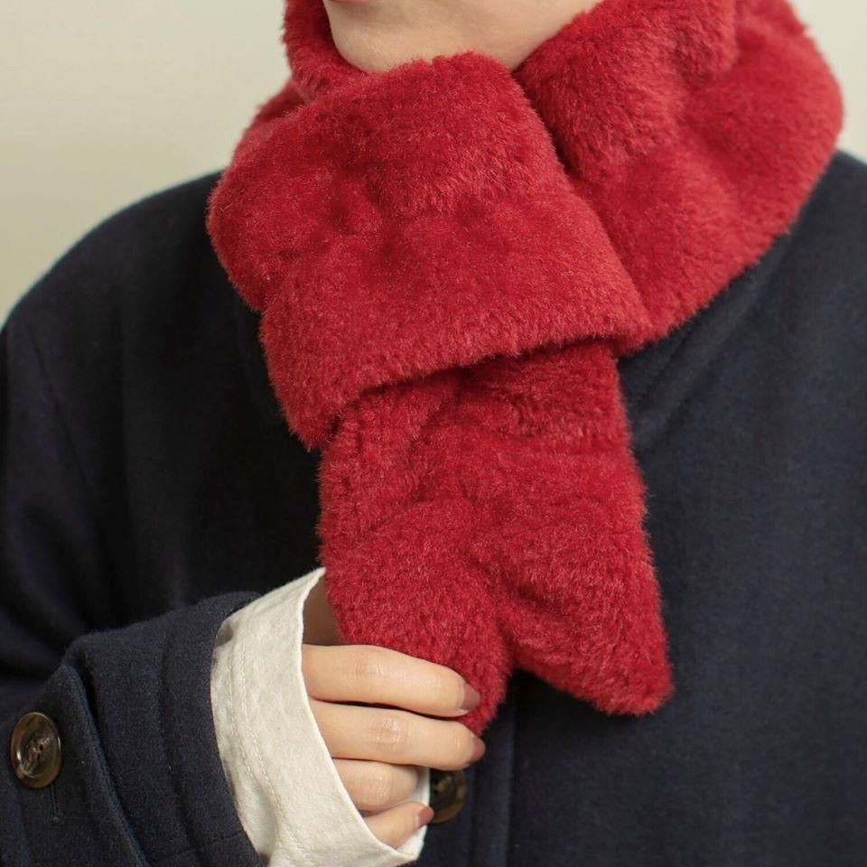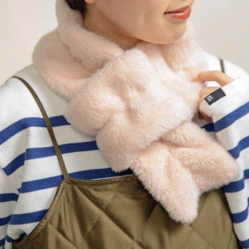 いつもよりも毛足の短いしなやかなフェイクファーを使用し、ふんわりと柔らかで肌触りも良く、巻いた時にストレスなく身に付けて頂けます。