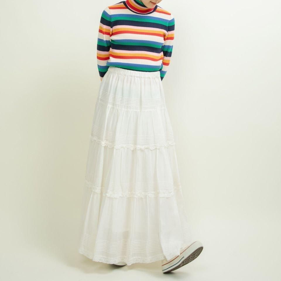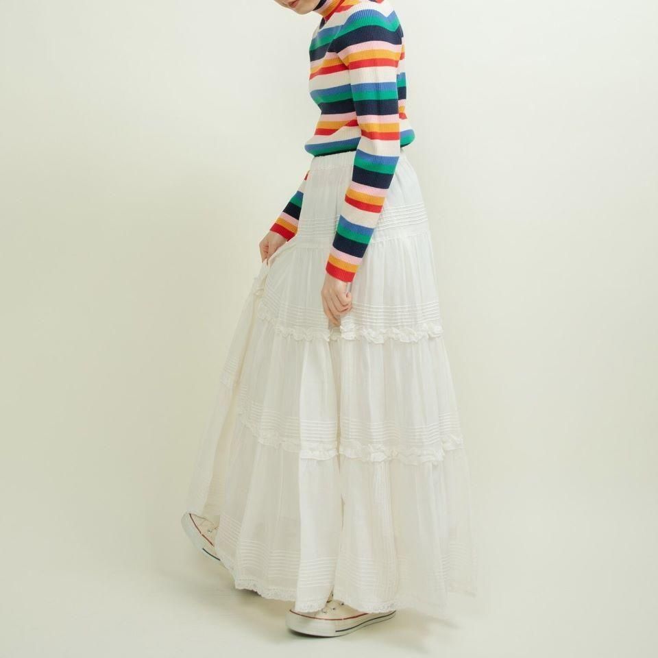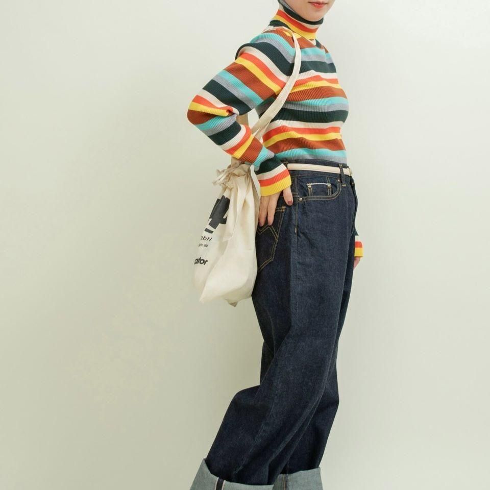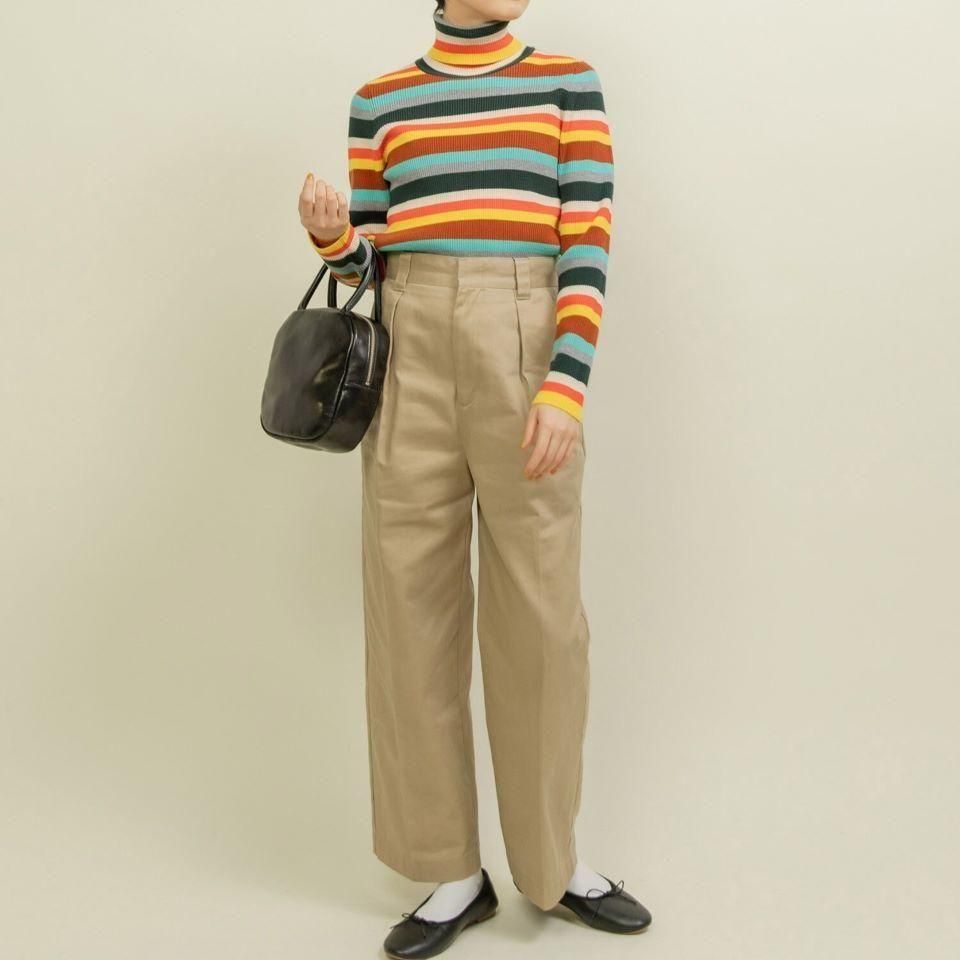 もちもちとした質感が人気のレーヨン/ポリエステルの糸で編んでリブタートルニットを今年は配色やボーダーのピッチにこだわり、レトロな印象にお作りしました。