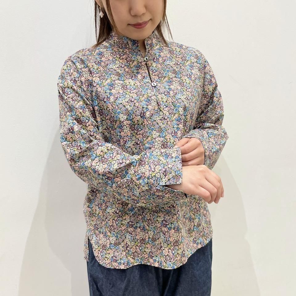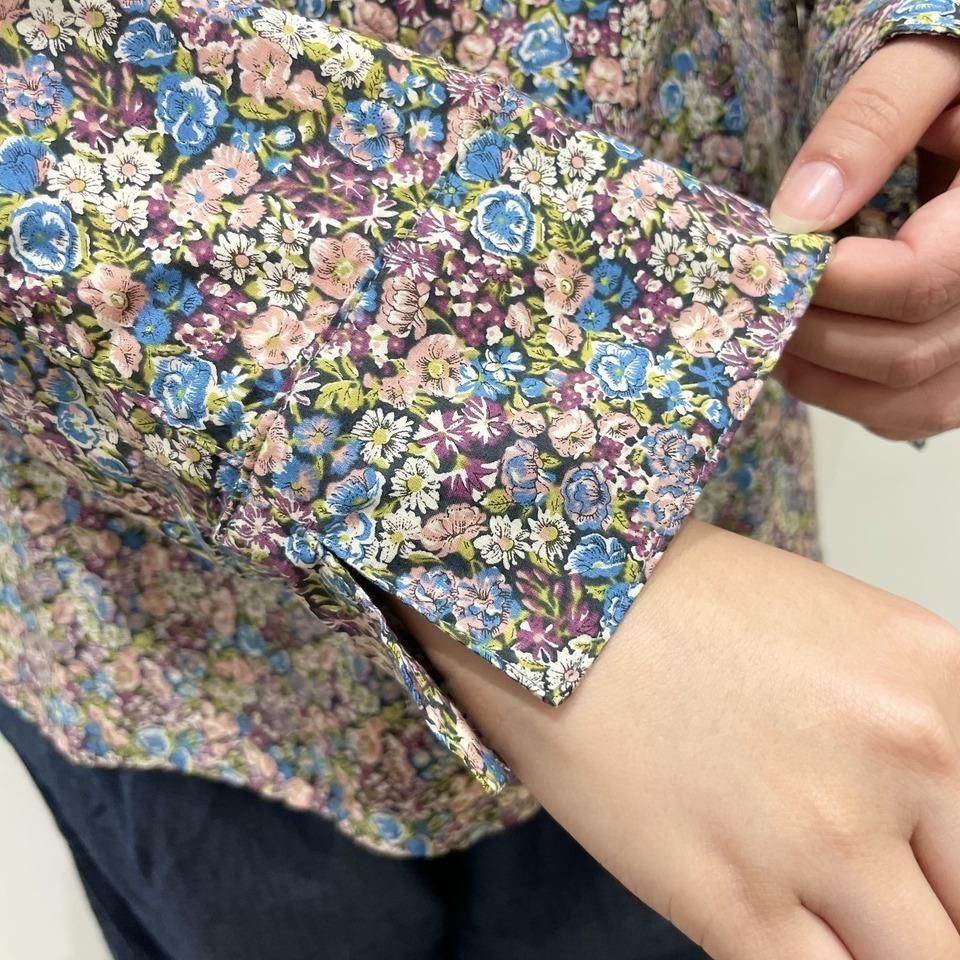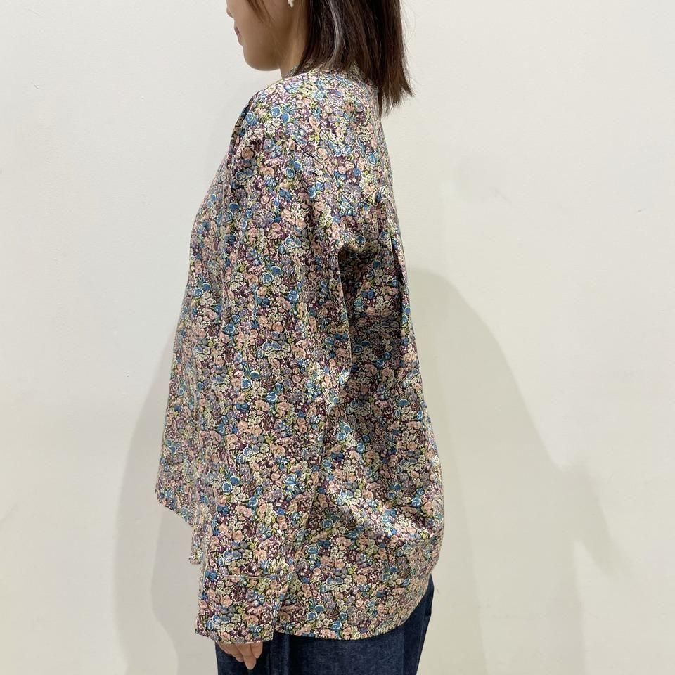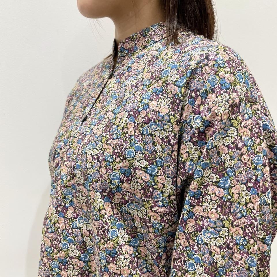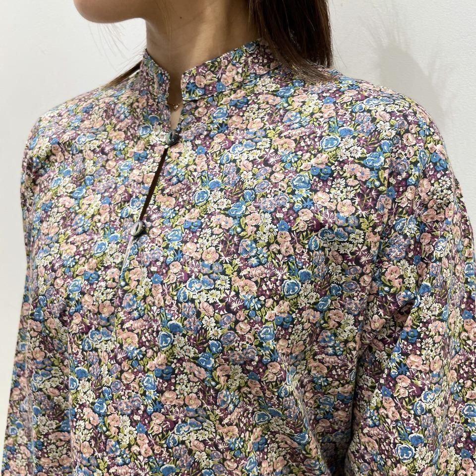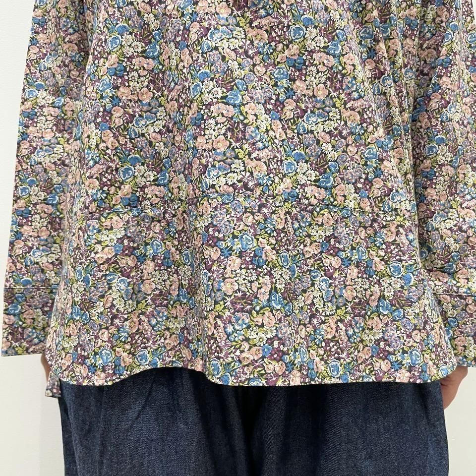 パープルがベースの小花柄リバティプリントのポッターシャツ。