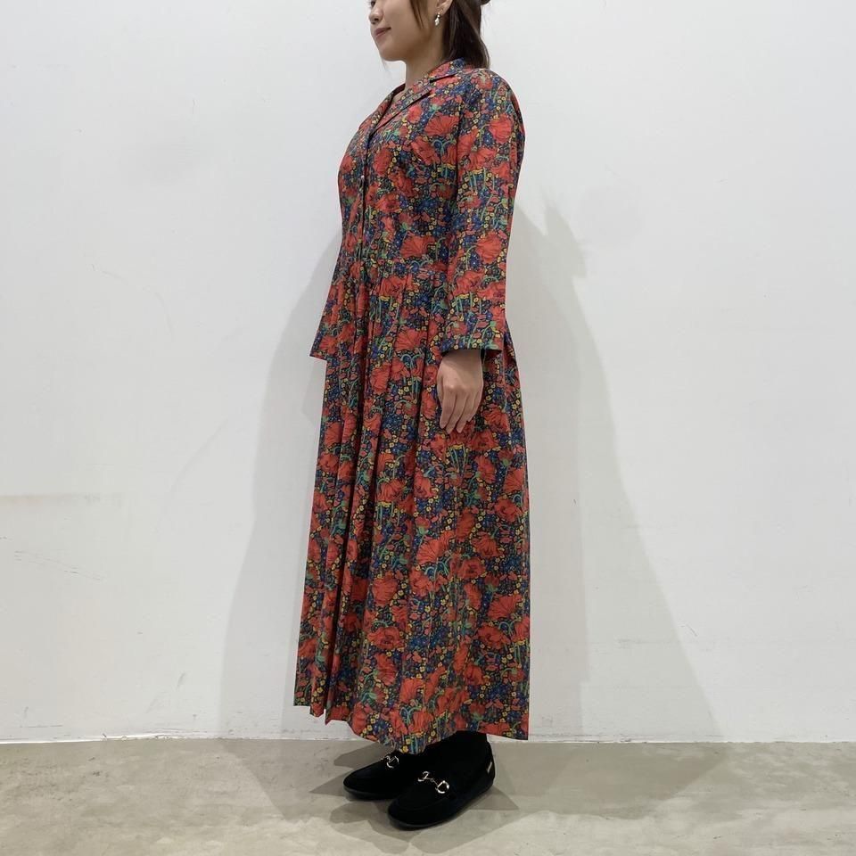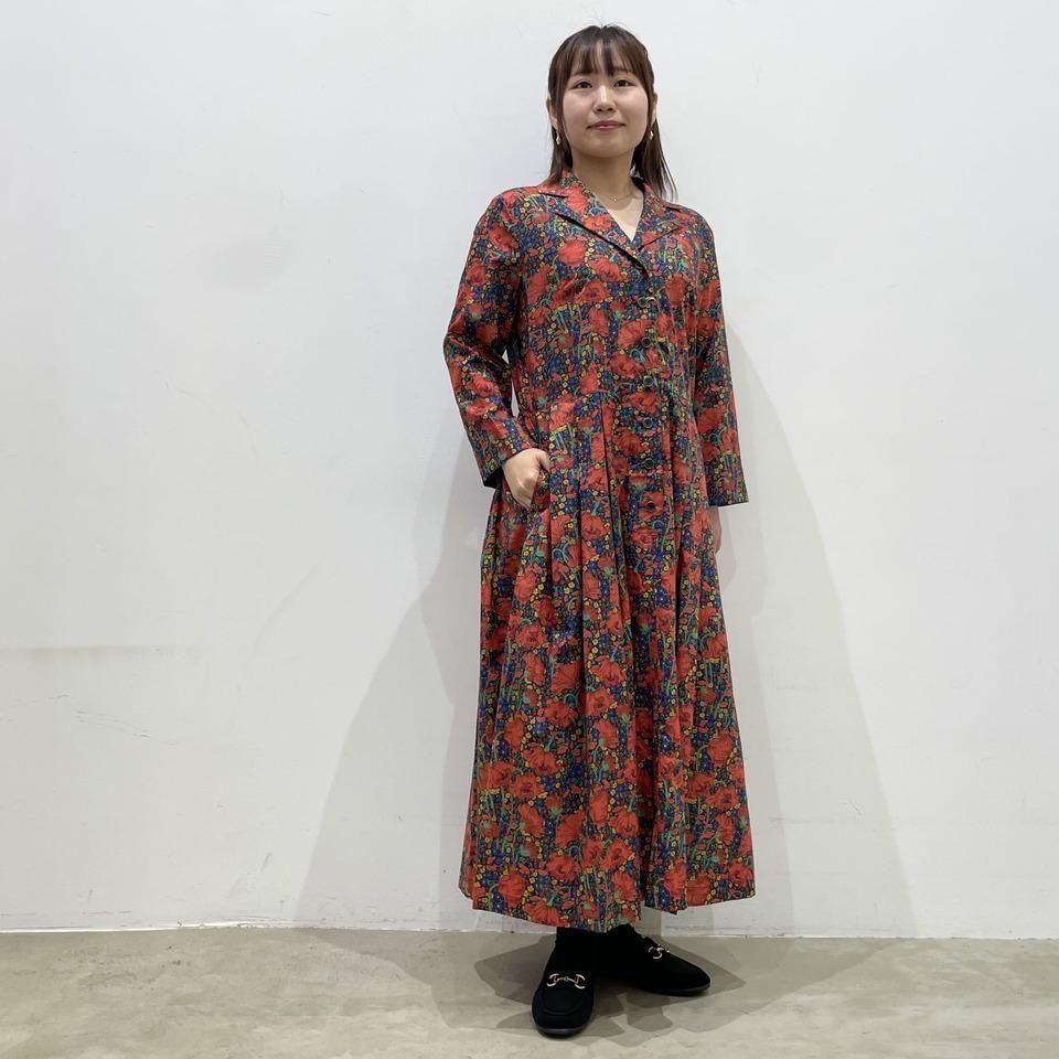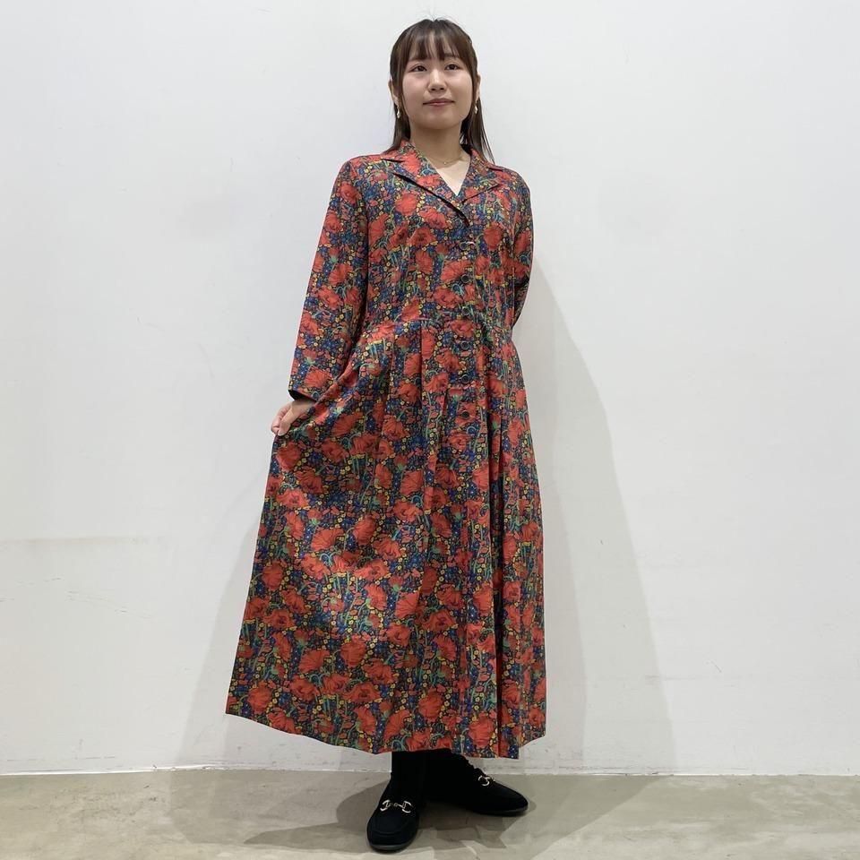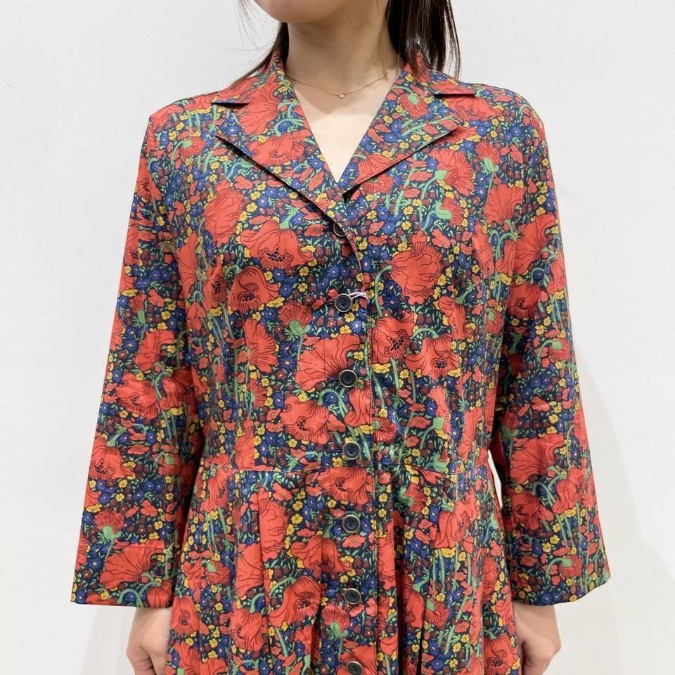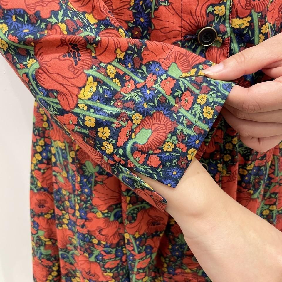 レトロな花柄と楽しいアニマル柄の個性的なリバティプリントのオープンカラードレス。