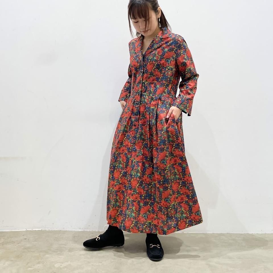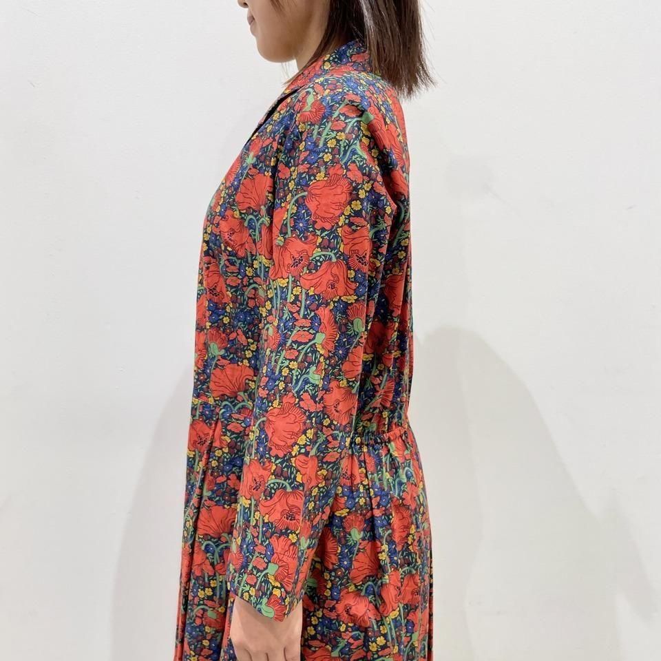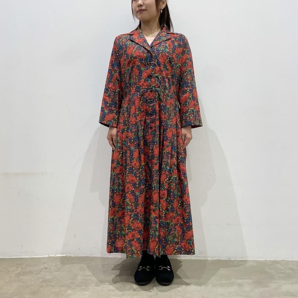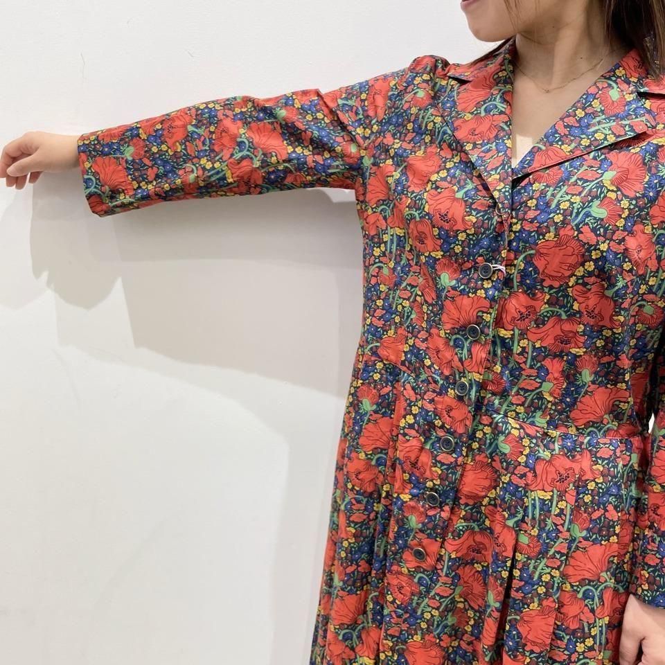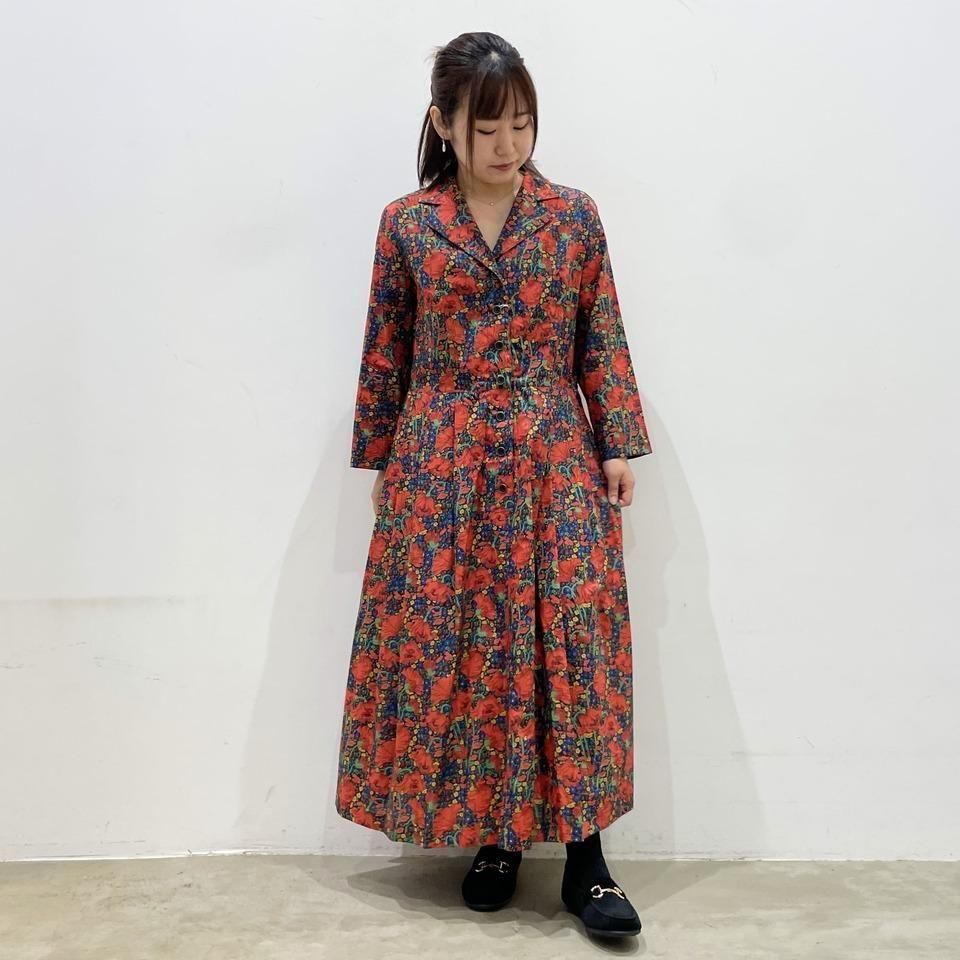 レトロな花柄と楽しいアニマル柄の個性的なリバティプリントのオープンカラードレス。