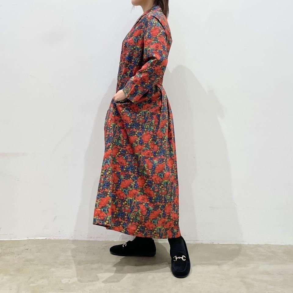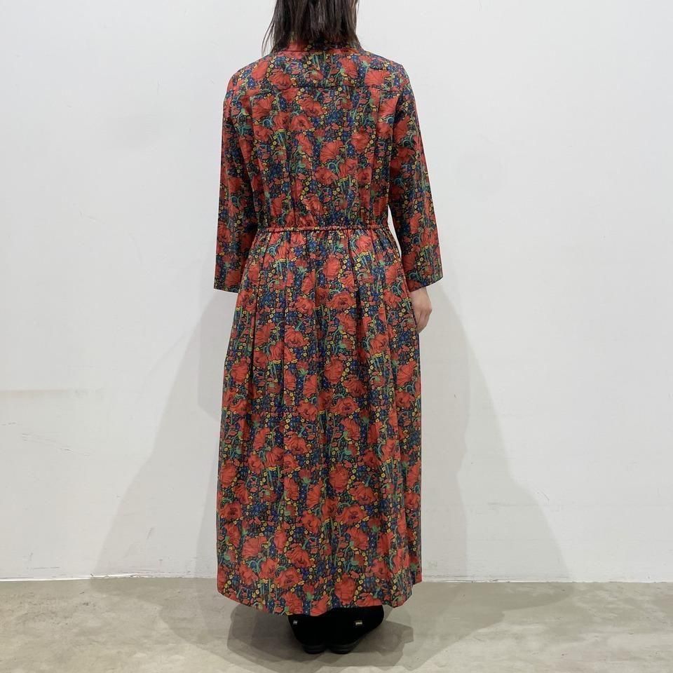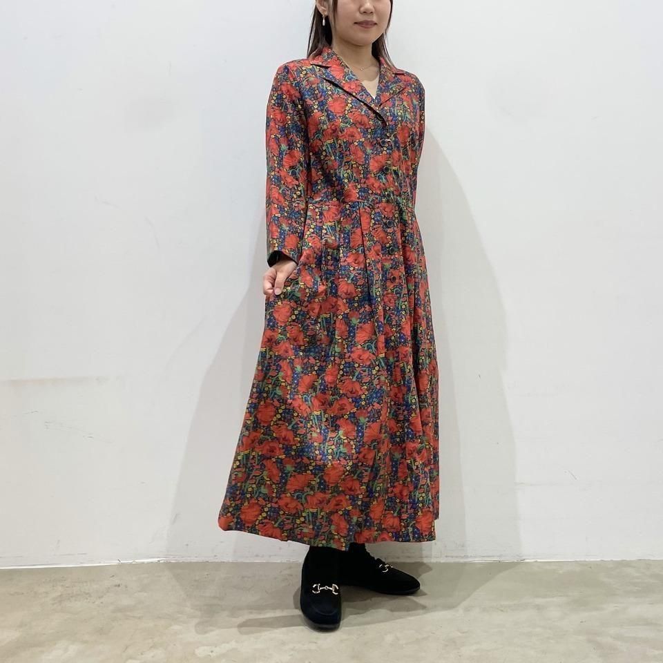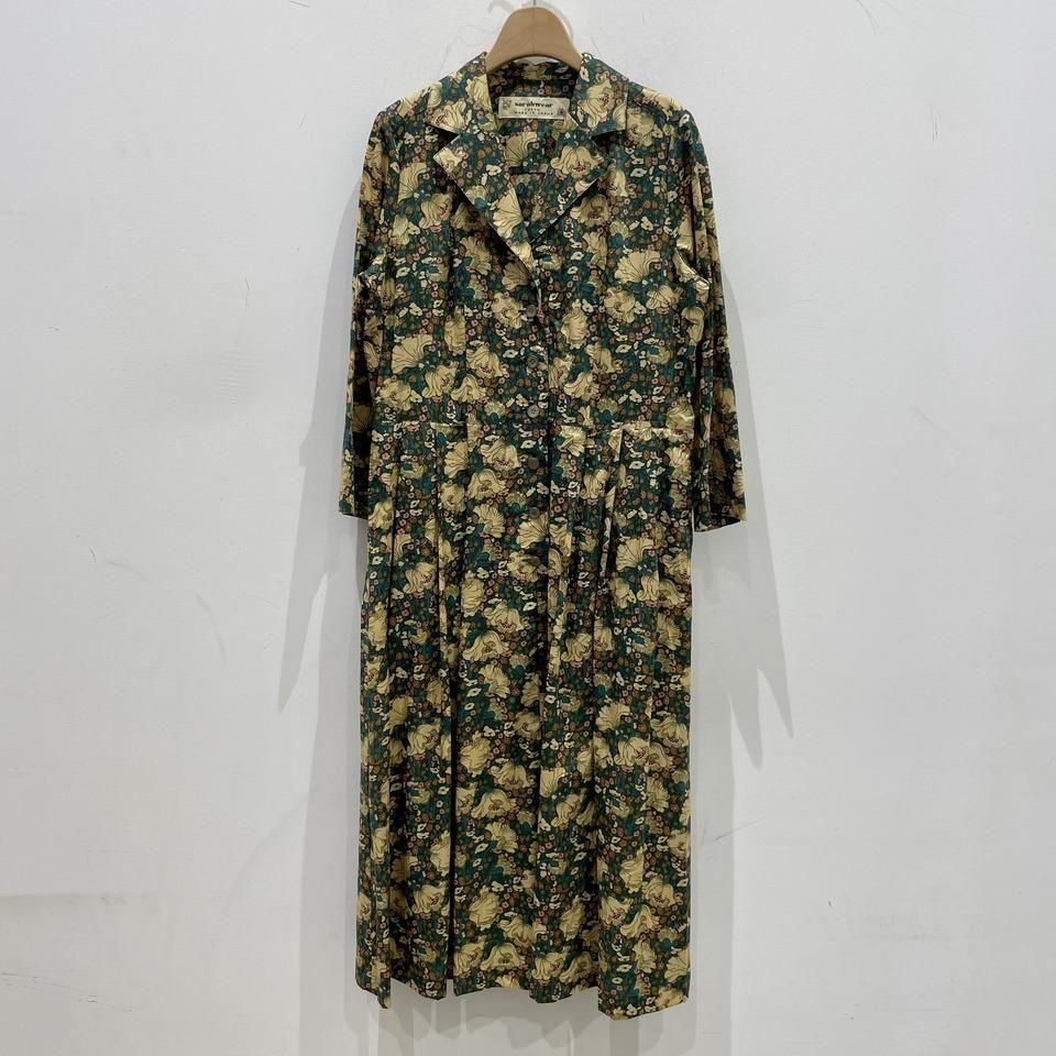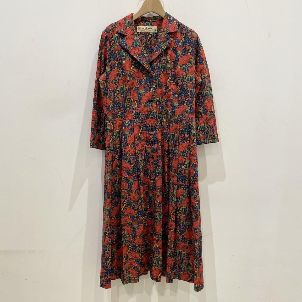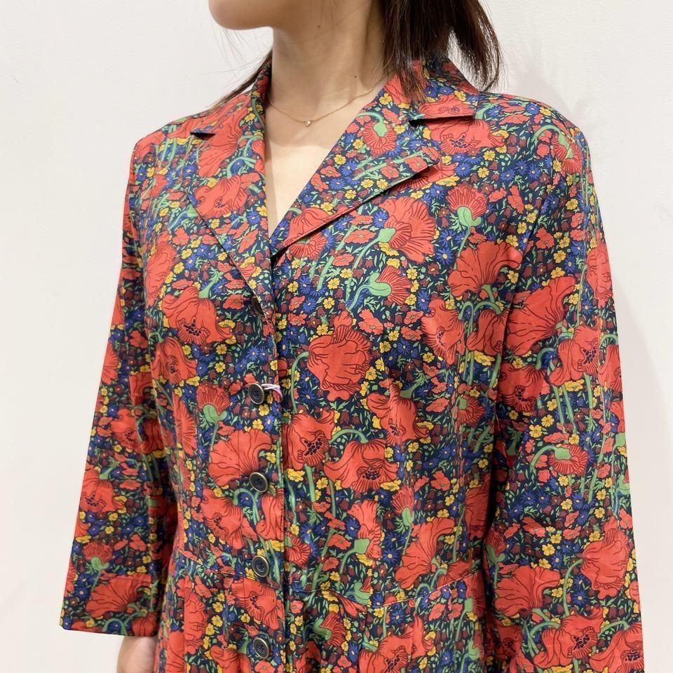 レトロな花柄と楽しいアニマル柄の個性的なリバティプリントのオープンカラードレス。