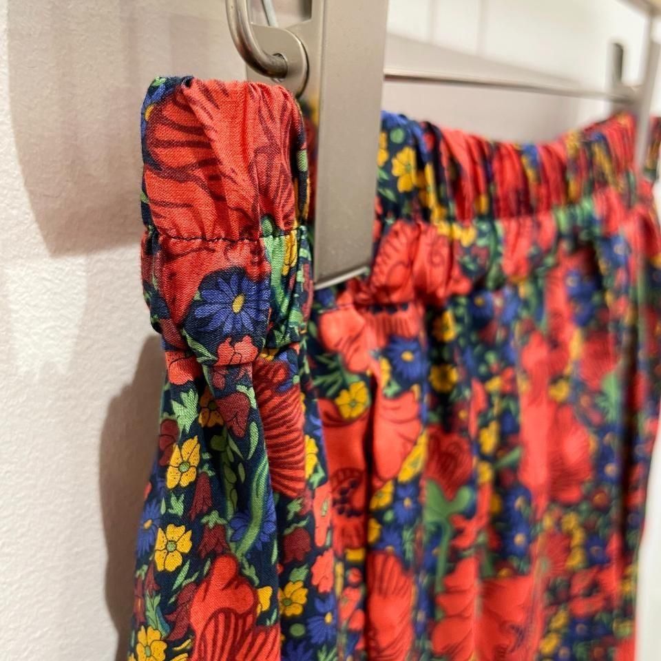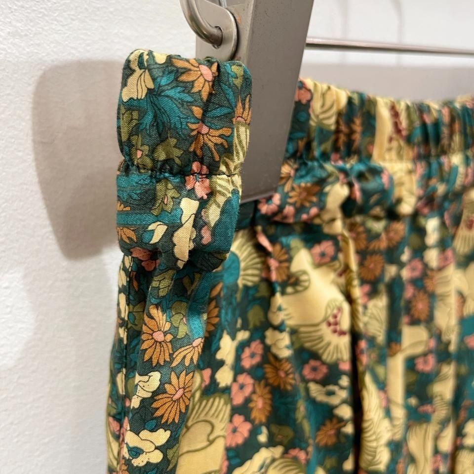 レトロな花柄のリバティプリントを使用し、前後3か所ずつボックスタックを施した