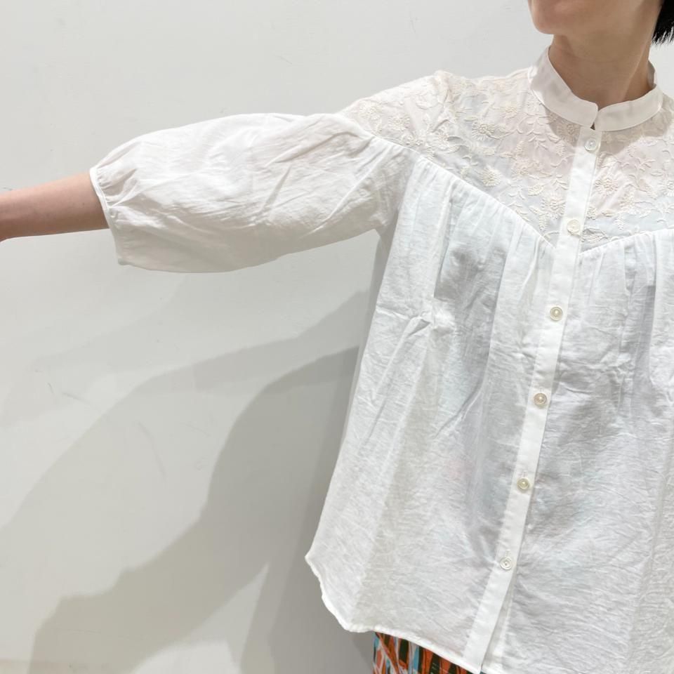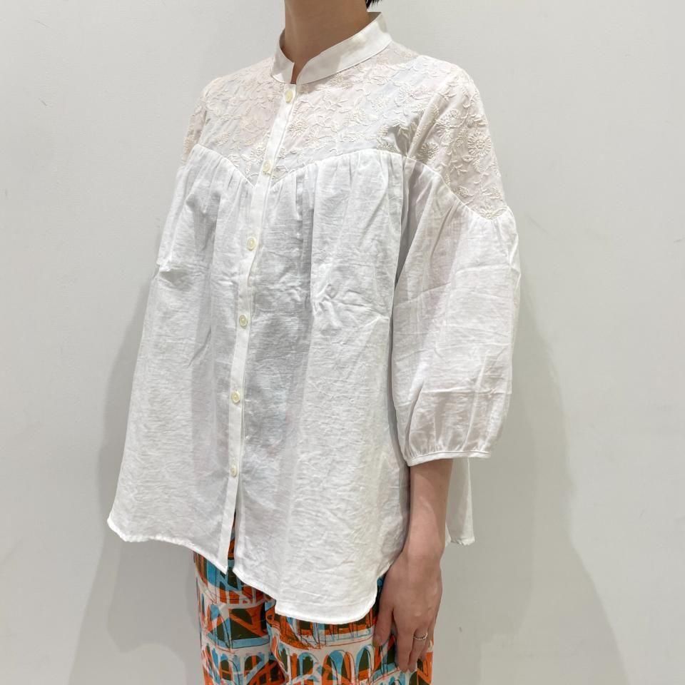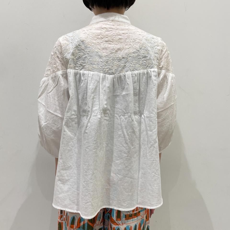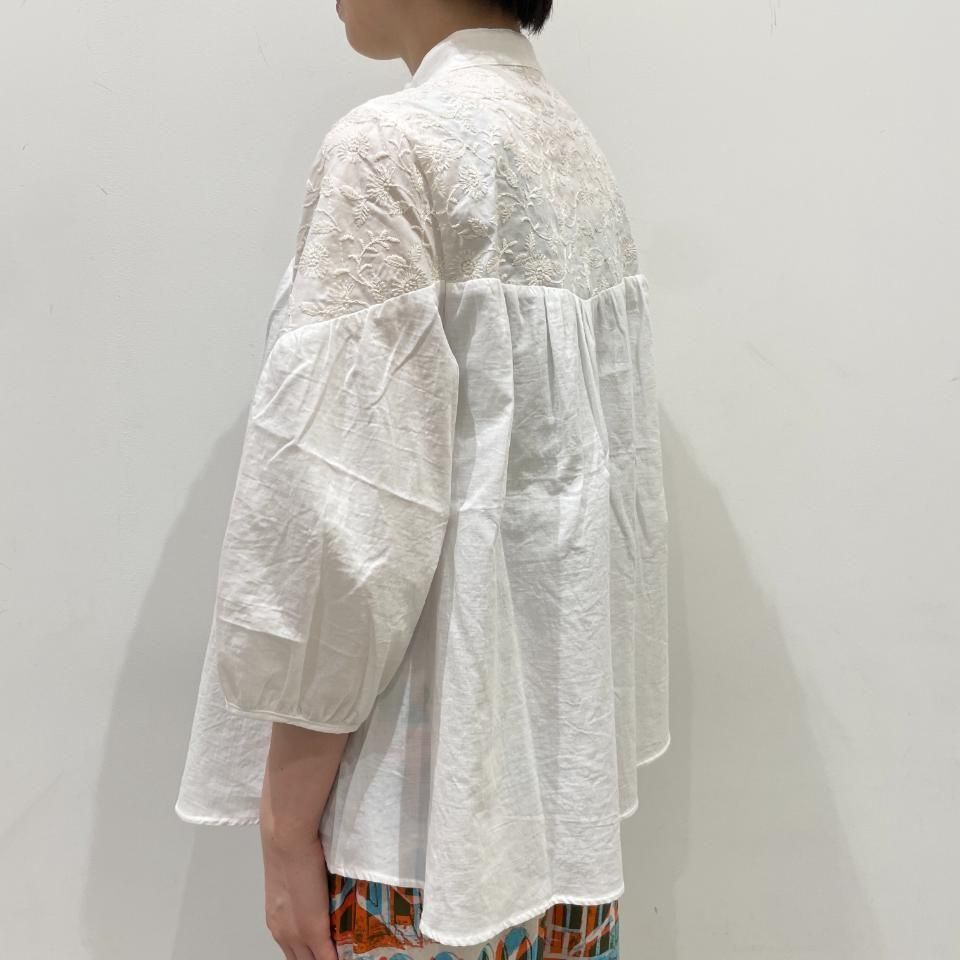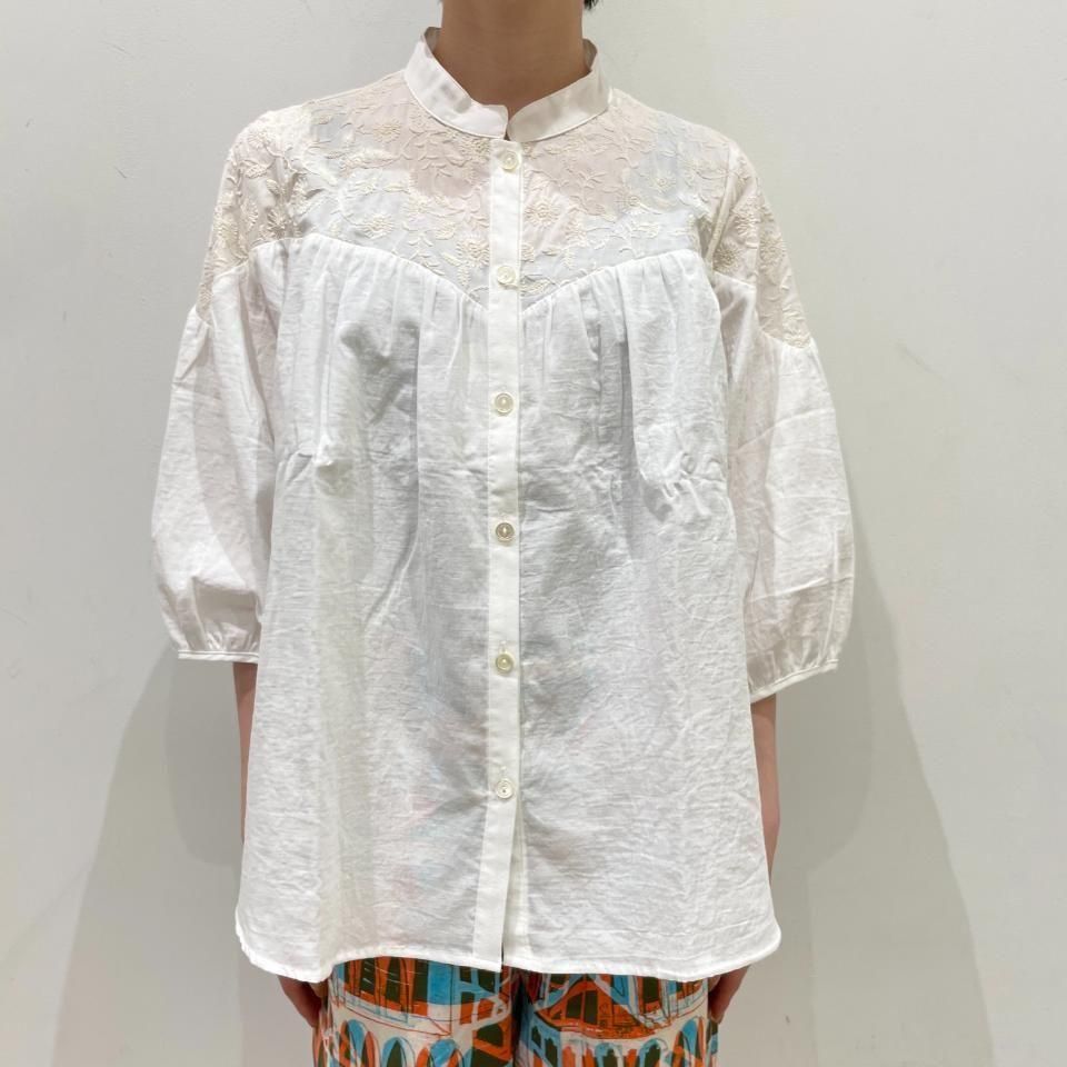 立体的な花柄刺繍生地とやわらかなガーゼ生地を組み合わせた七分袖のスモックブラウス【リリー】。