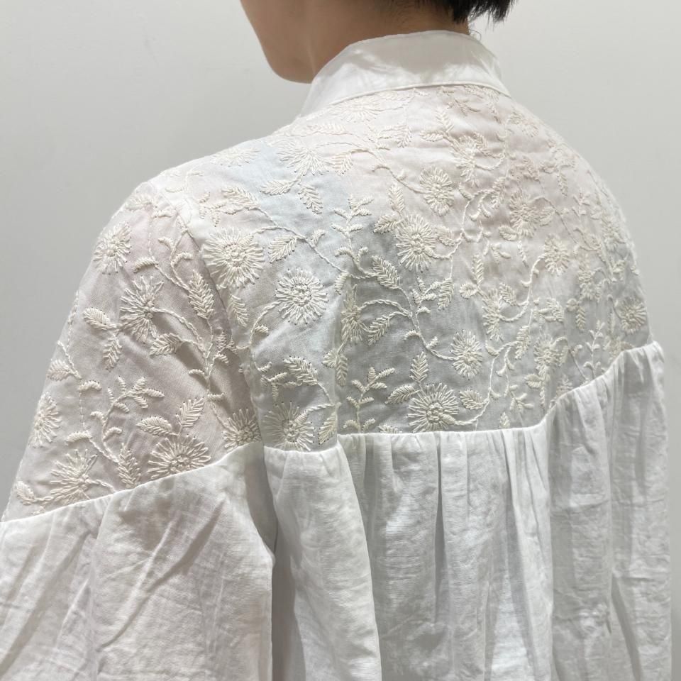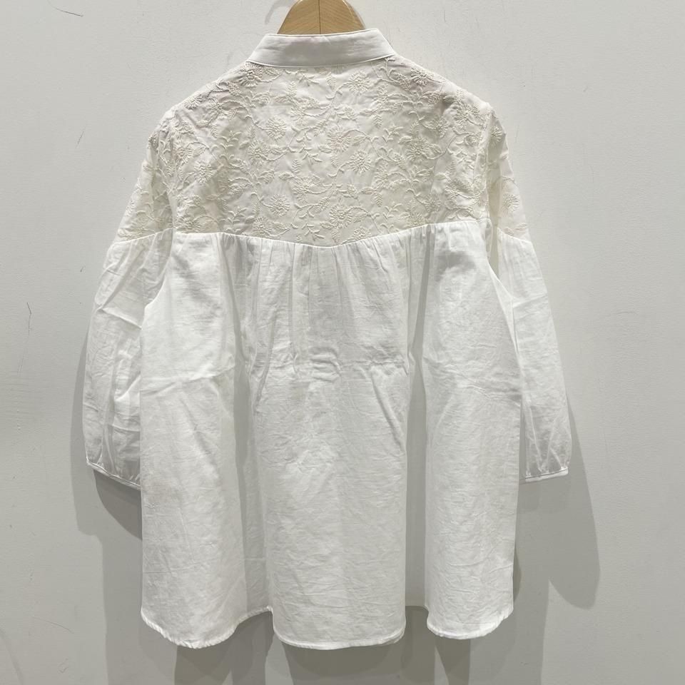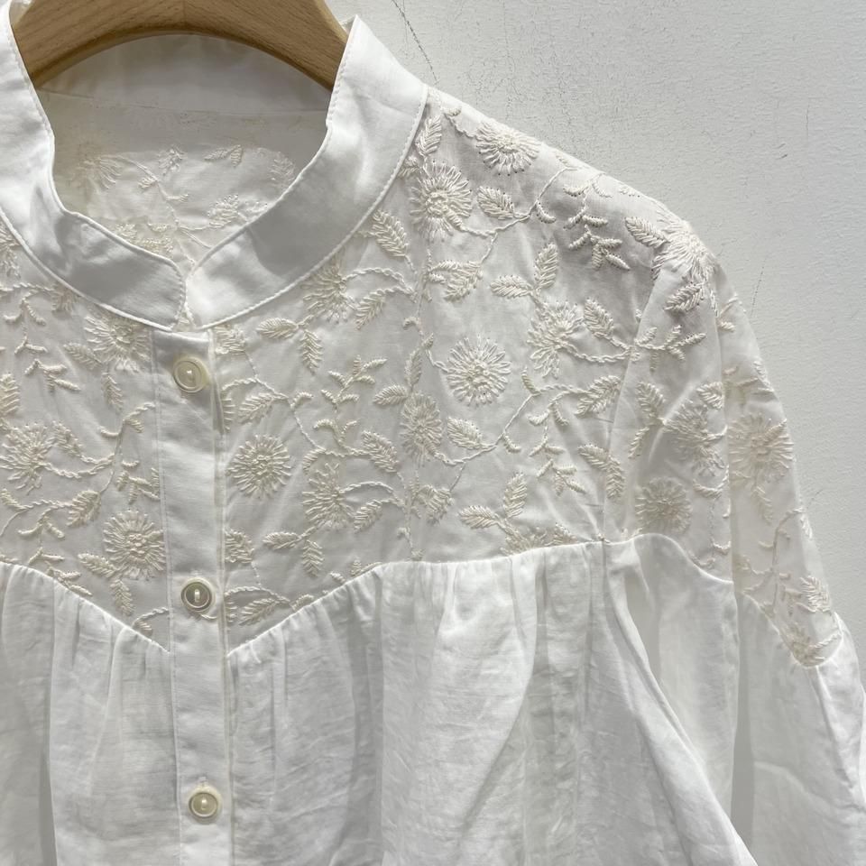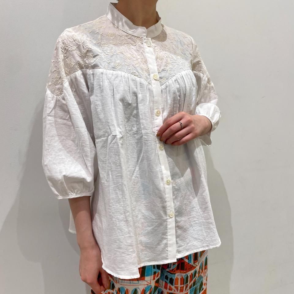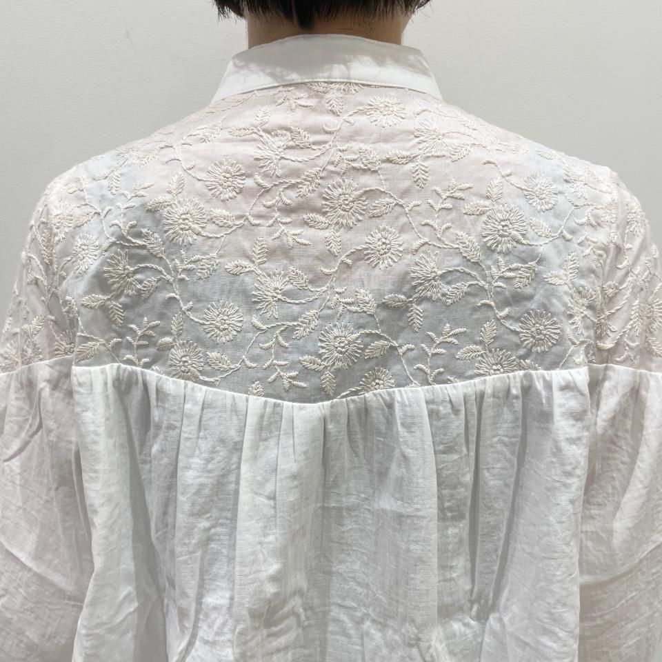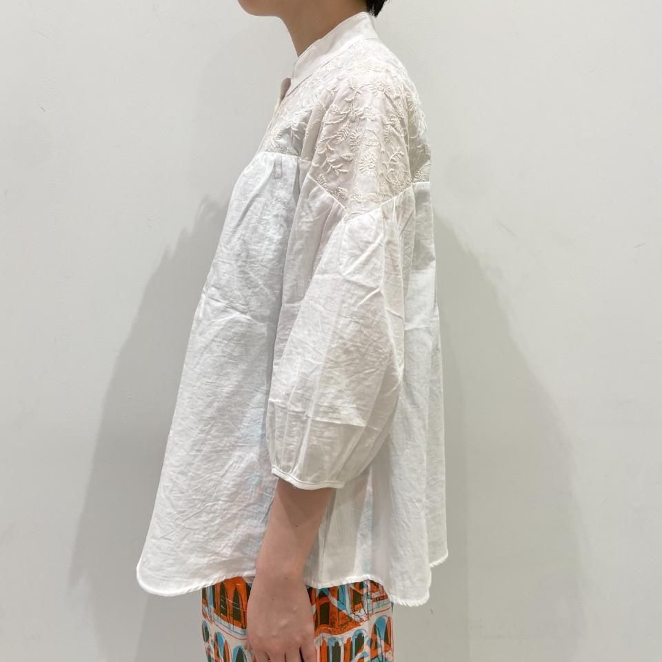 立体的な花柄刺繍生地とやわらかなガーゼ生地を組み合わせた七分袖のスモックブラウス【リリー】。