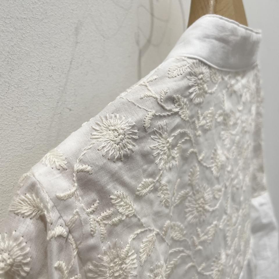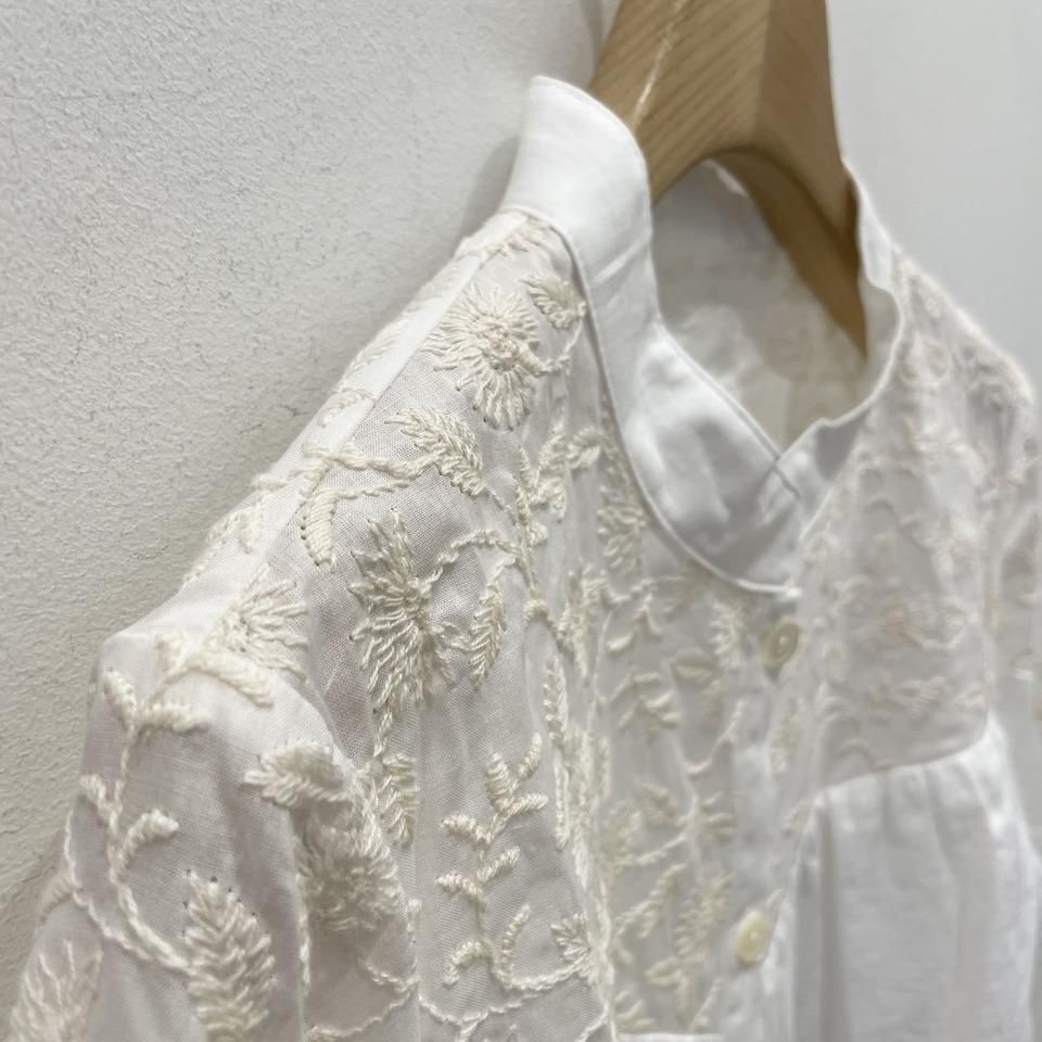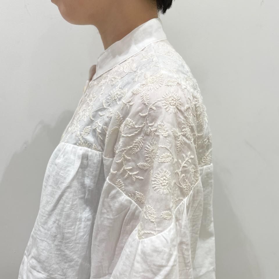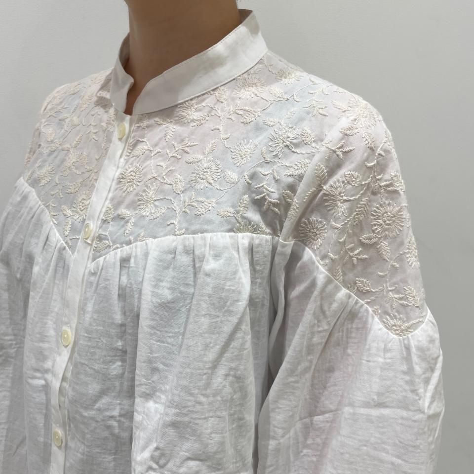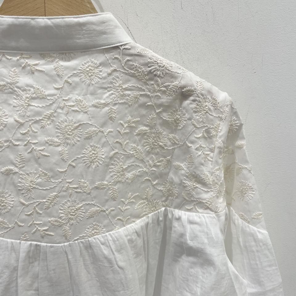 立体的な花柄刺繍生地とやわらかなガーゼ生地を組み合わせた七分袖のスモックブラウス【リリー】。
