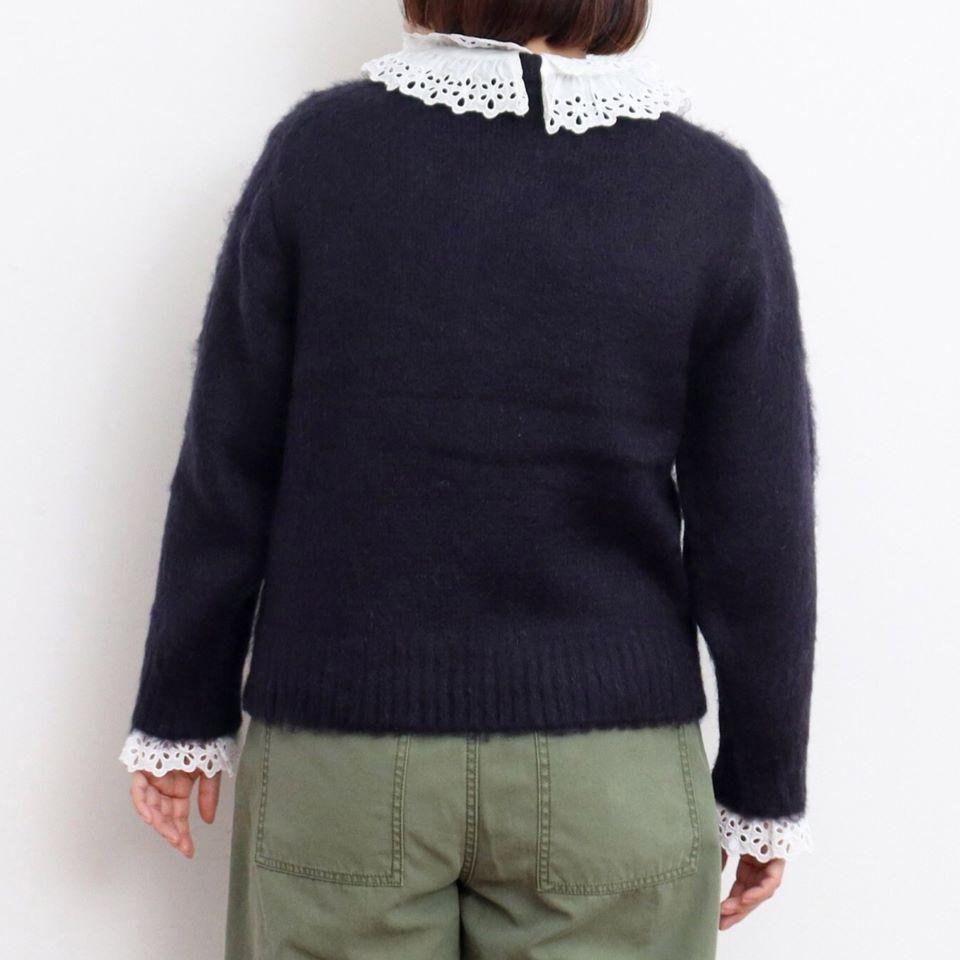 ・この製品にはモヘア混の糸を使用し、起毛をかけています。素材の特性上、摩擦により毛抜けや毛玉が発生しやすいです。連続着用を避け、ブラッシングして整えるようお願いします。