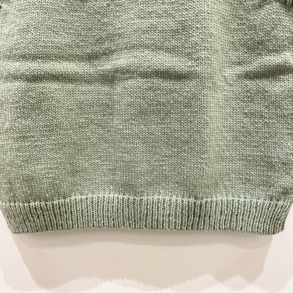 優しい編地と襟ぐり、袖ぐりの変形リブ編みで、ポケットの無いシンプルなベストです。