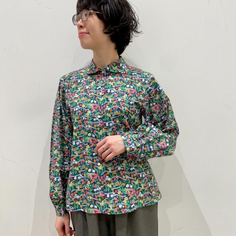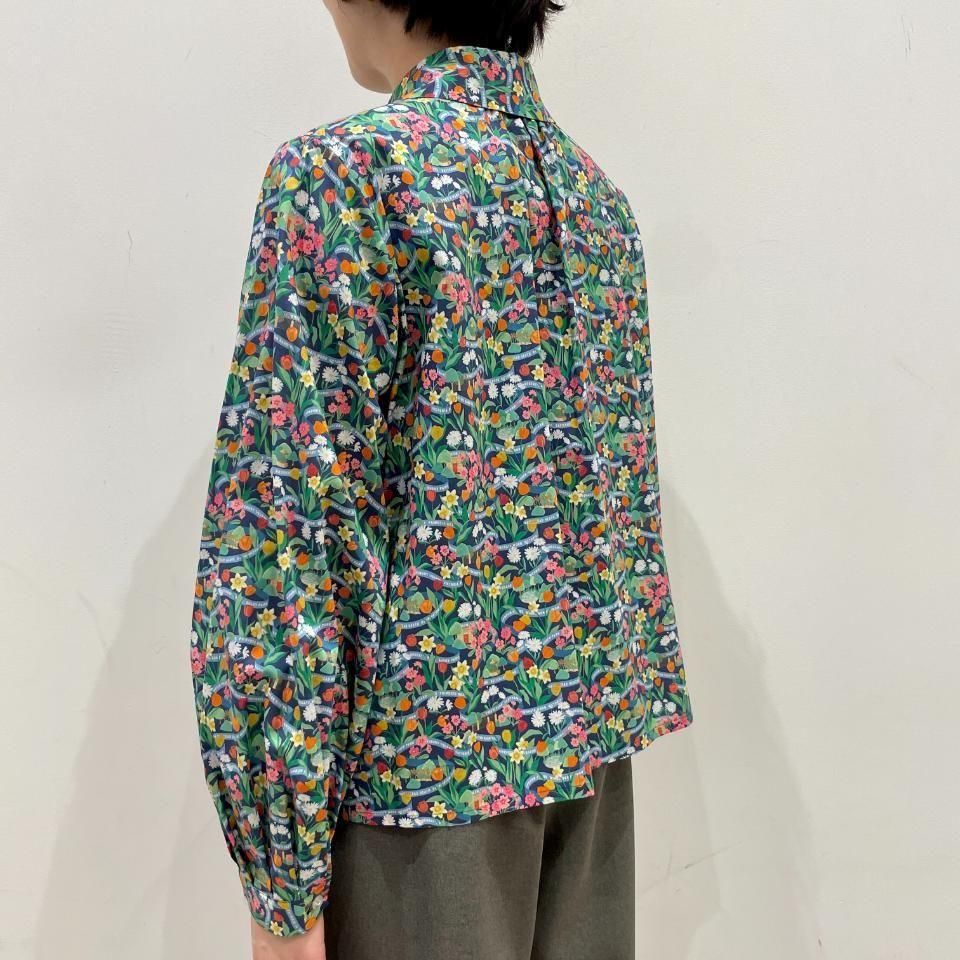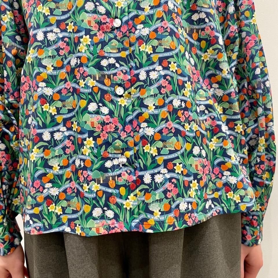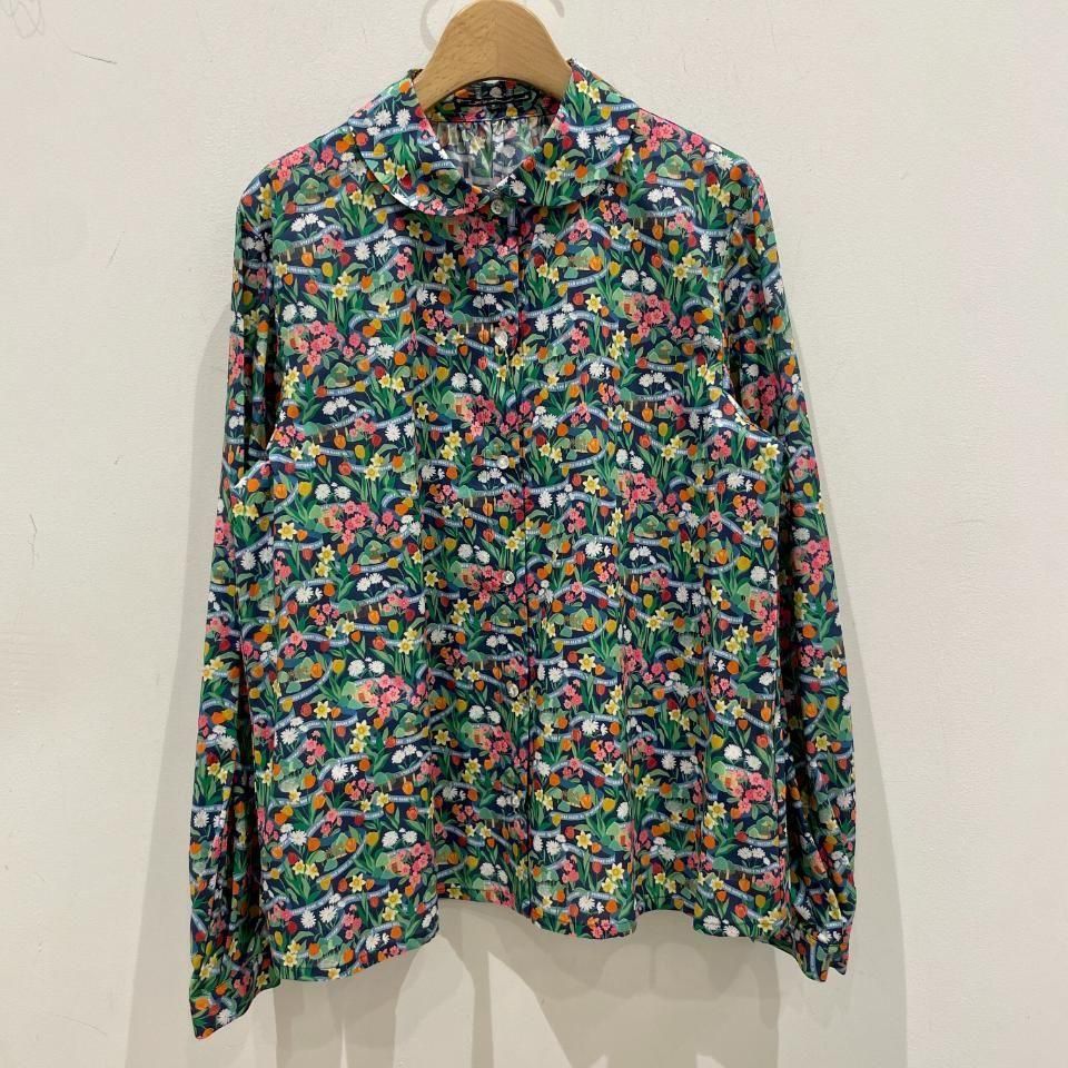ラウンドカラーにボリュームスリーブが特徴のリバティプリントのブラウス。