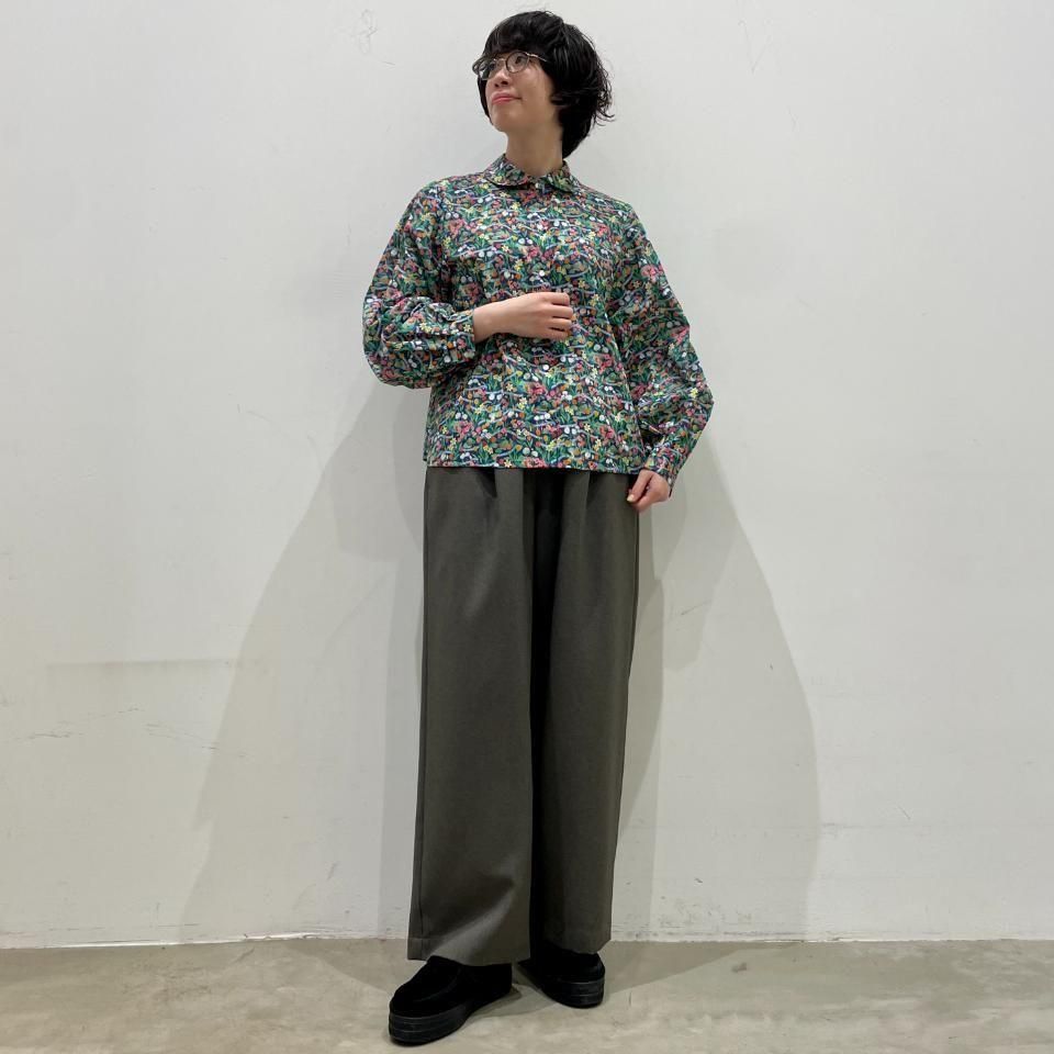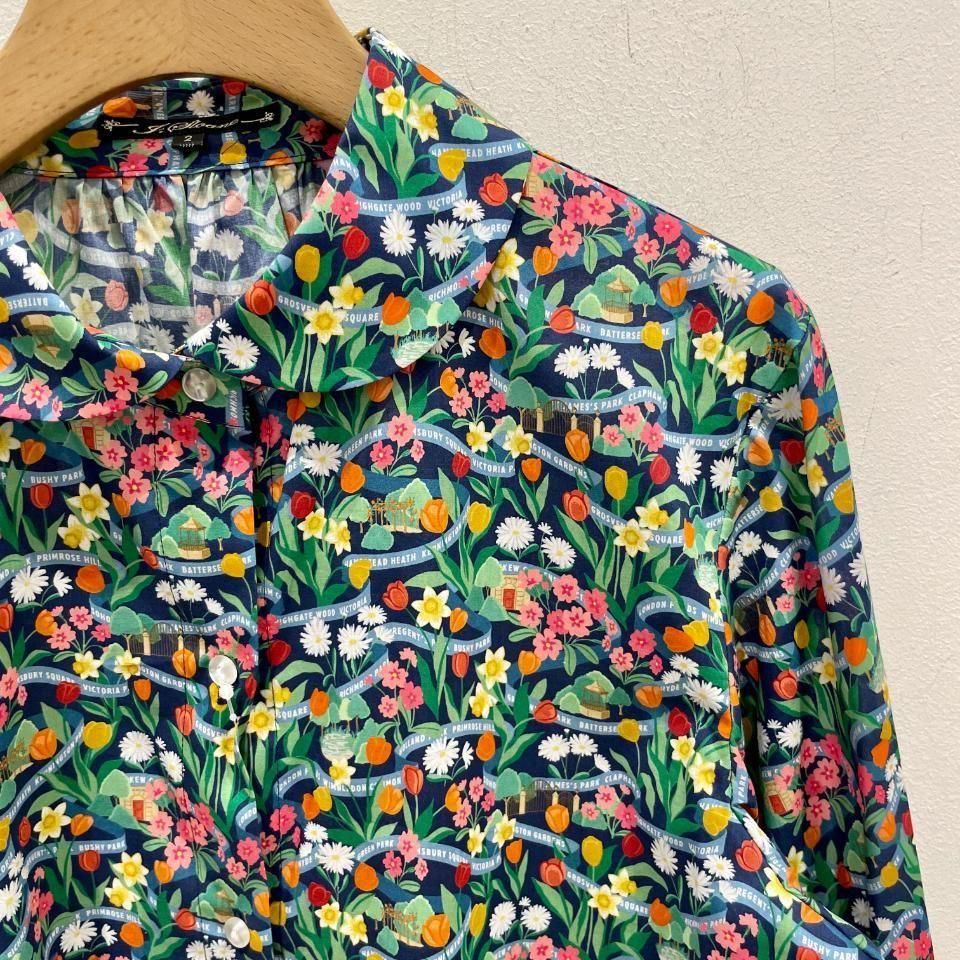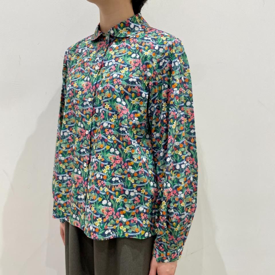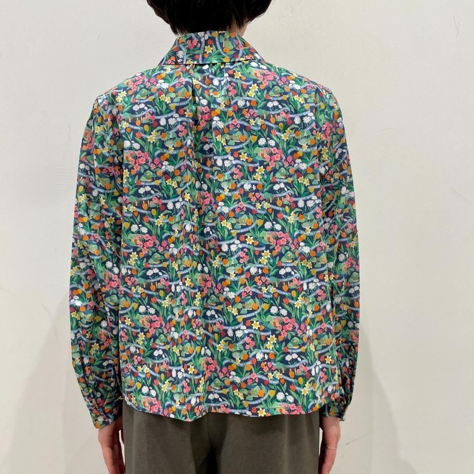 ラウンドカラーにボリュームスリーブが特徴のリバティプリントのブラウス。