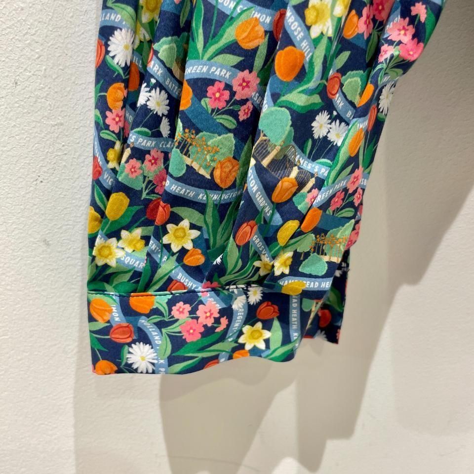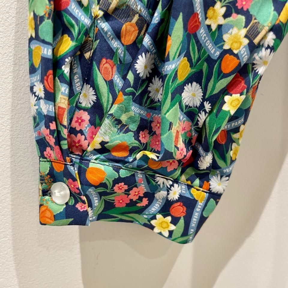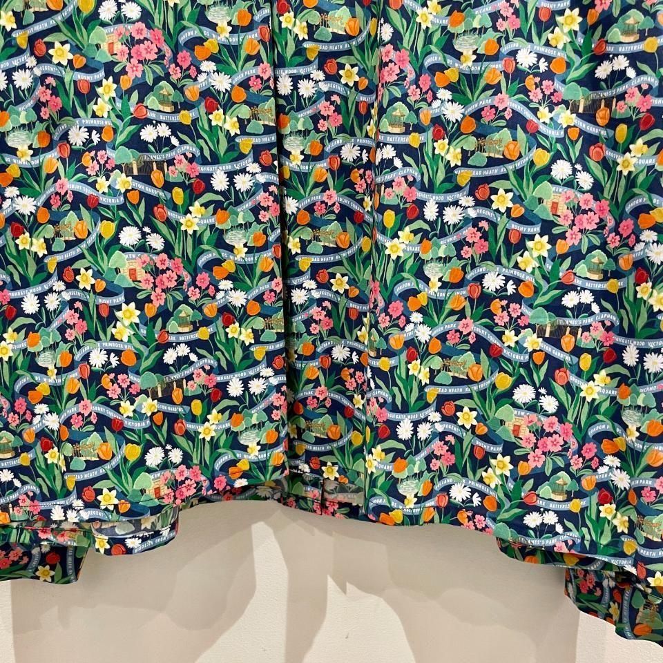 ロンドンの公園は春になると、色とりどりのチューリップ、ダフォディル、プリムローズ、デイジーが花壇や広場を彩り、街全体が鮮やかな色に包まれます。このデザインは、ガッシュで丹念に手描きされ、豊かな色彩が感じられます。花々の間には小さなシーンが隠れ、まるで道のようにデザインの中を織りなすリボンが、ロンドンの多くの緑地の名前をさりげなく表現しています。