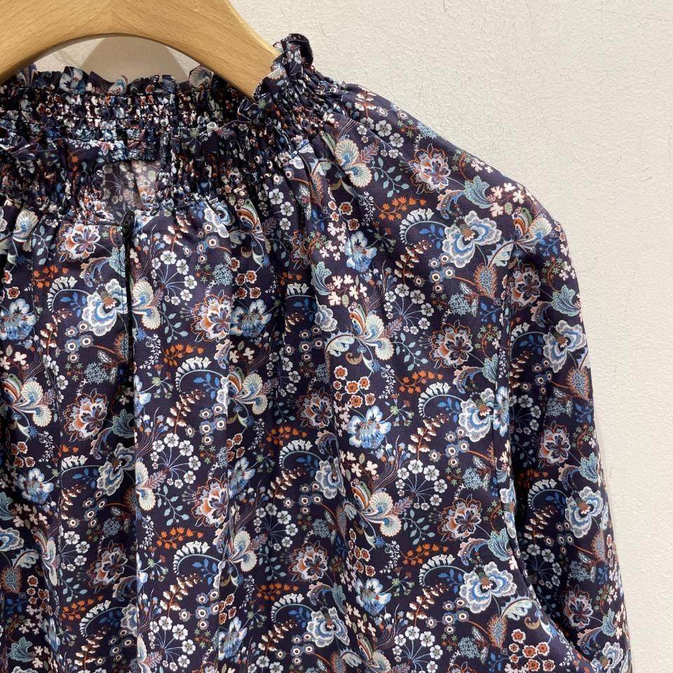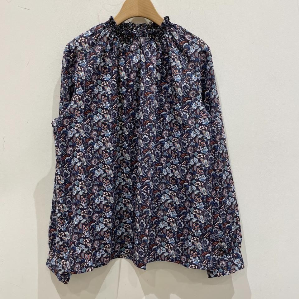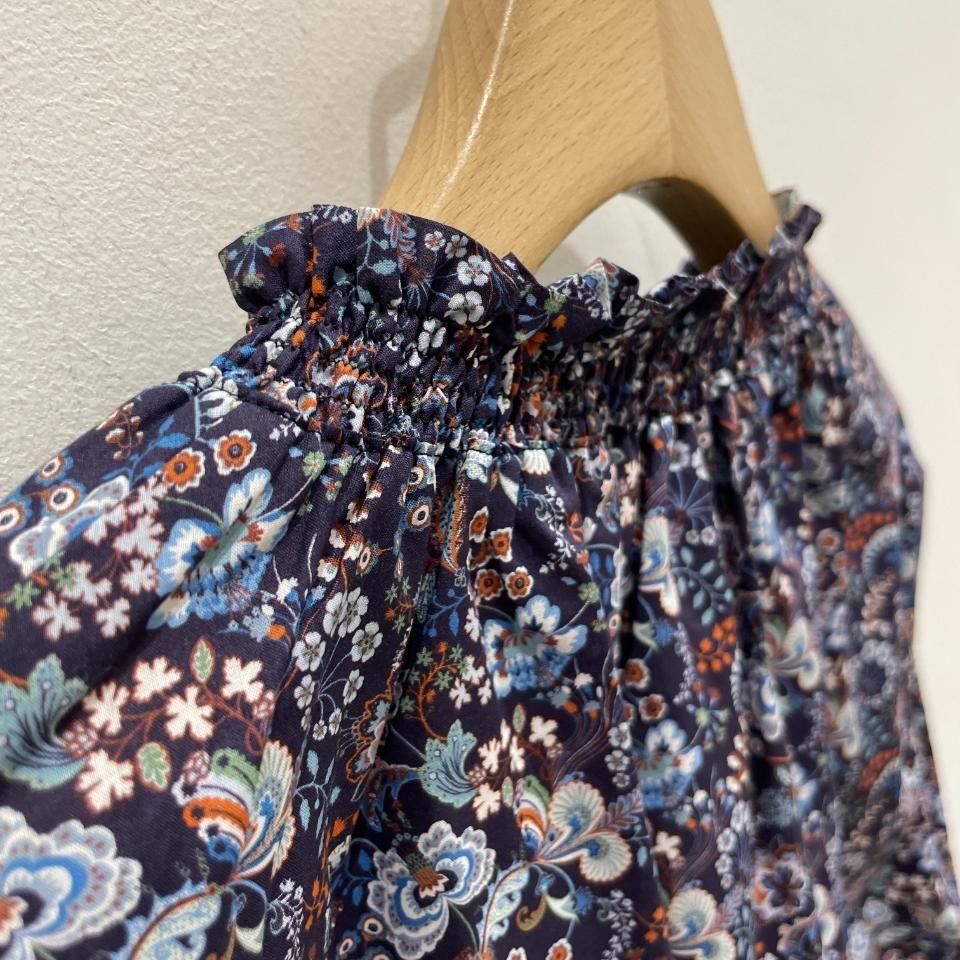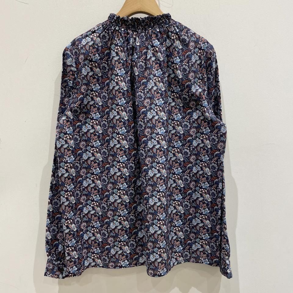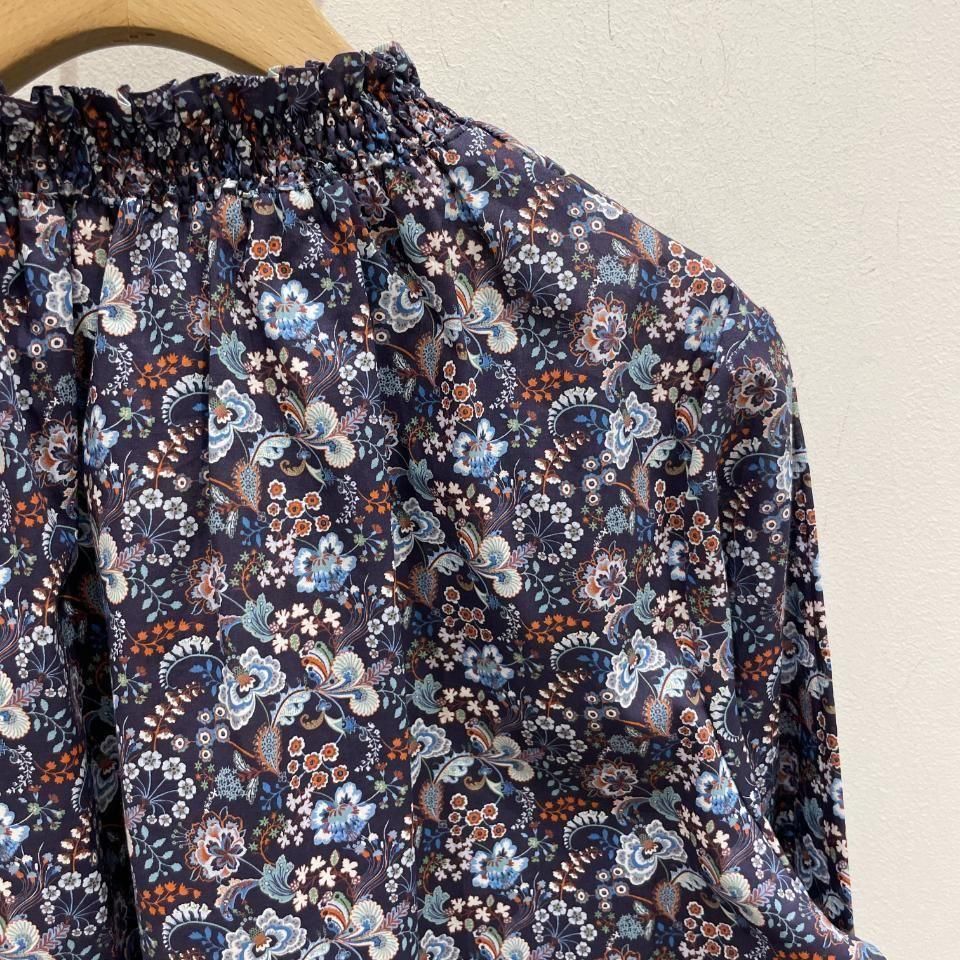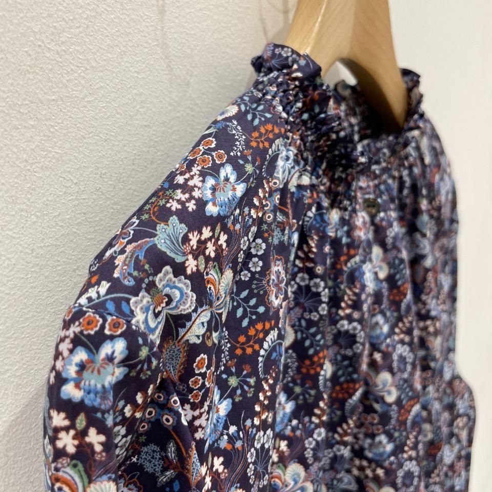 リバティプリントの襟シャーリング 前スリット開きブラウス。