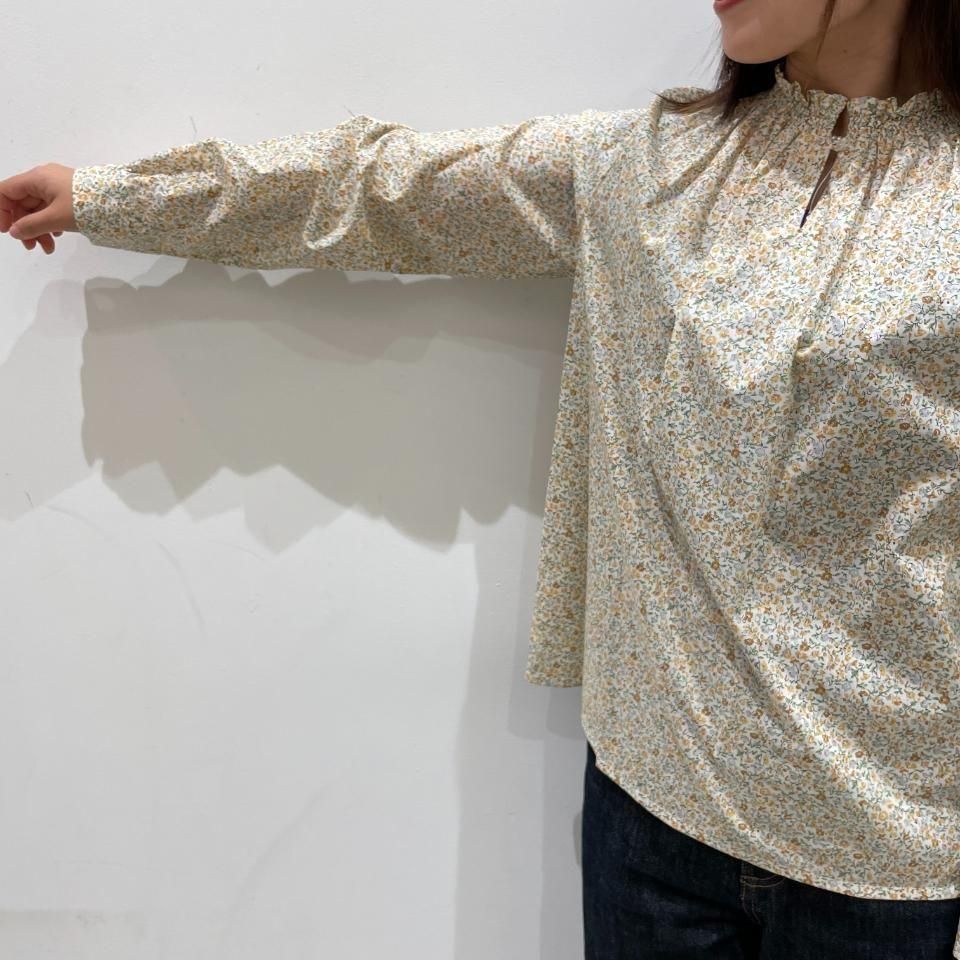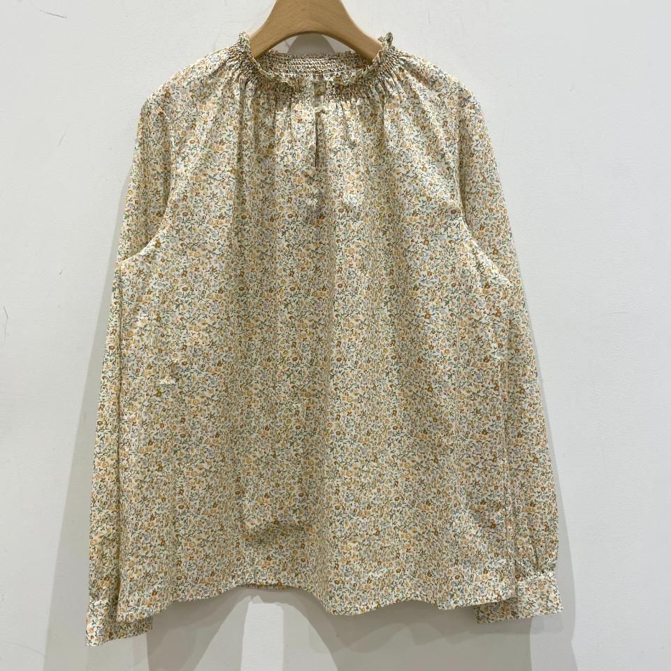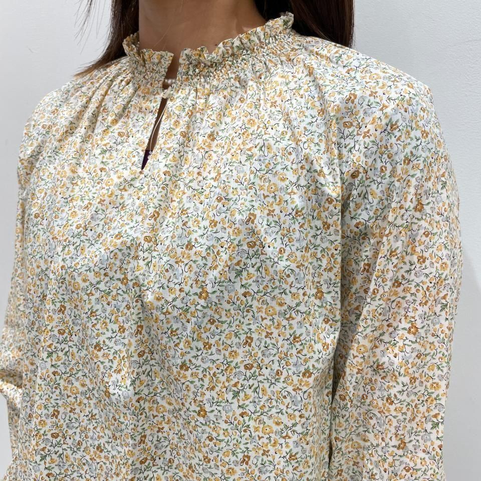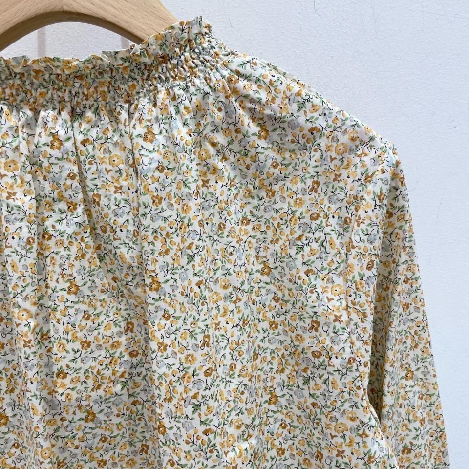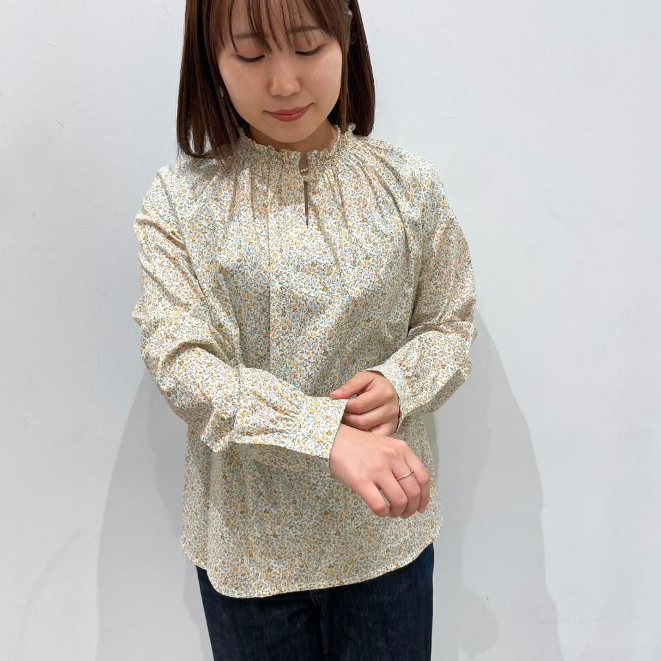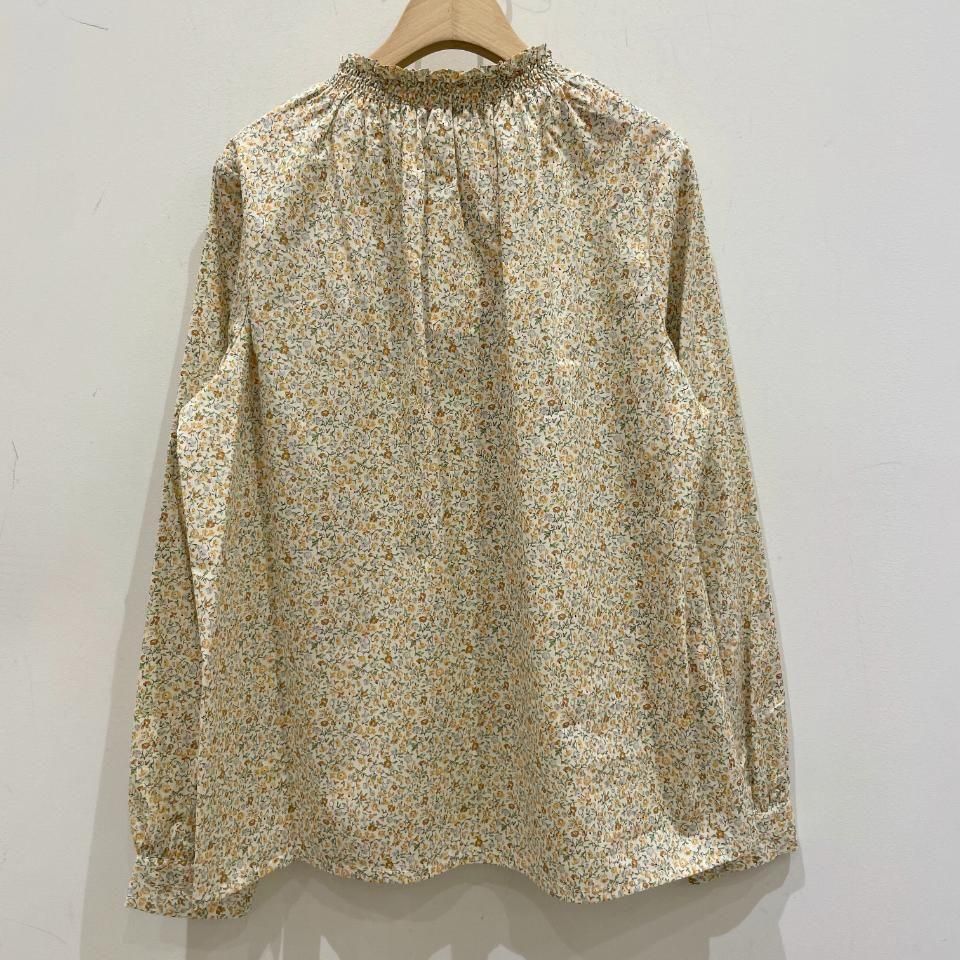 リバティプリントの襟シャーリング 前スリット開きブラウス。