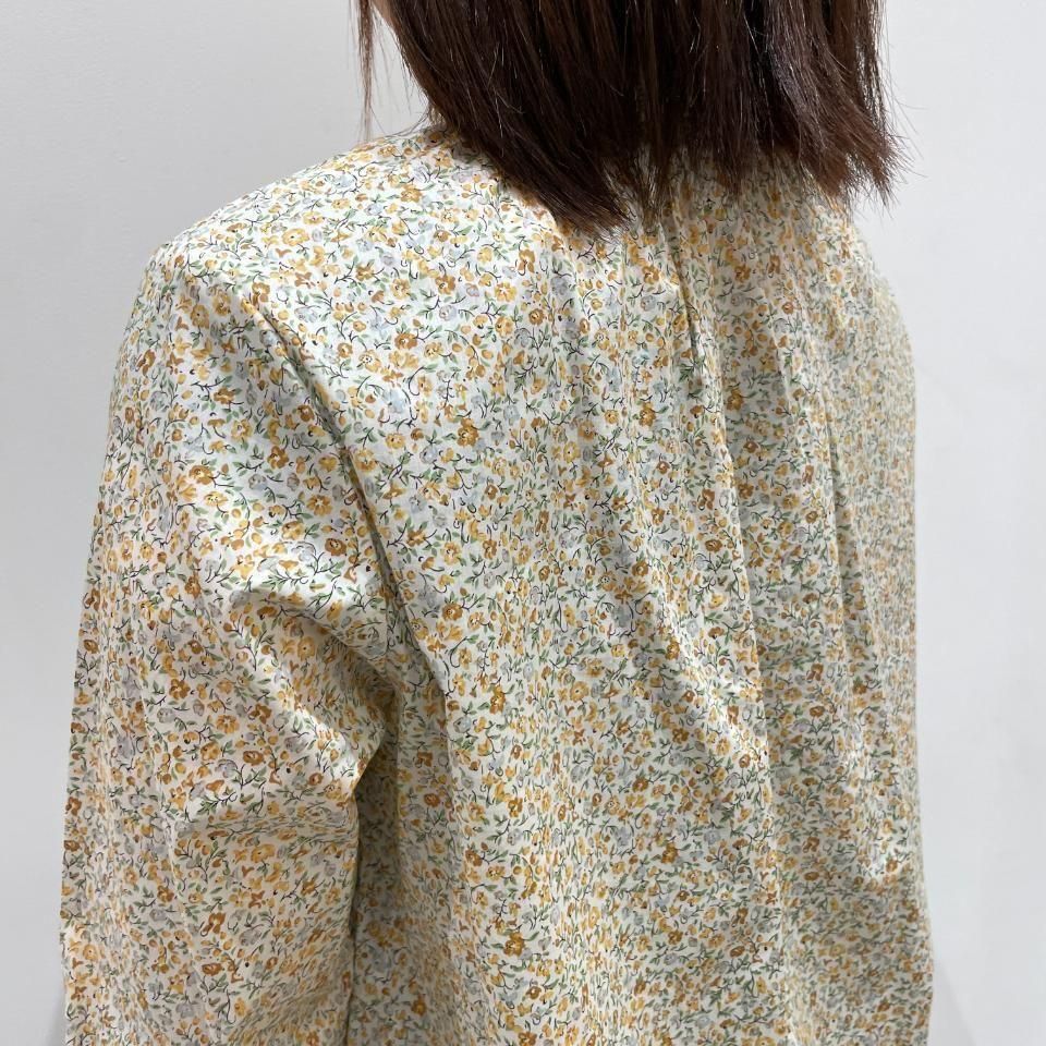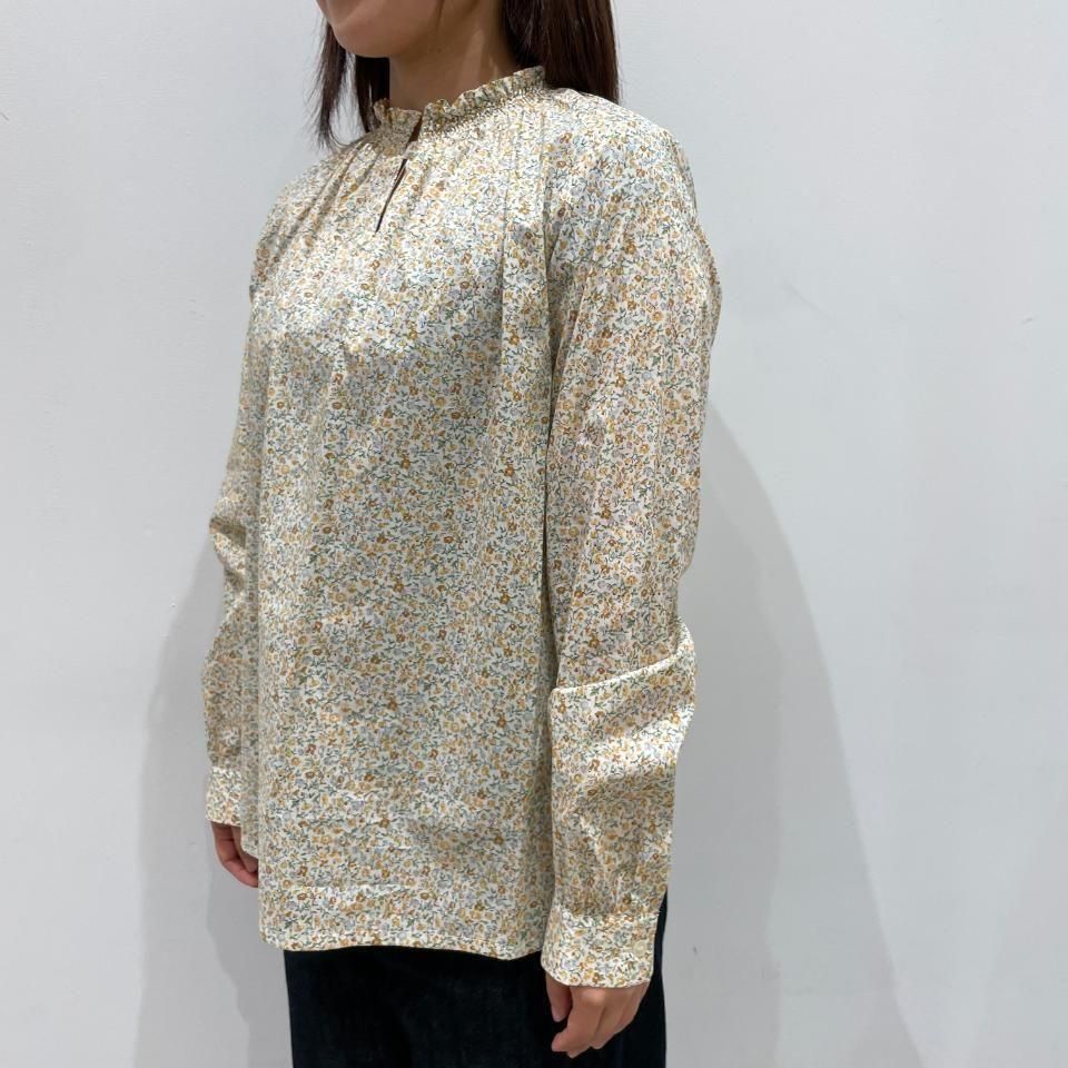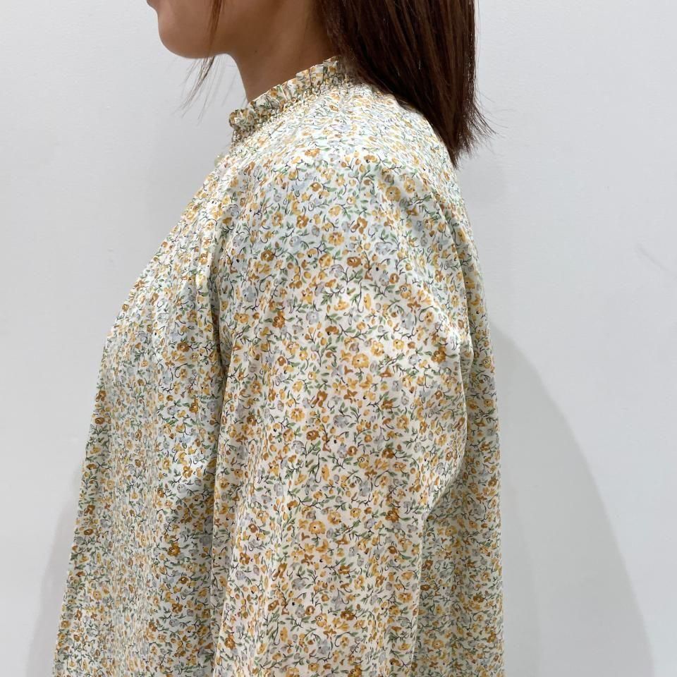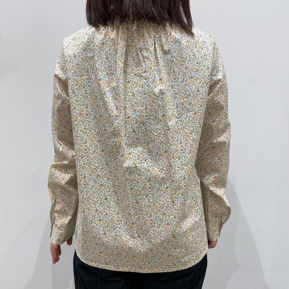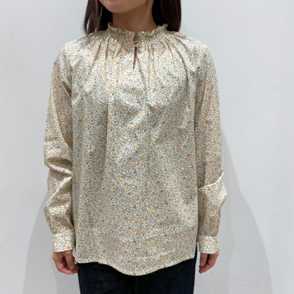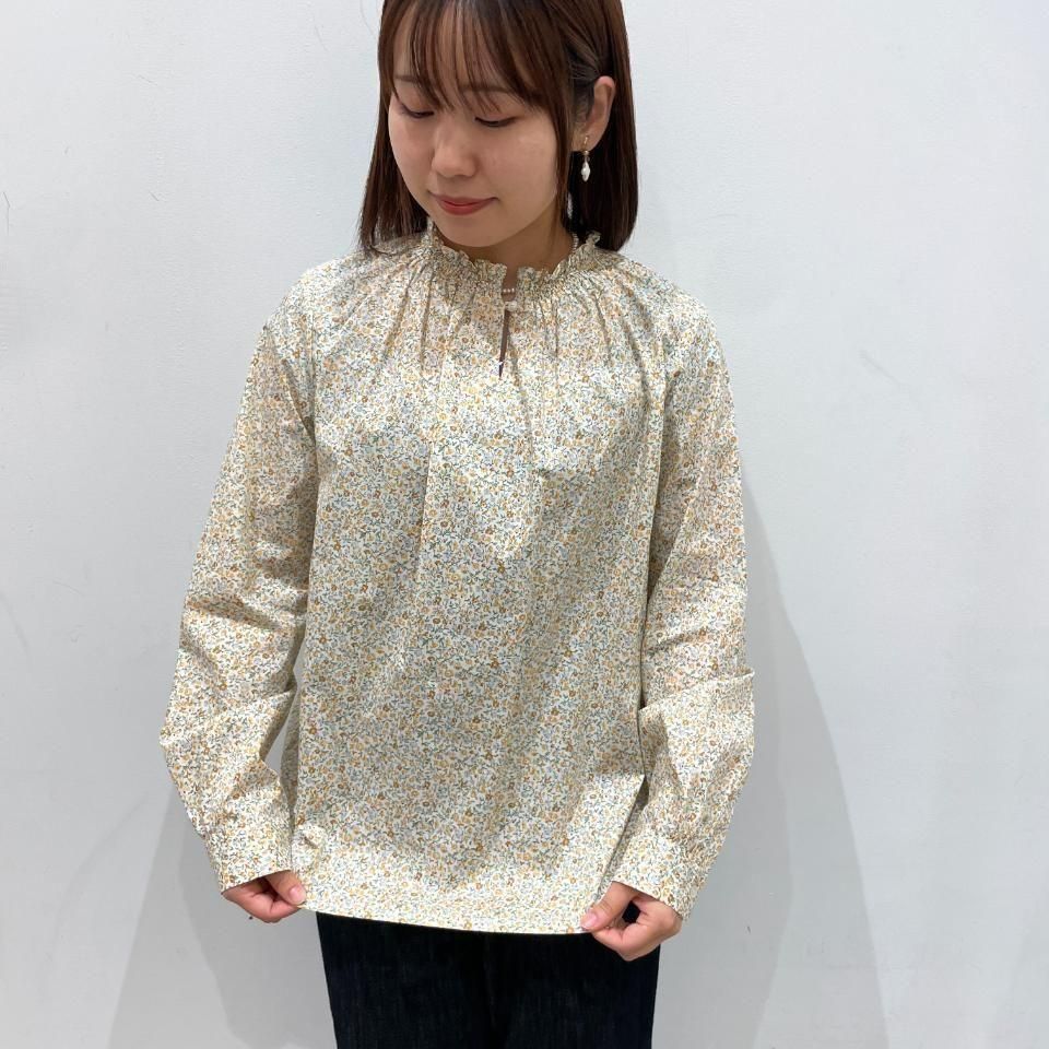 リバティプリントの襟シャーリング 前スリット開きブラウス。
