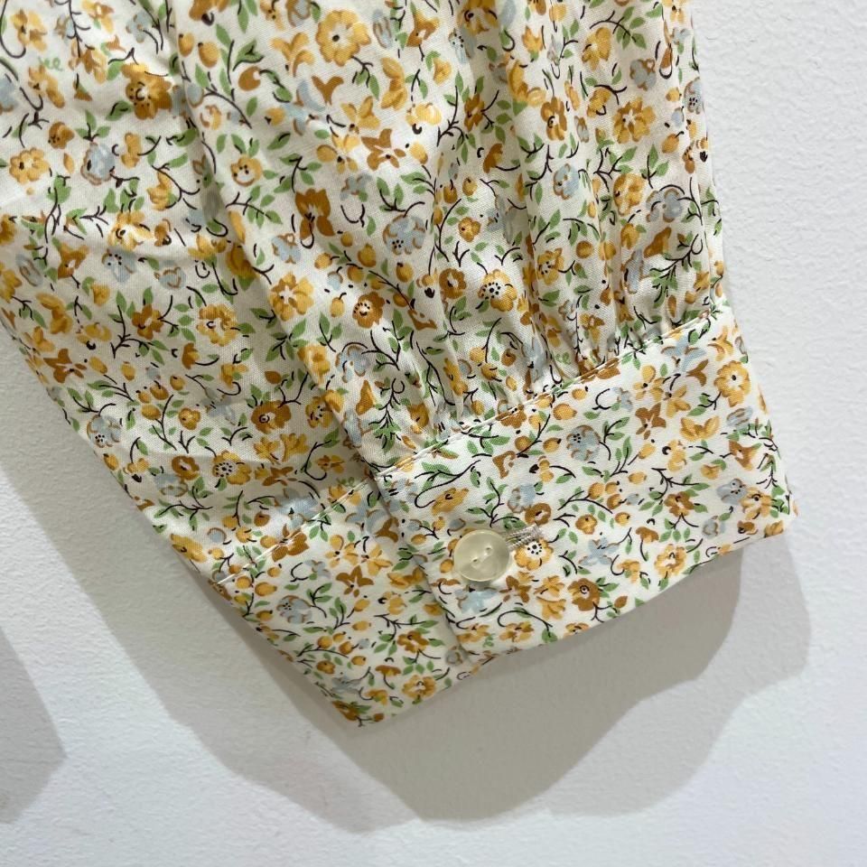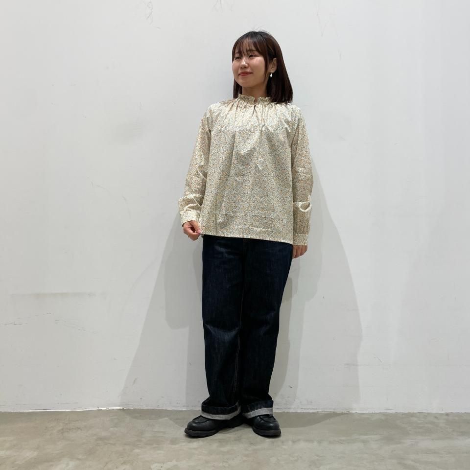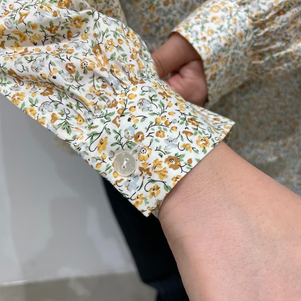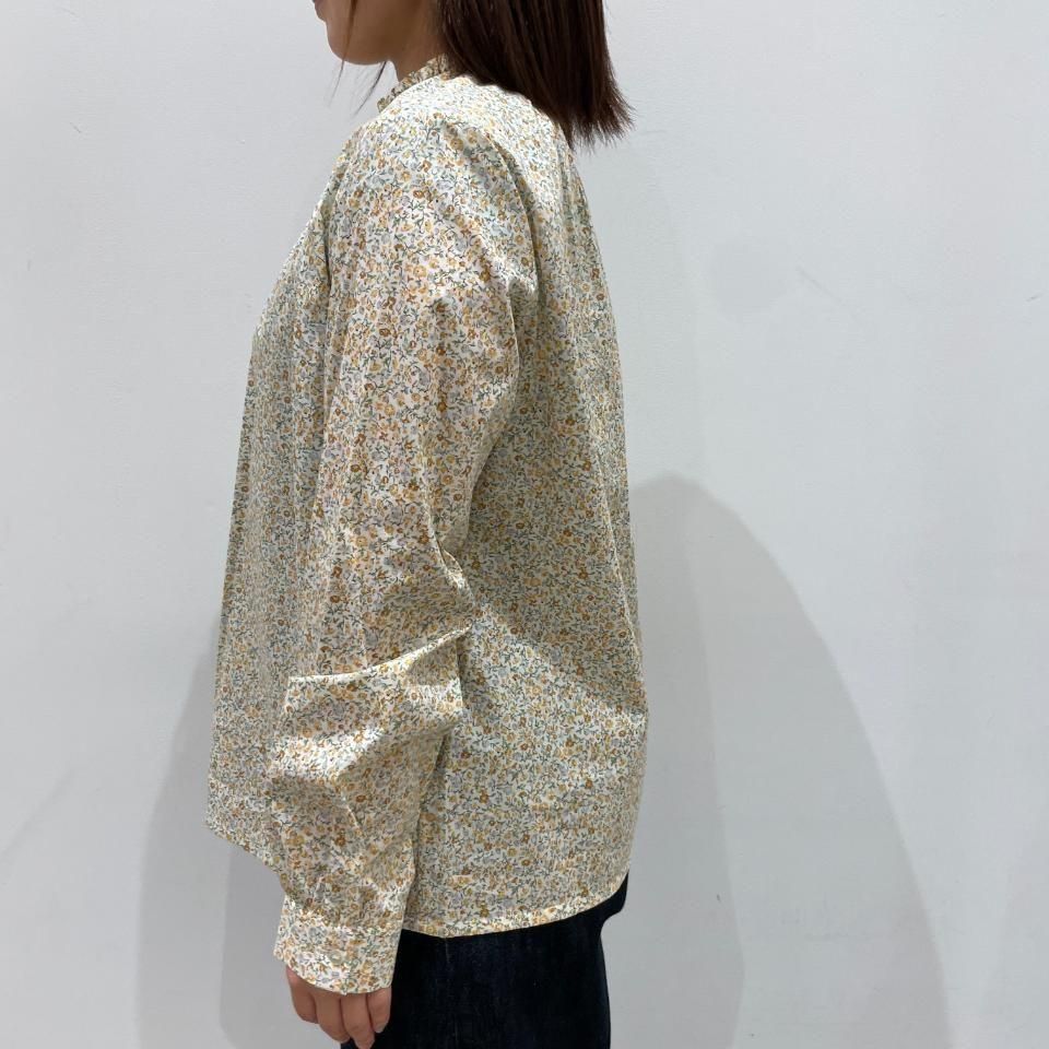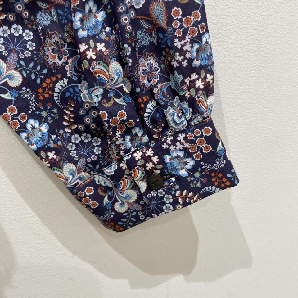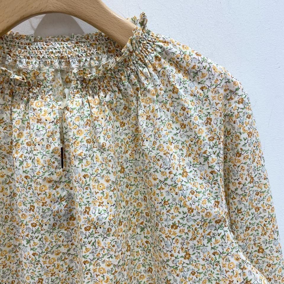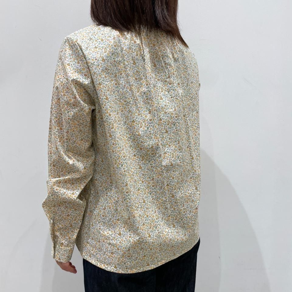 リバティプリントの襟シャーリング 前スリット開きブラウス。