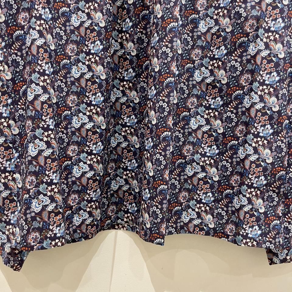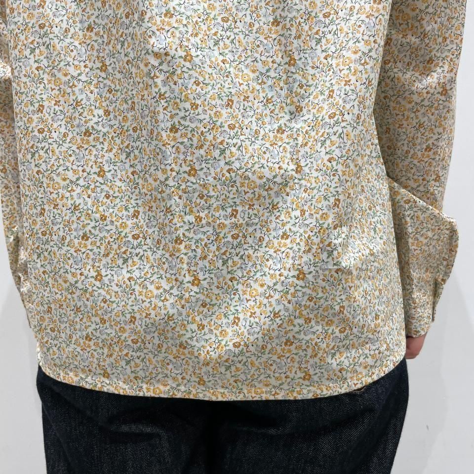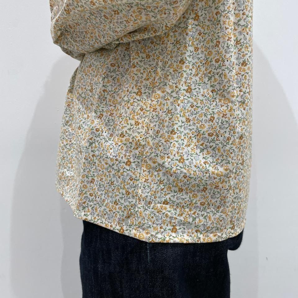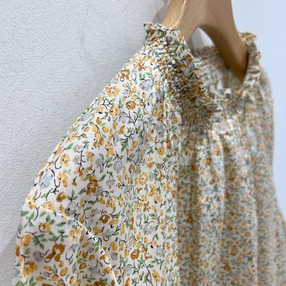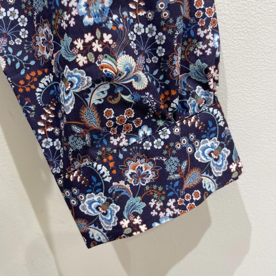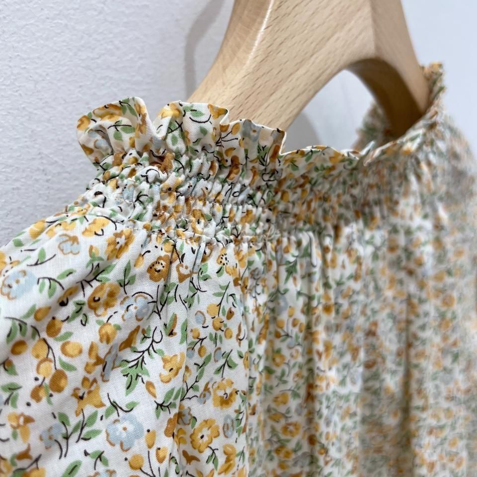リバティプリントの襟シャーリング 前スリット開きブラウス。