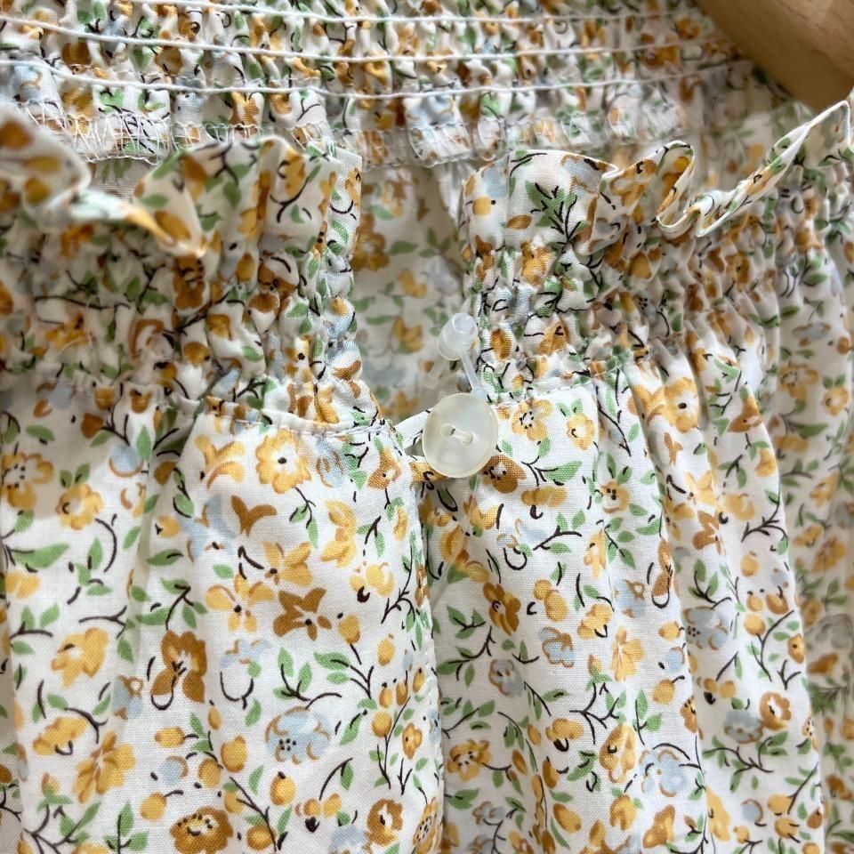 首元は中に柔らかなゴムを通したシャーリングフリル仕立てで、大人の女性に合う上品な甘さをプラスします♪