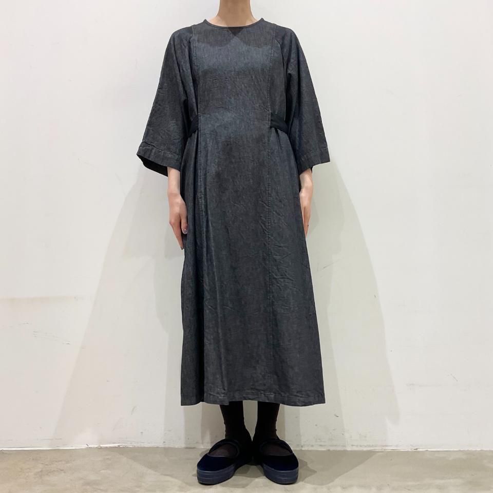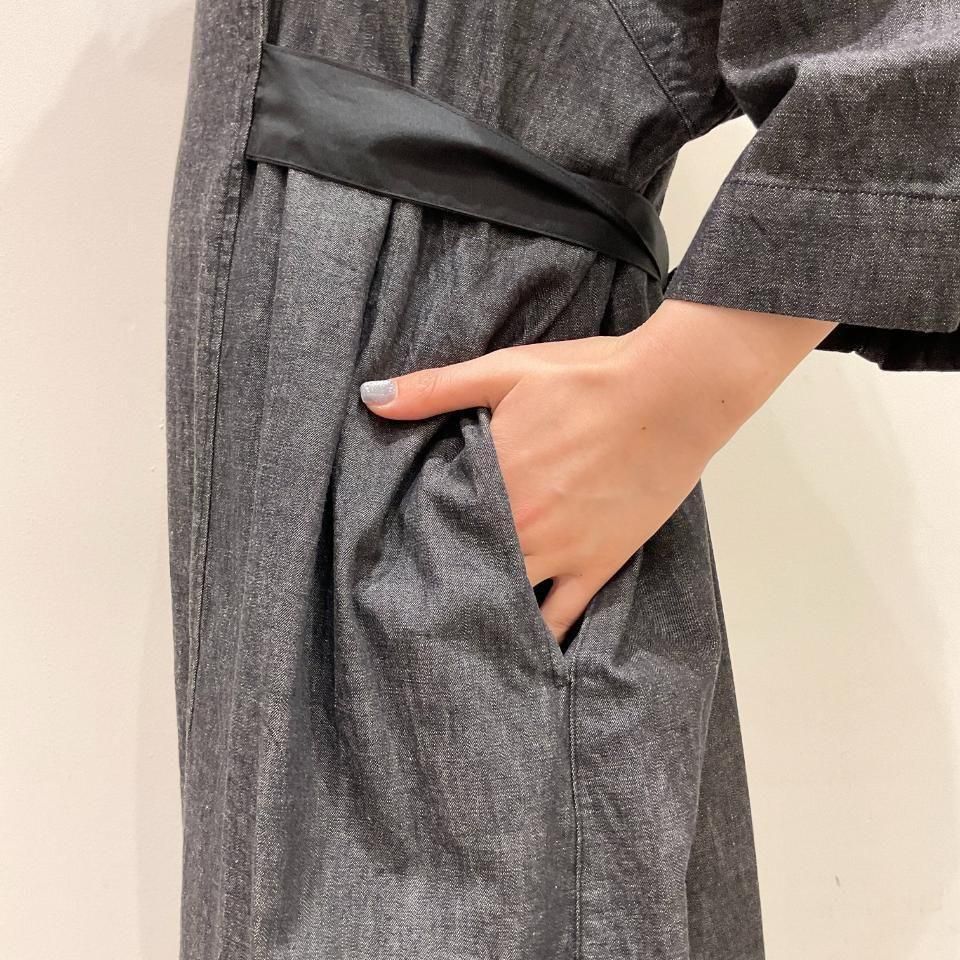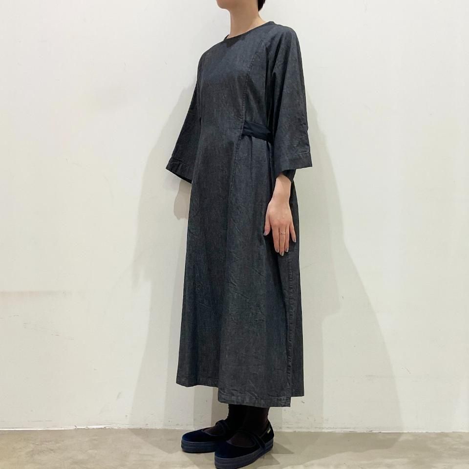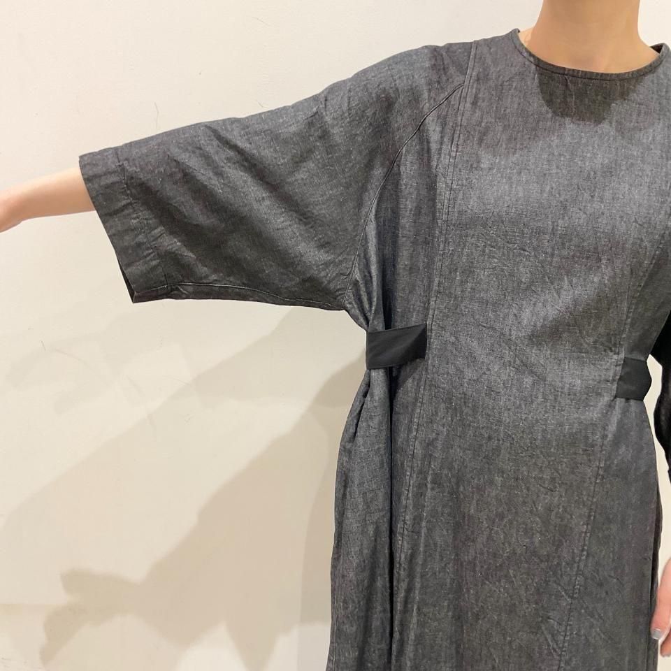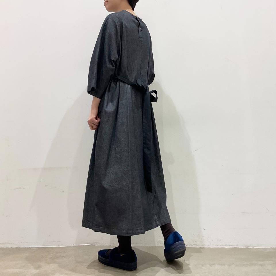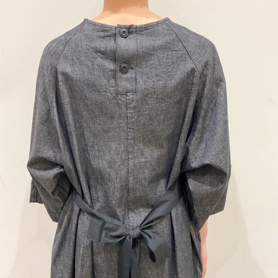 ゆったりとした身幅を後ろリボンで結ぶことにより、やわらかなデニムのドレープが生まれるカジュアル素材のフェミニンなドレス。