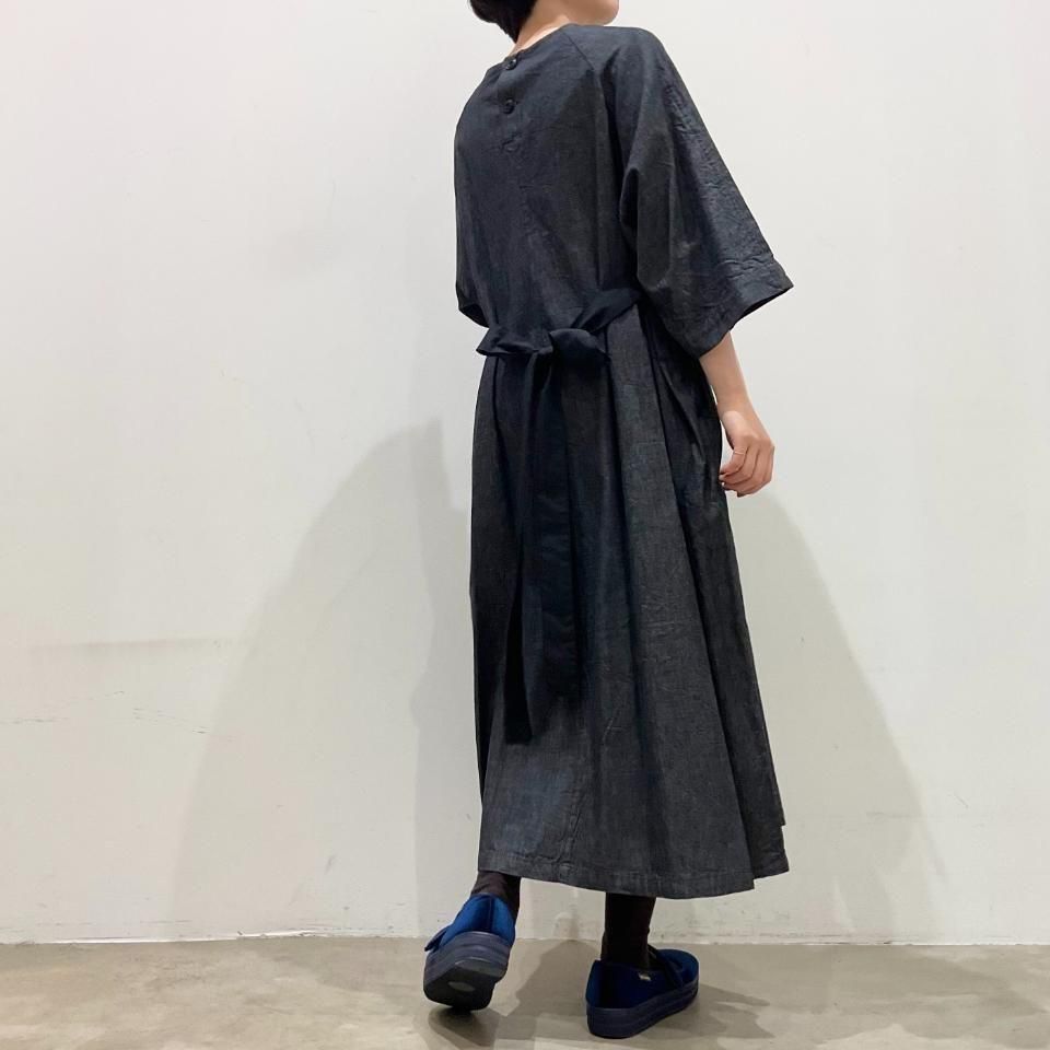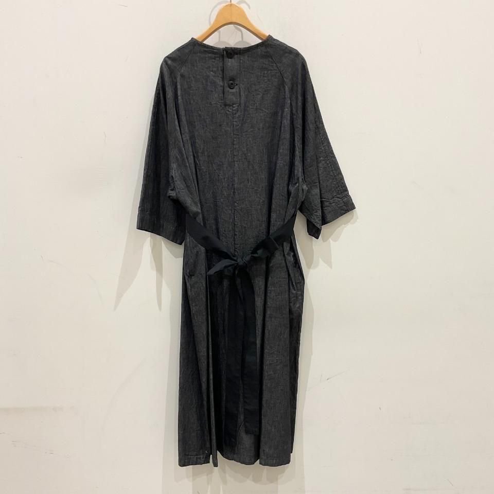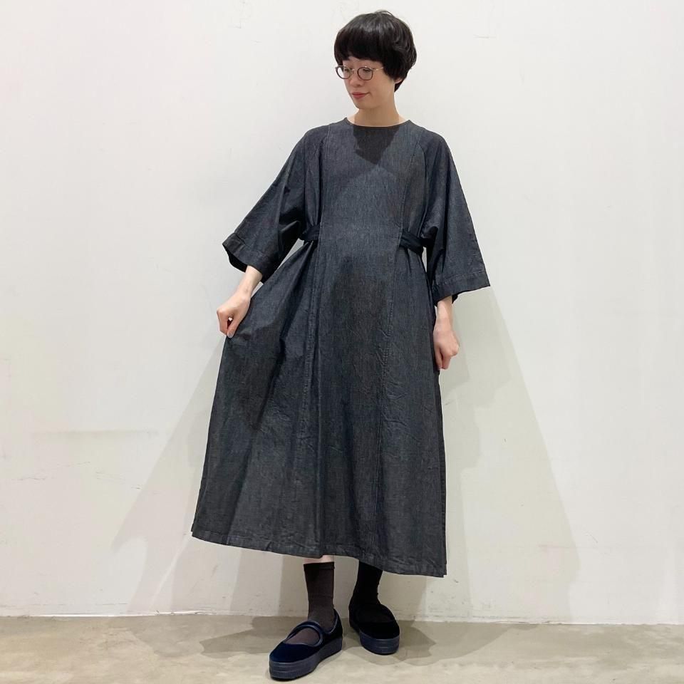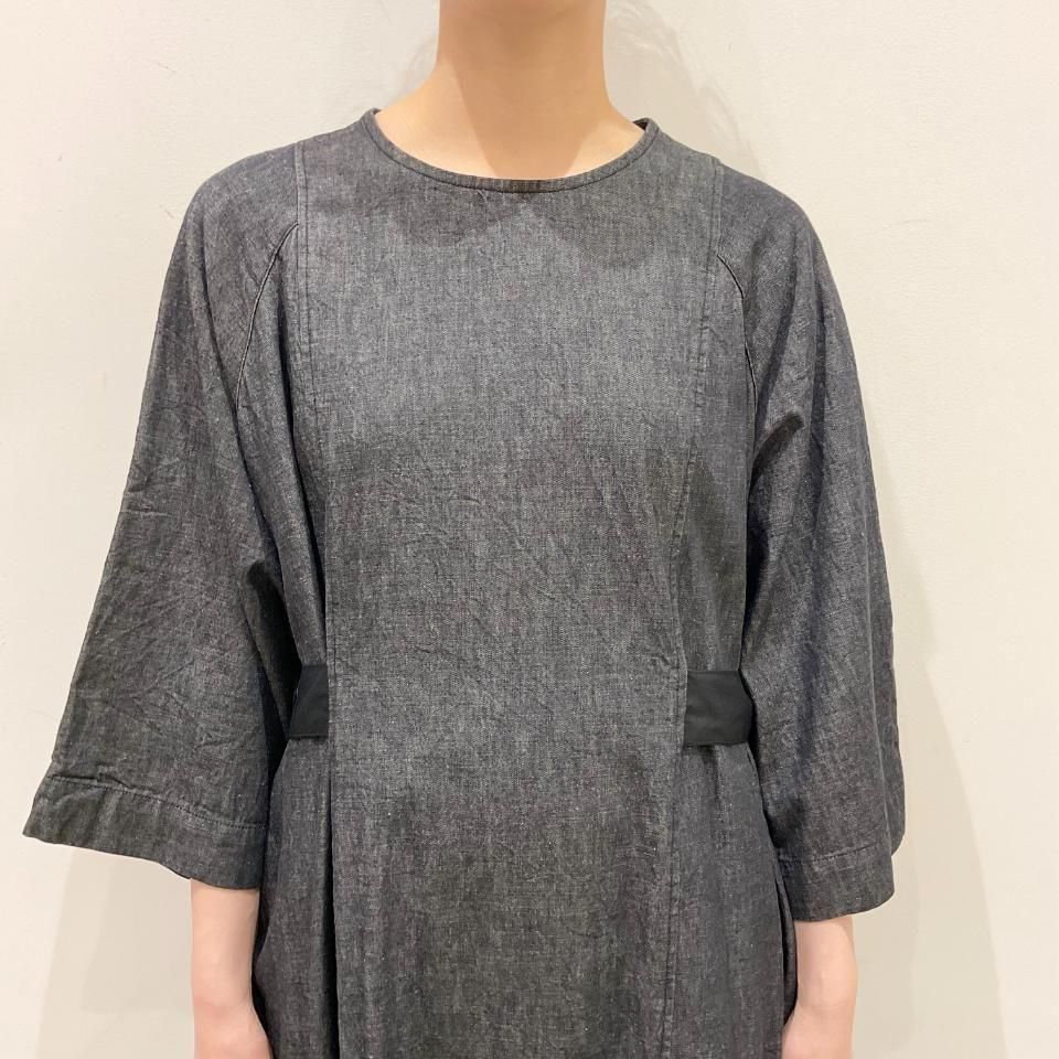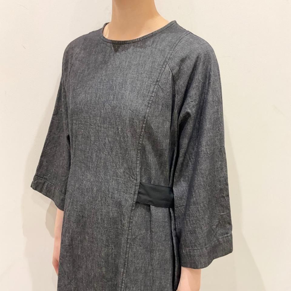 ゆったりとした身幅を後ろリボンで結ぶことにより、やわらかなデニムのドレープが生まれるカジュアル素材のフェミニンなドレス。