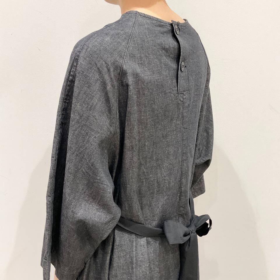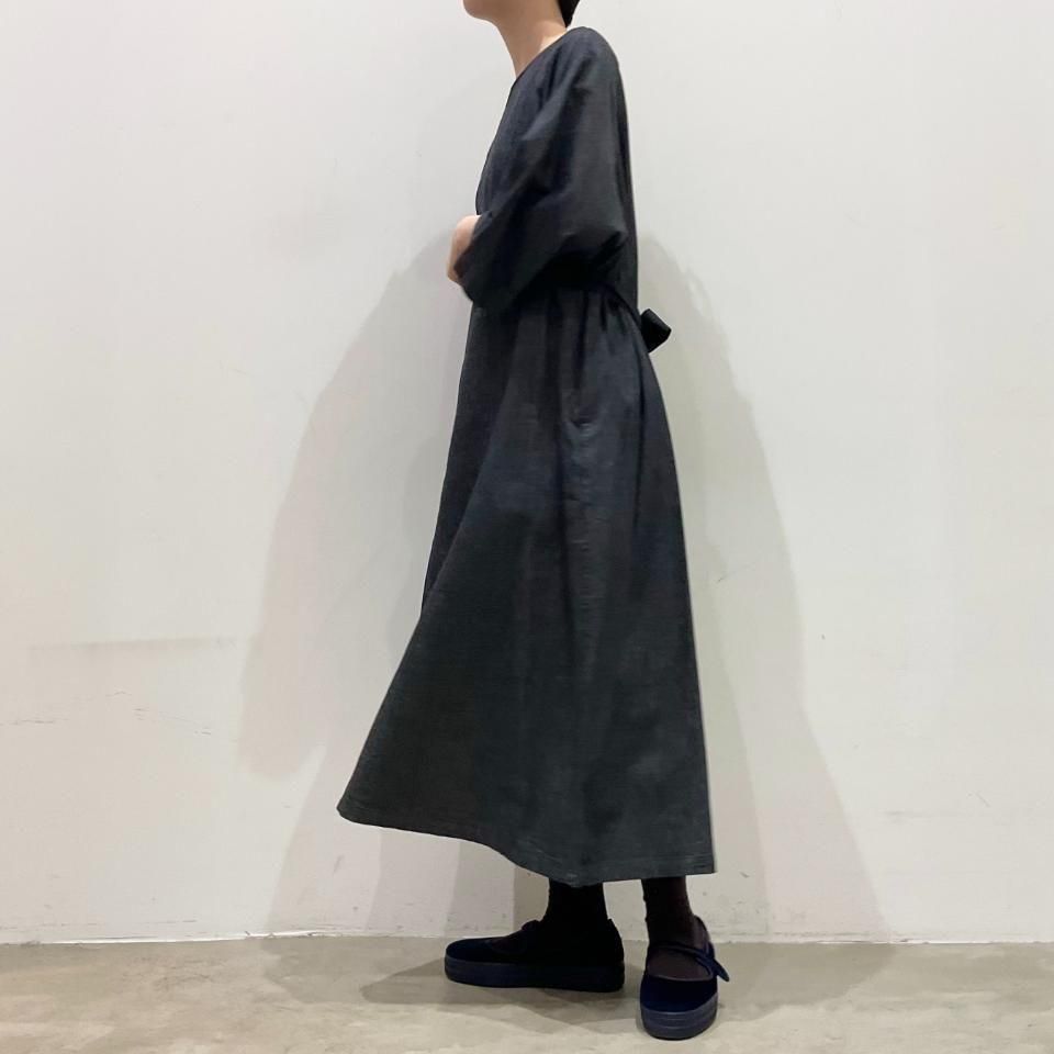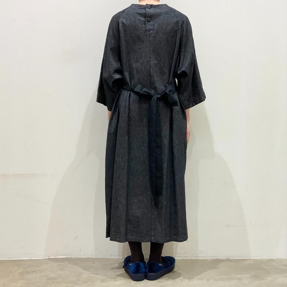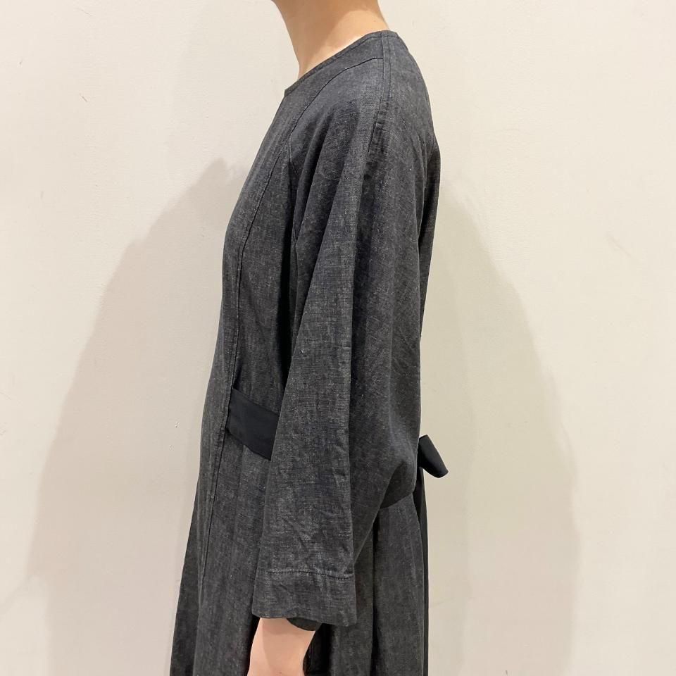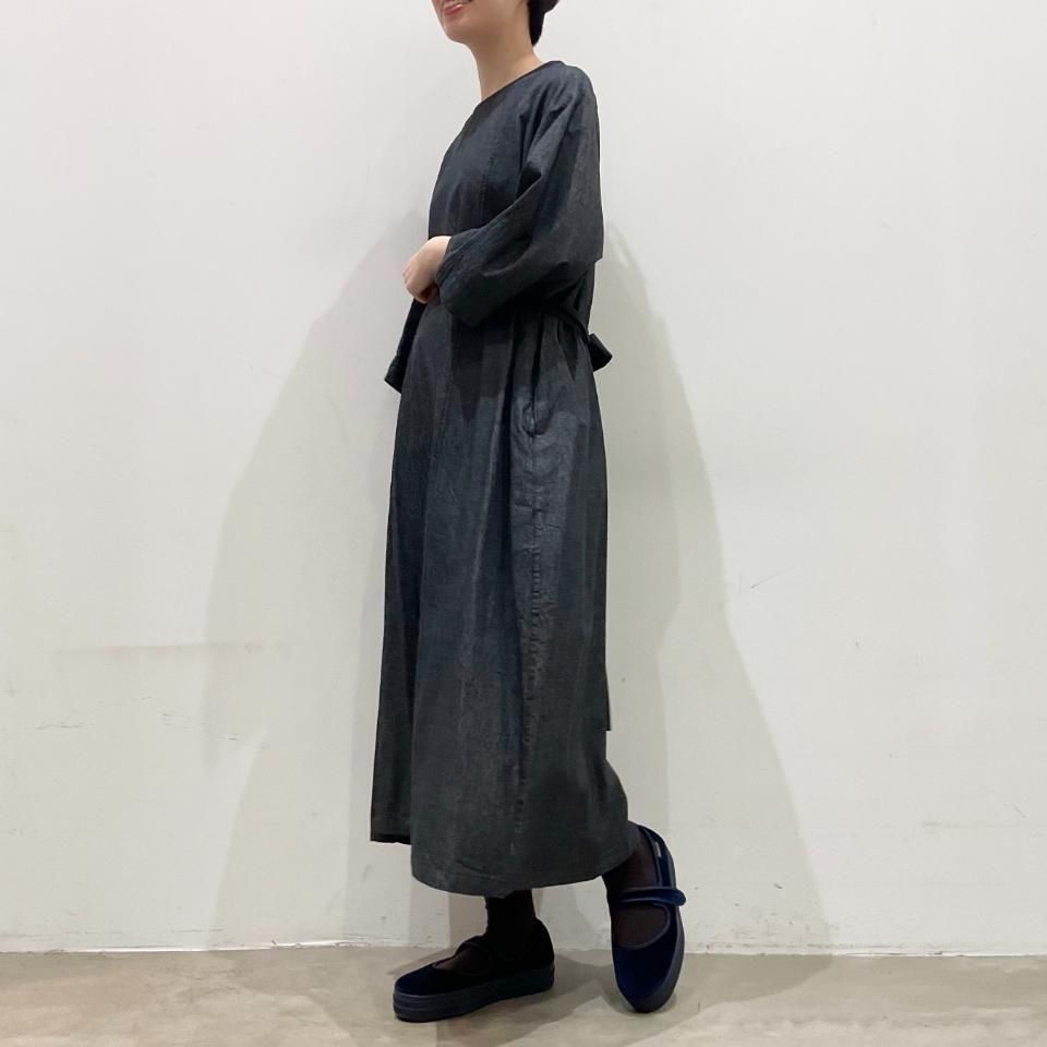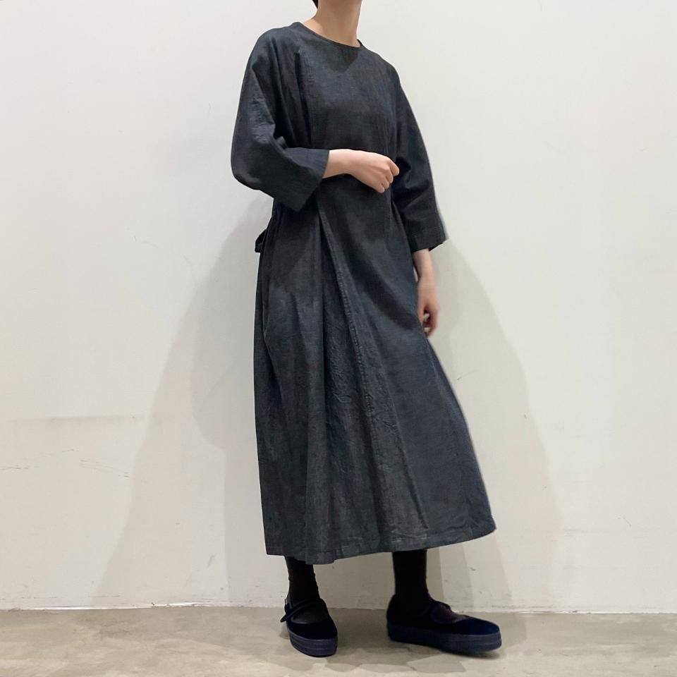 ゆったりとした身幅を後ろリボンで結ぶことにより、やわらかなデニムのドレープが生まれるカジュアル素材のフェミニンなドレス。