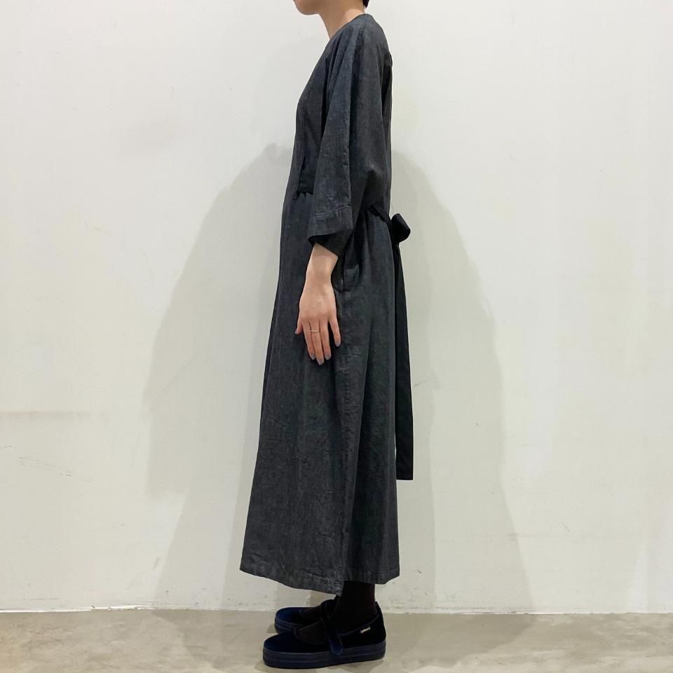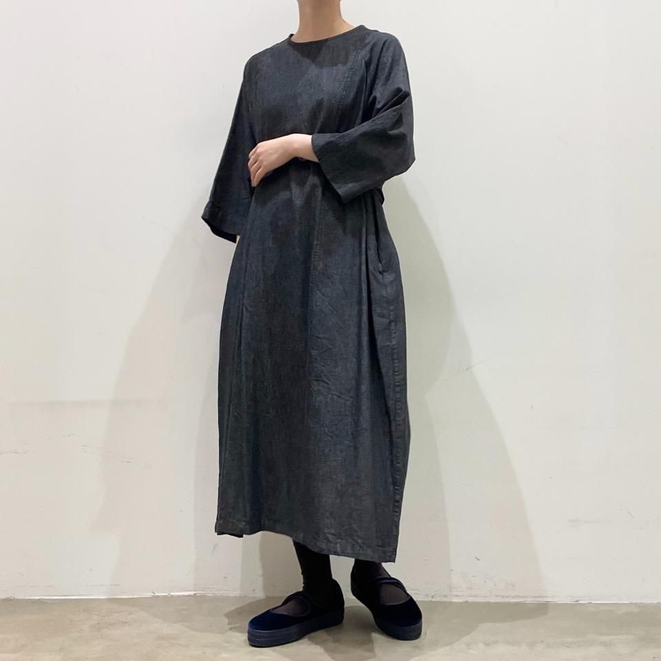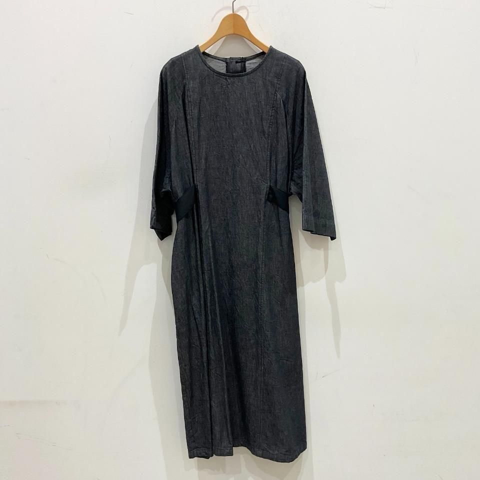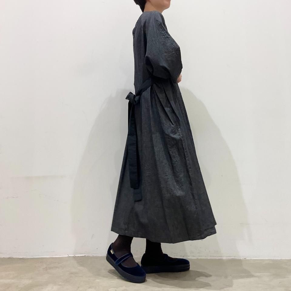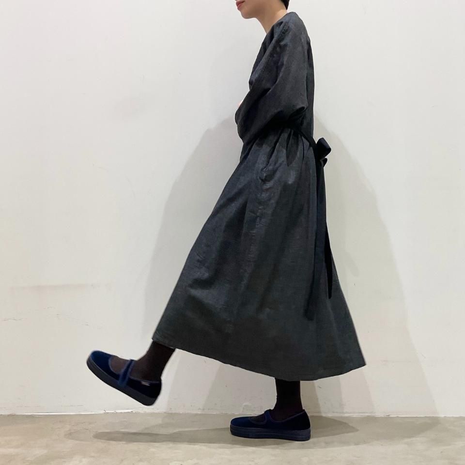 ゆったりとした身幅を後ろリボンで結ぶことにより、やわらかなデニムのドレープが生まれるカジュアル素材のフェミニンなドレス。