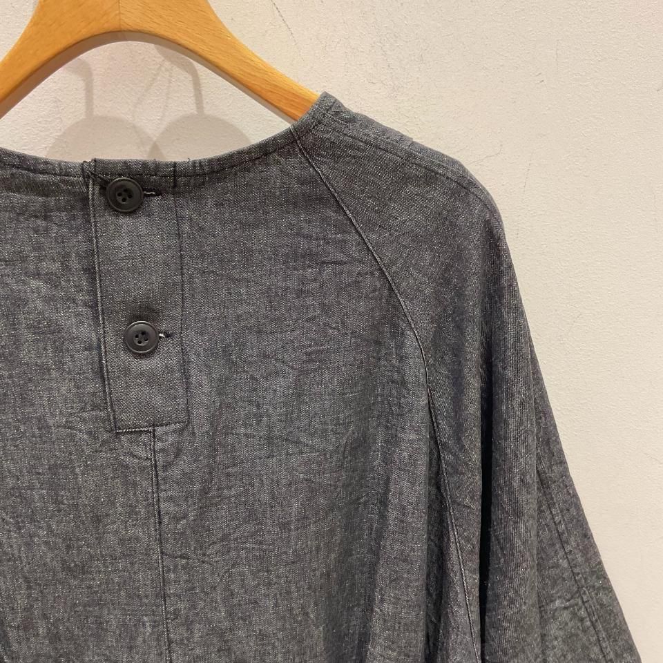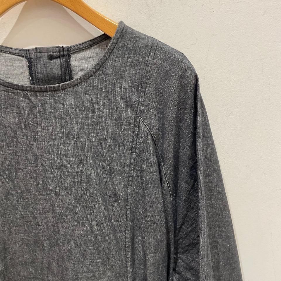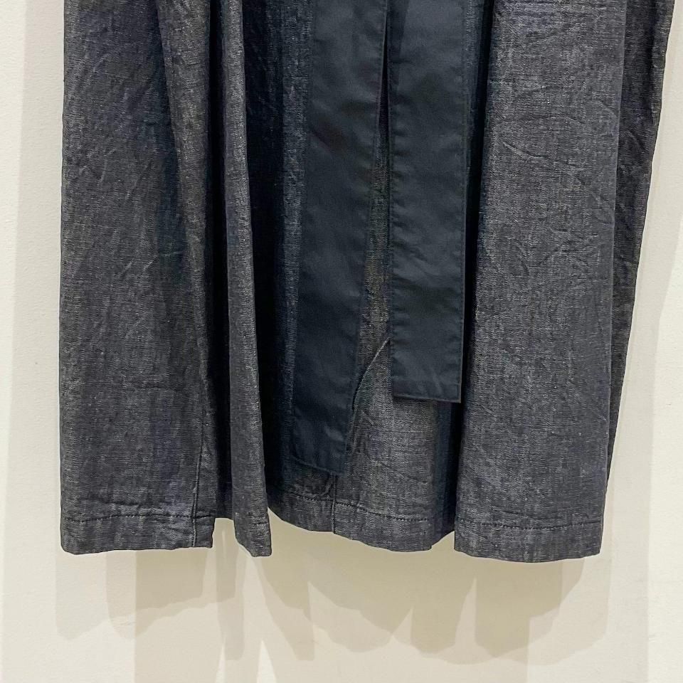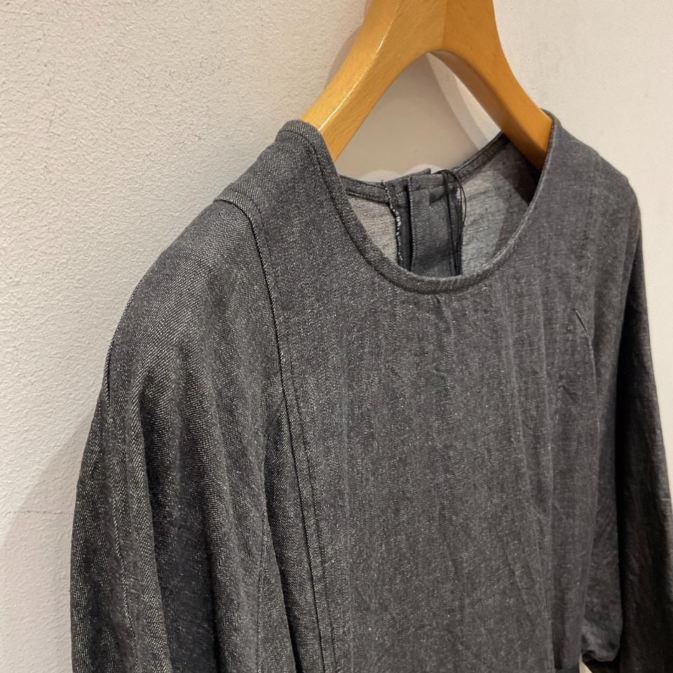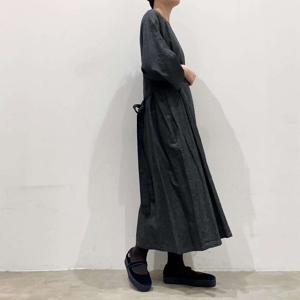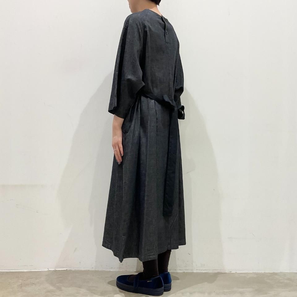 ゆったりとした身幅を後ろリボンで結ぶことにより、やわらかなデニムのドレープが生まれるカジュアル素材のフェミニンなドレス。