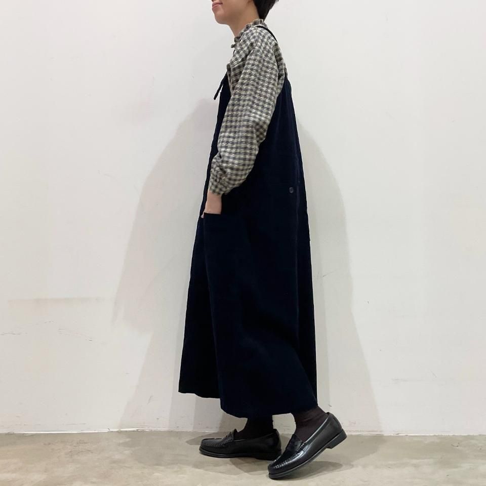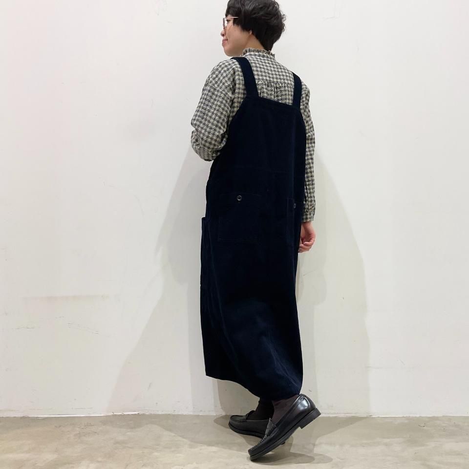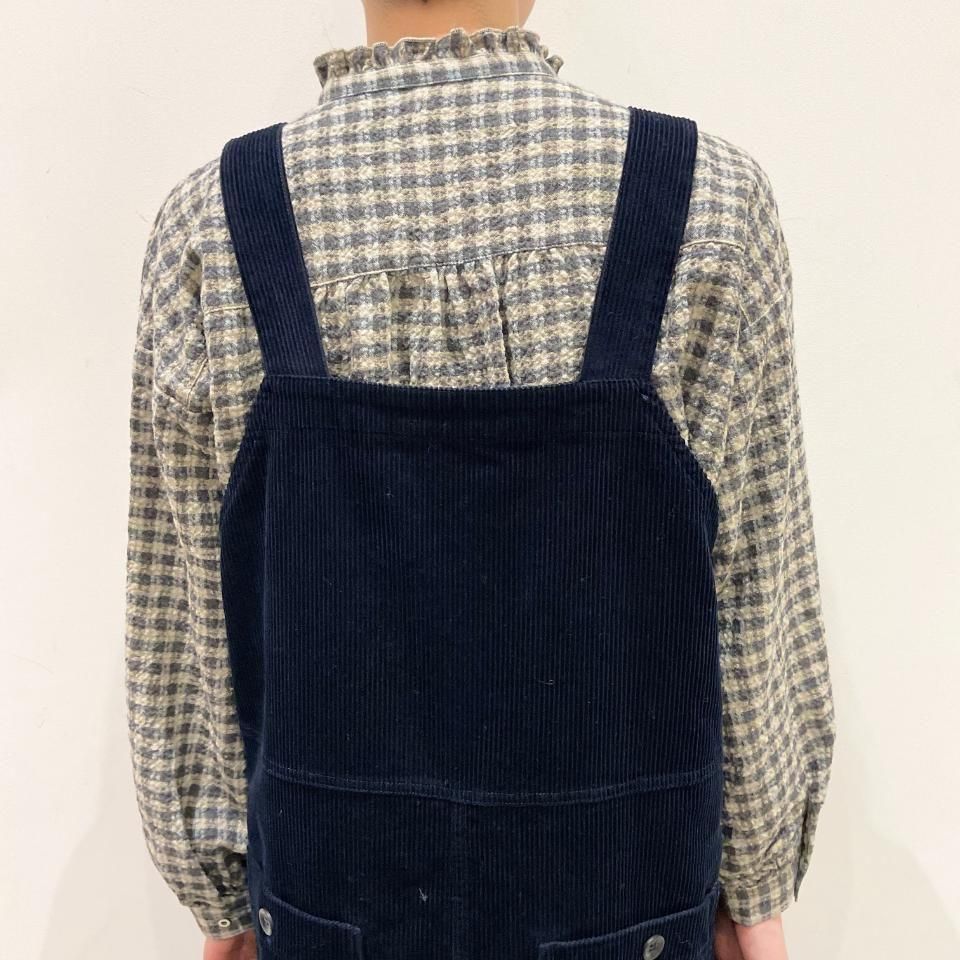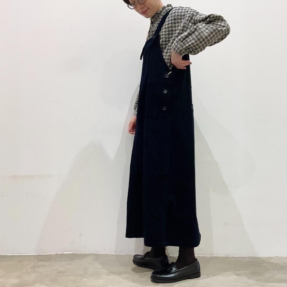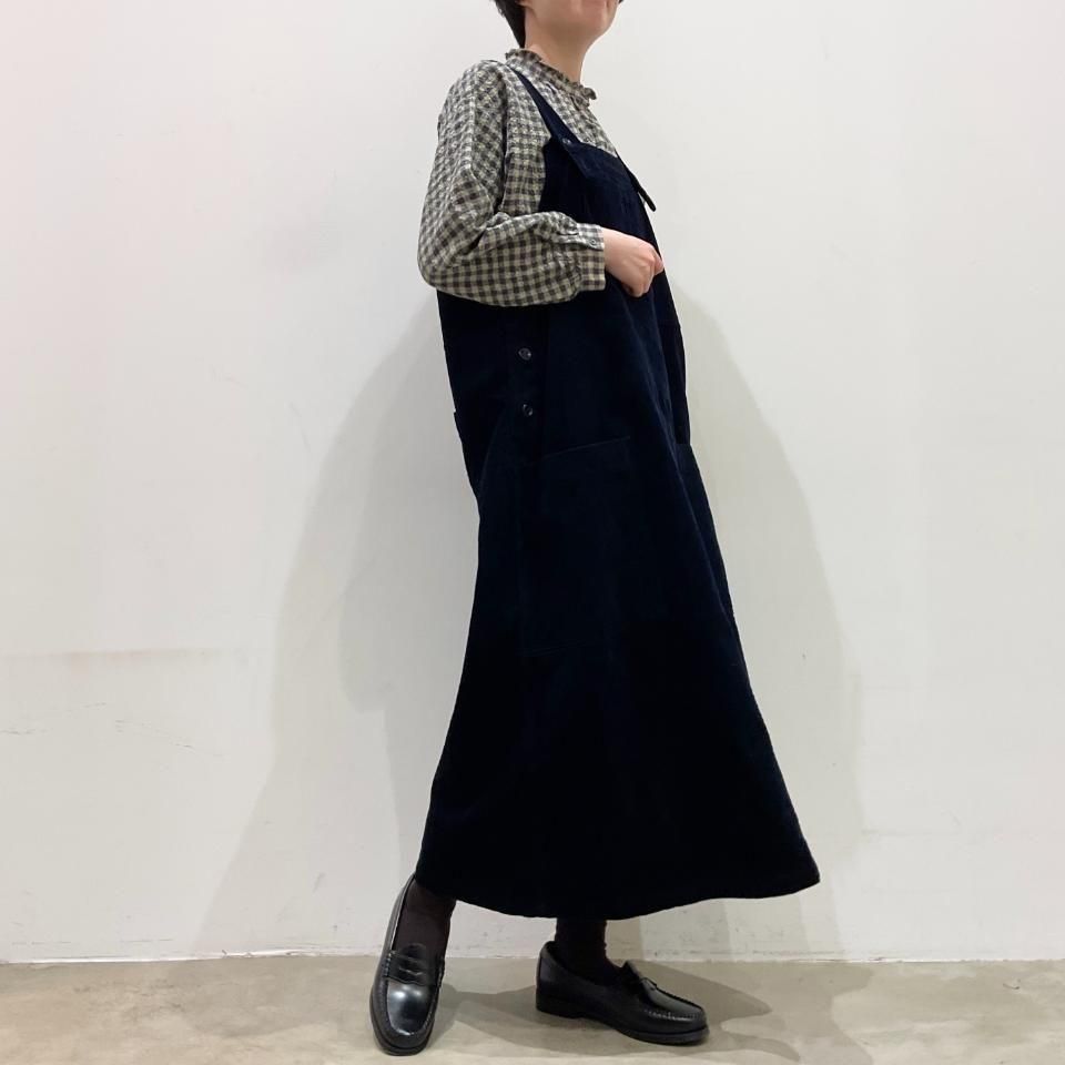 ゆったりとした身幅と脇が広く開いているので厚地のセーターの上からも重ね着楽々です。