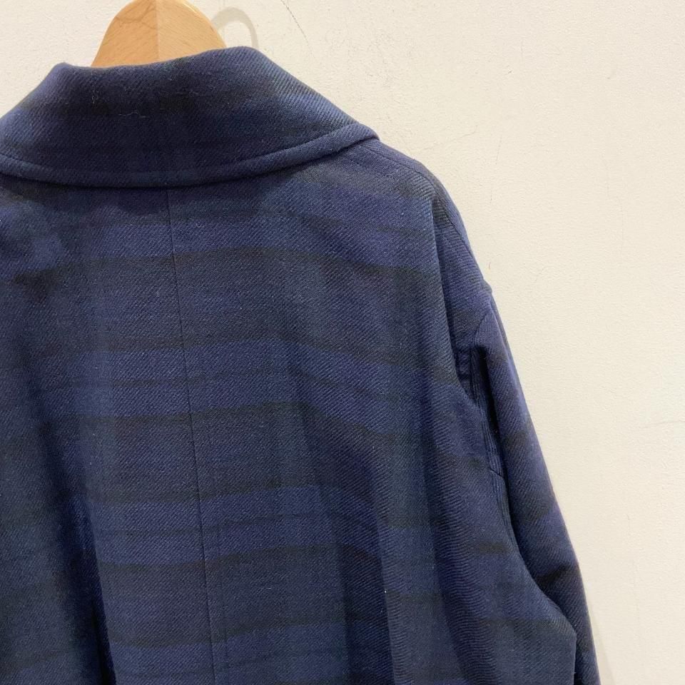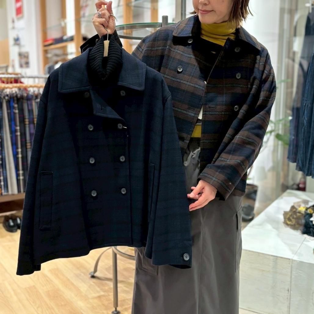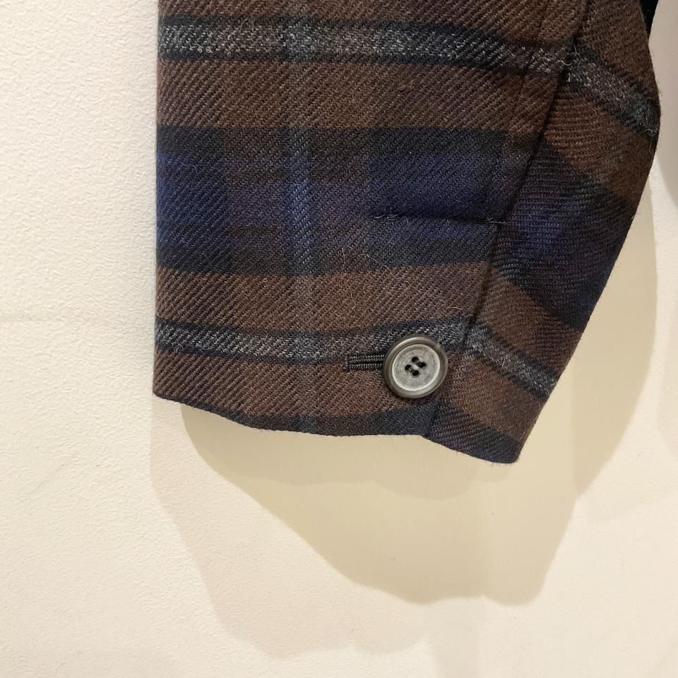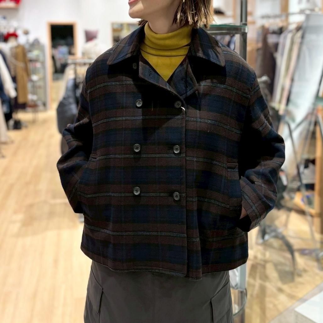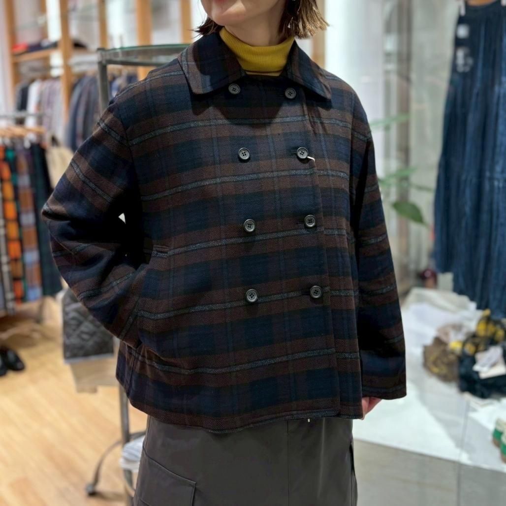 軽いタッチの風合いに仕上げられたダークトーンなチェック柄のダブルブレストジャケットです。