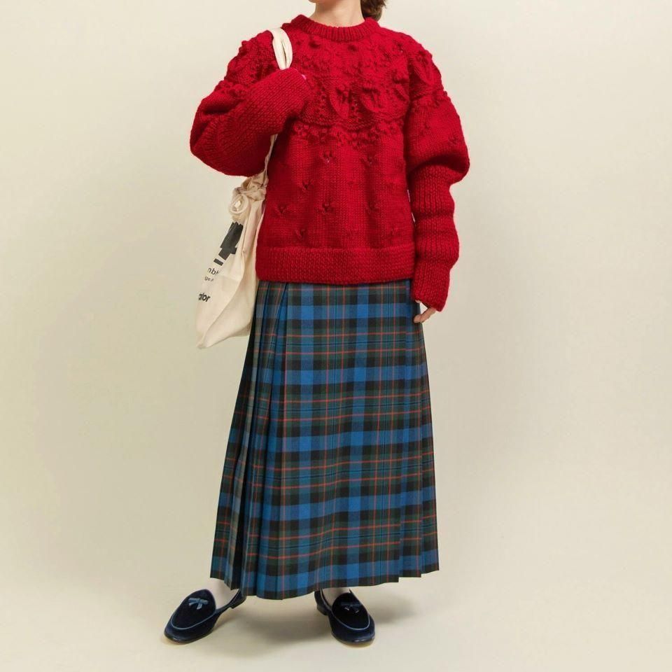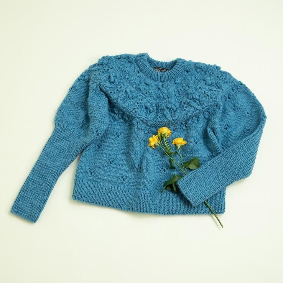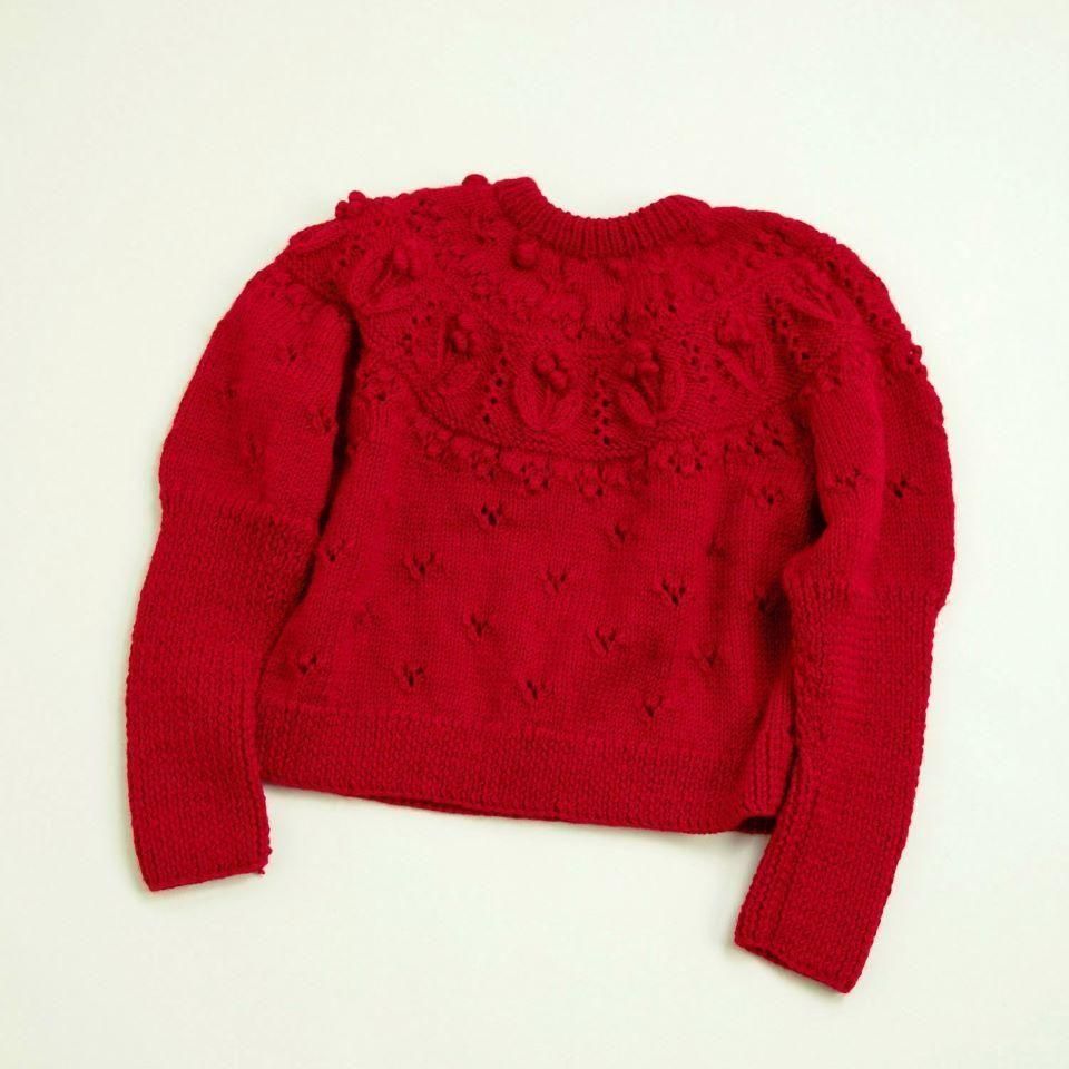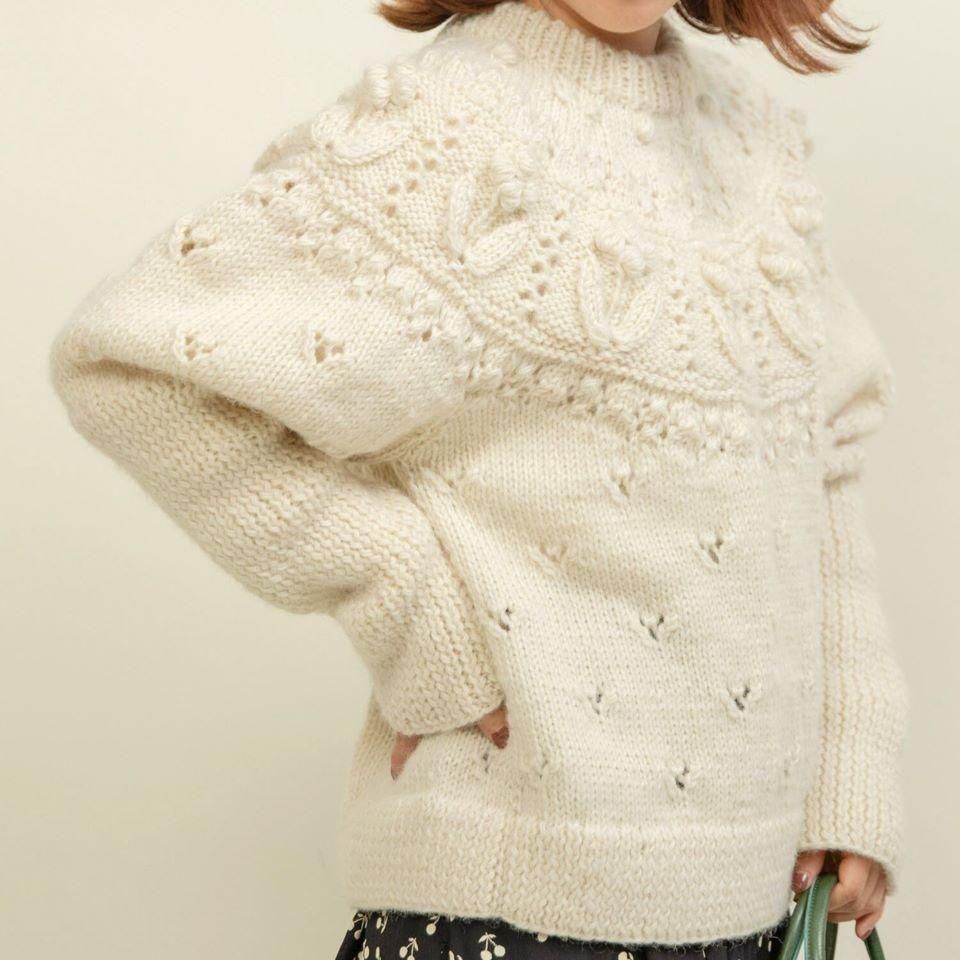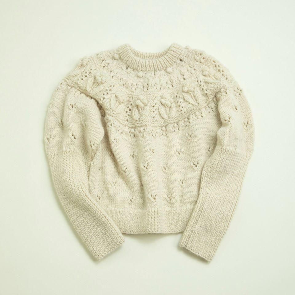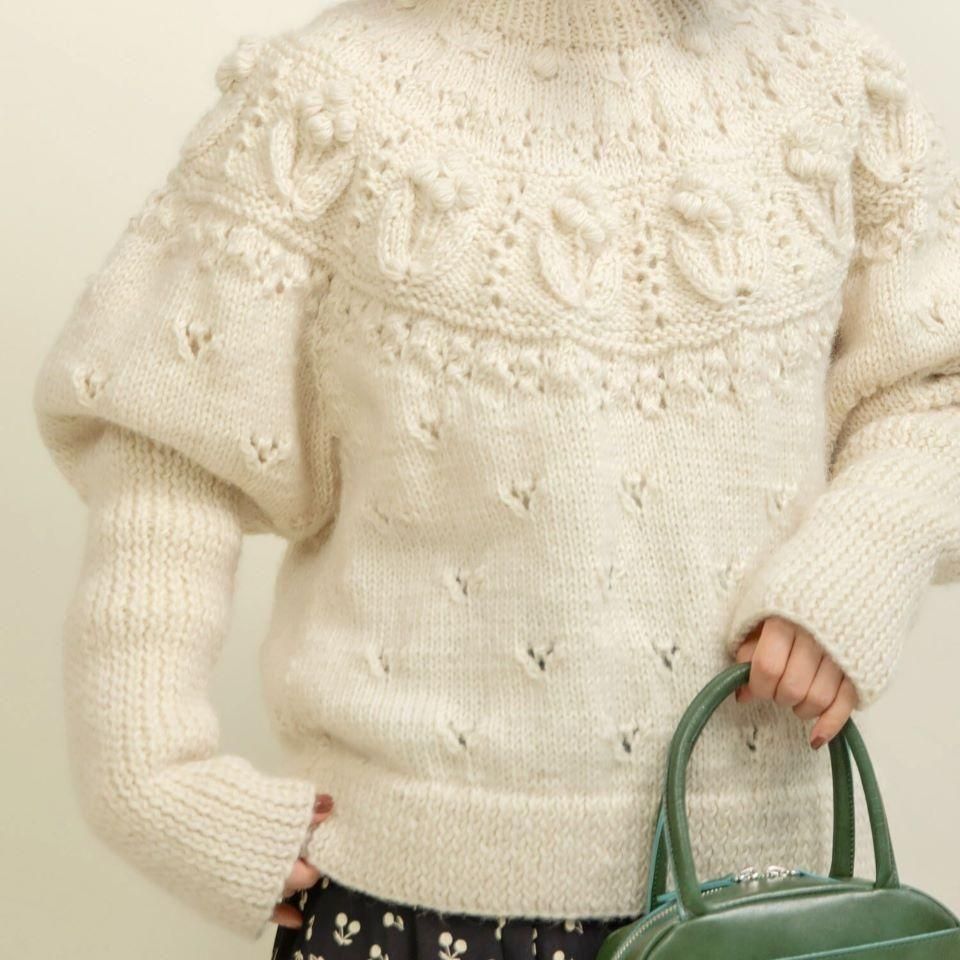 ぽこぽことした立体的な編みや透かしなどさまざまな編地を組み合わせたノスタルジックな求心ニット。