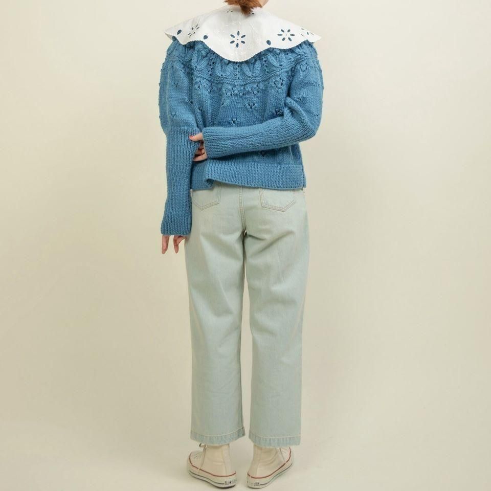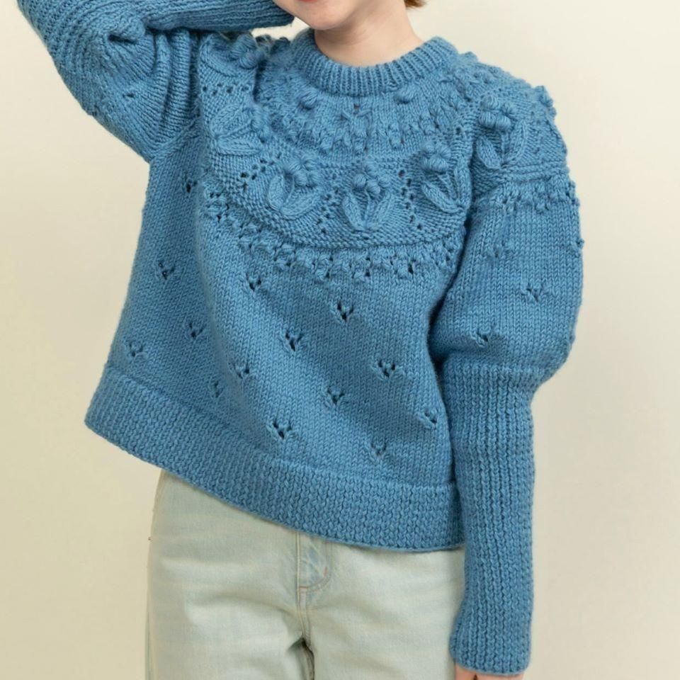 よく見るとお花のようなモチーフや抜け感のある透かし編みなどさまざまな編地が組み合わさり、着ても、見ても楽しいニットです。