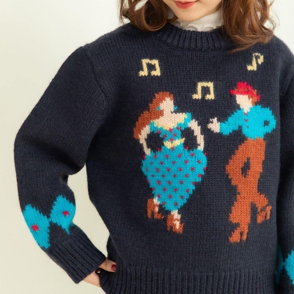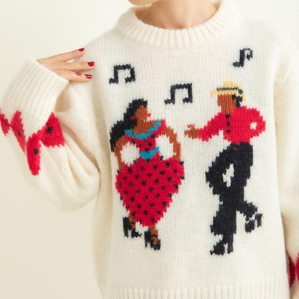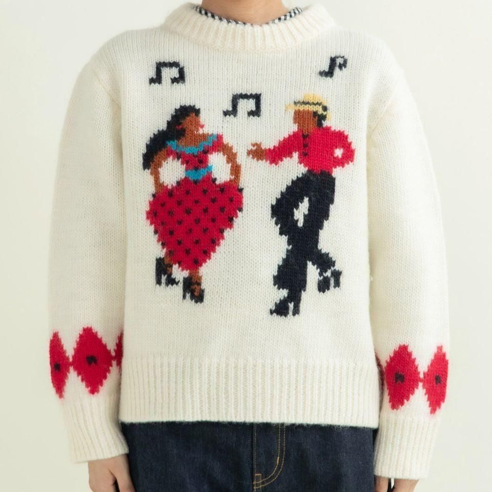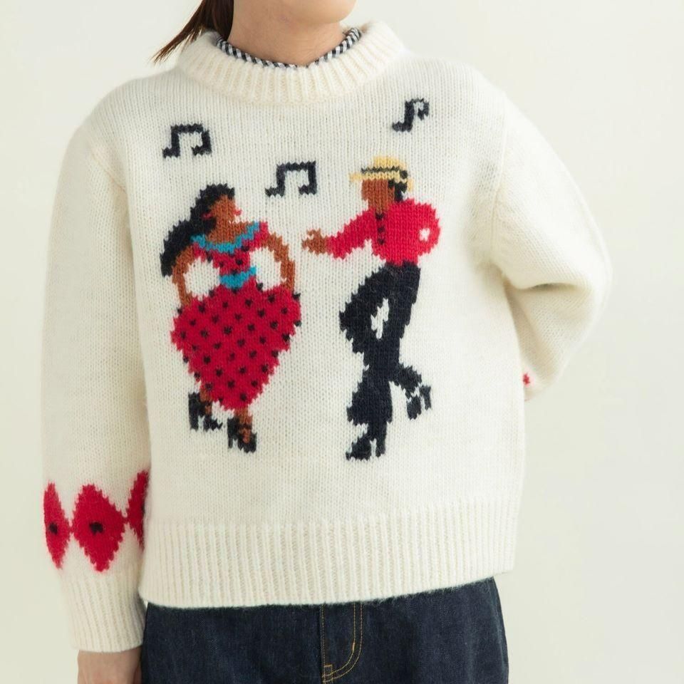 古着のニットを参考に、フラメンコダンサーが楽しそうに踊っているユニークな姿をモチーフにしました。