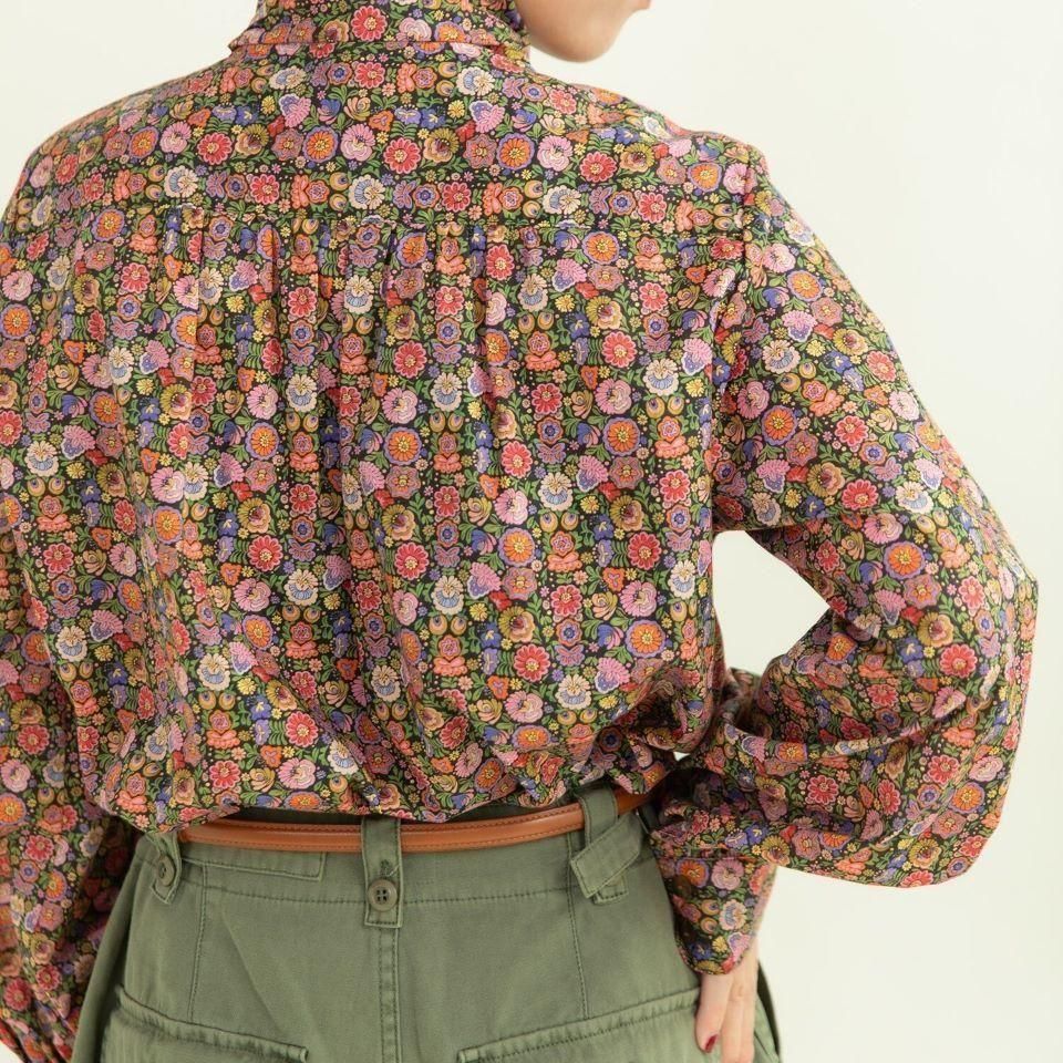1965年にリバティが創作したオリジナルデザインは、ジュエルトーンのコントラストカラーとはっきりしたフォルムが暗い背景に映え、楽観的でノスタルジックな雰囲気を醸し出しています。