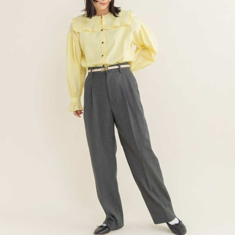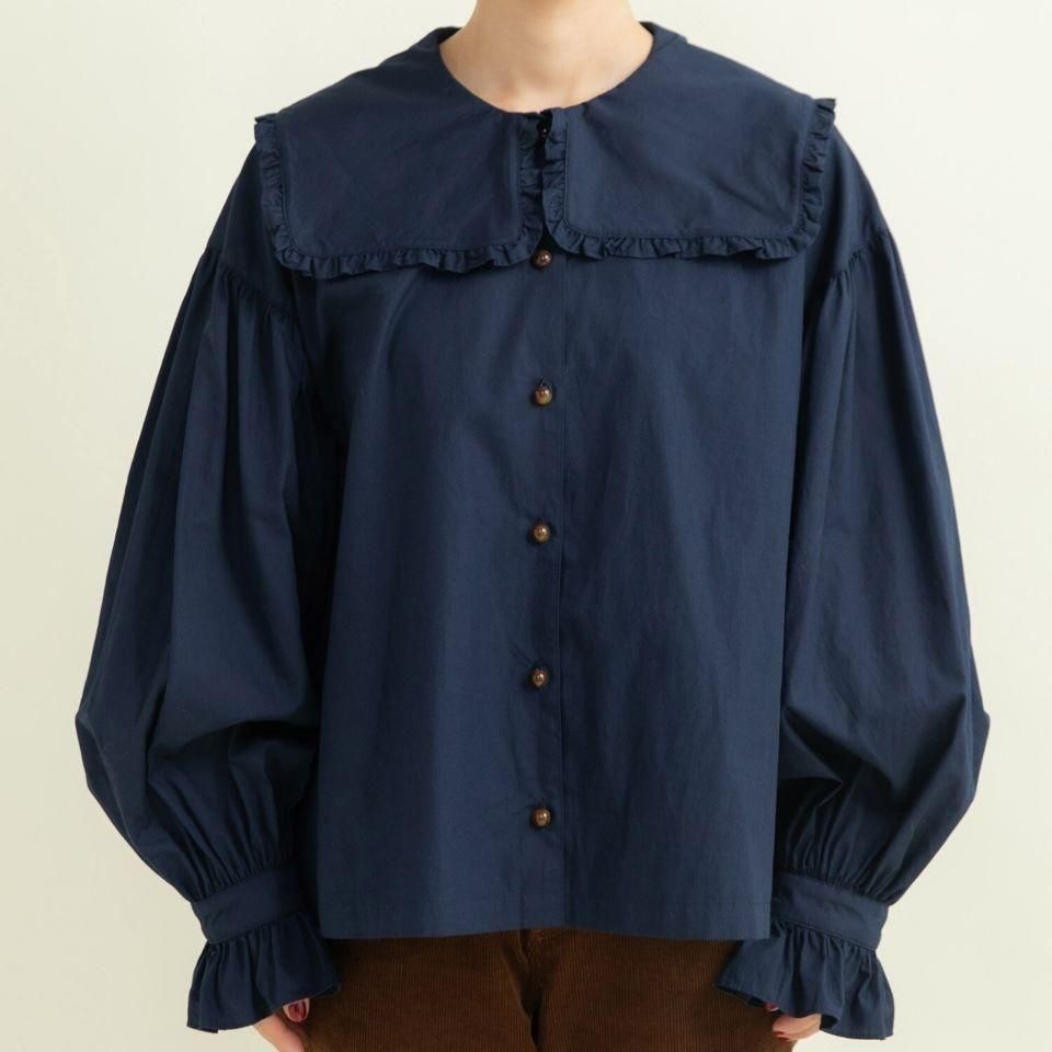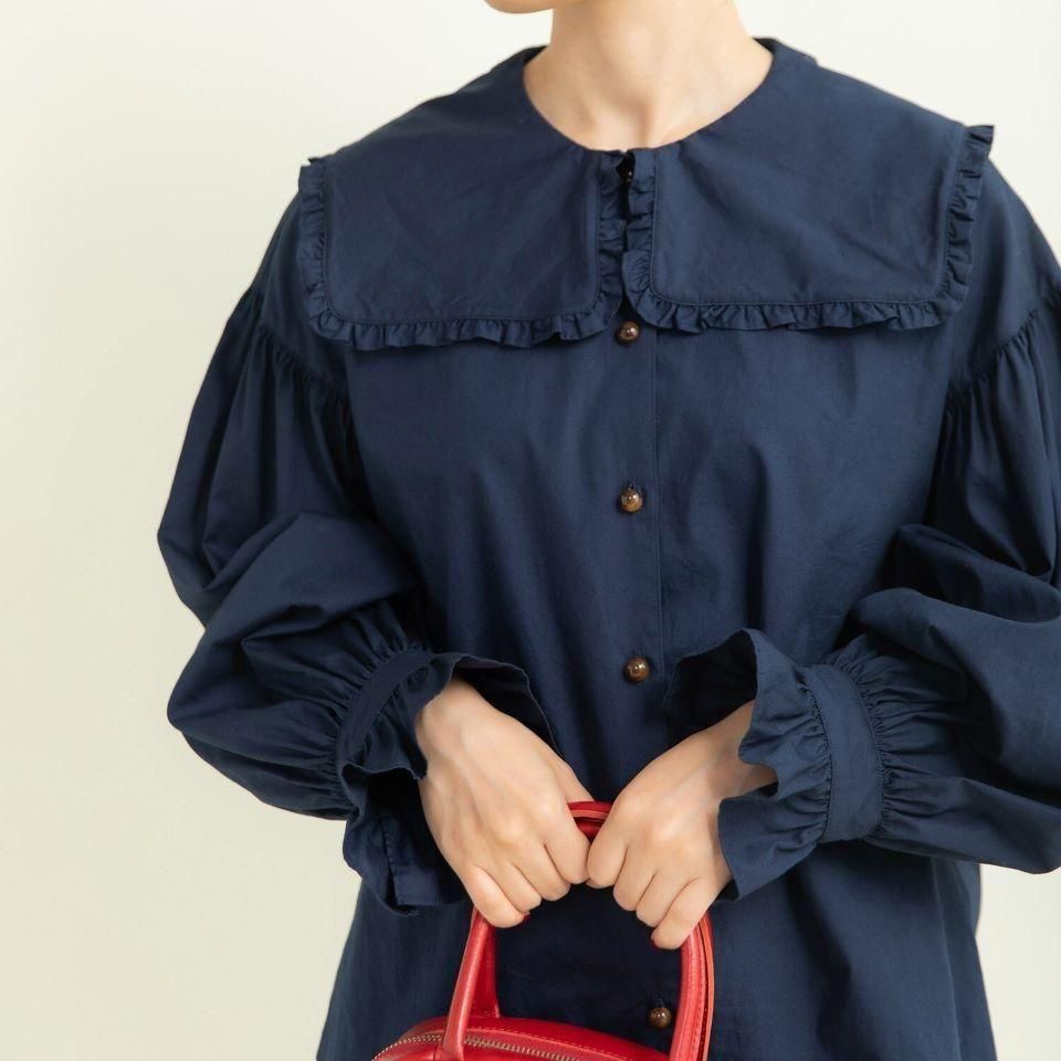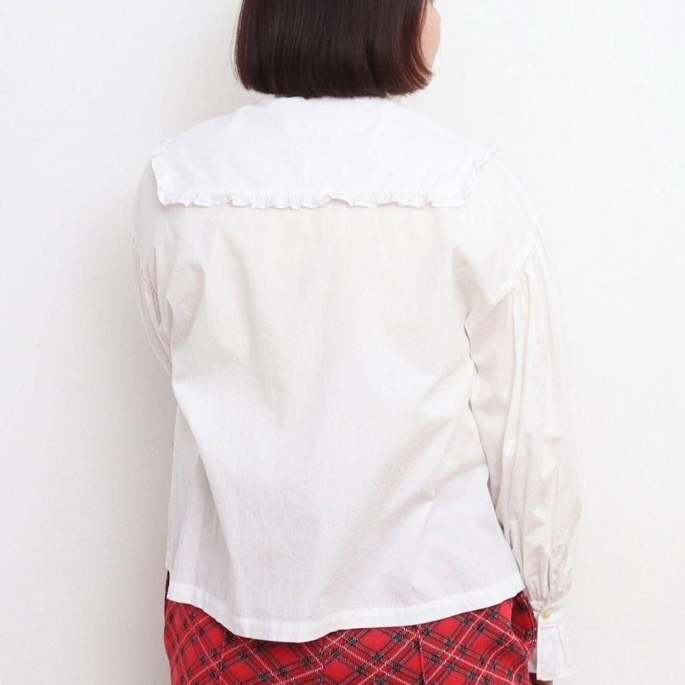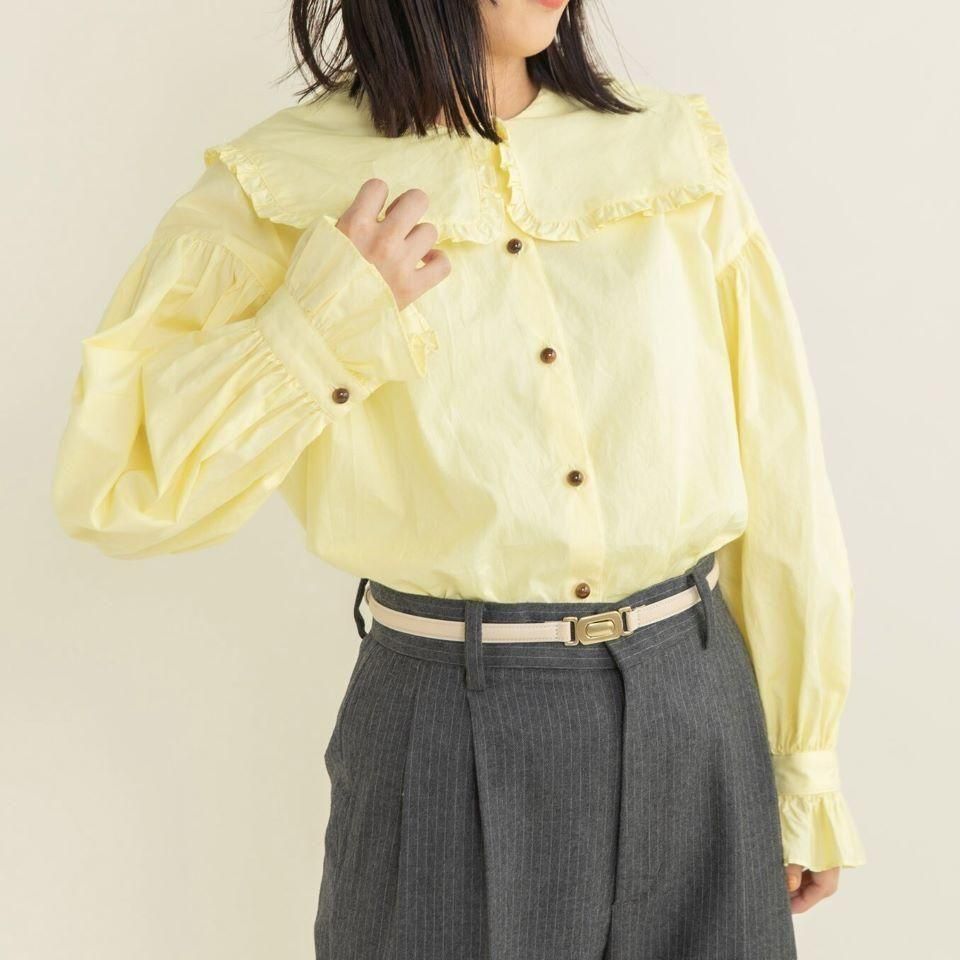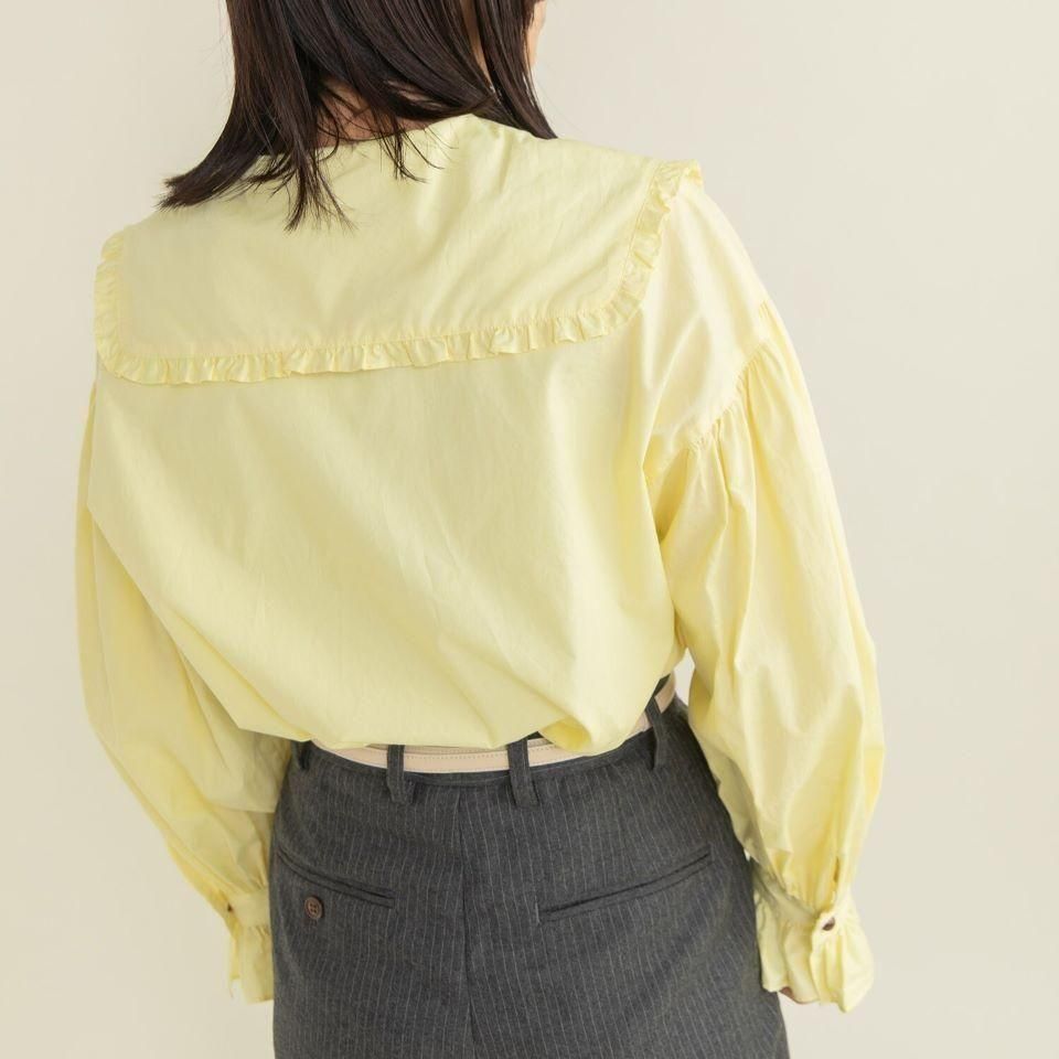 大きめなスクエア襟にさり気なくフリルがついた存在感のあるブラウス。