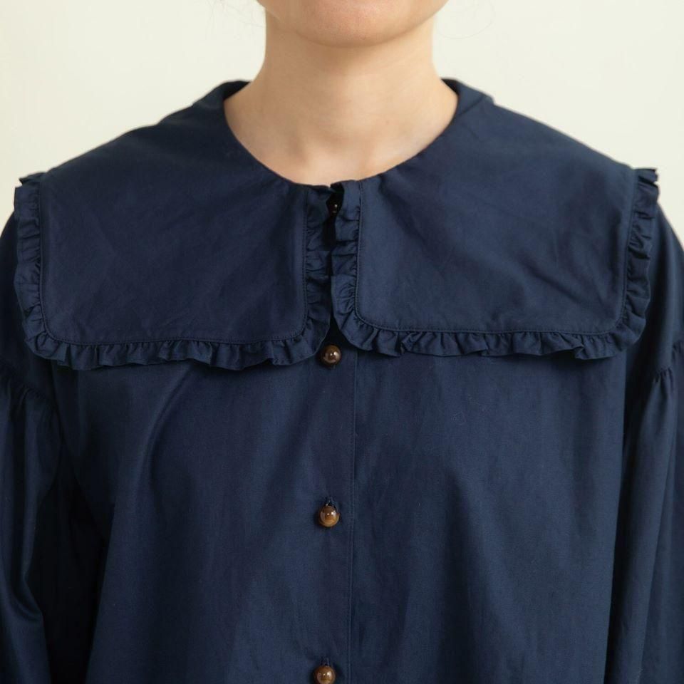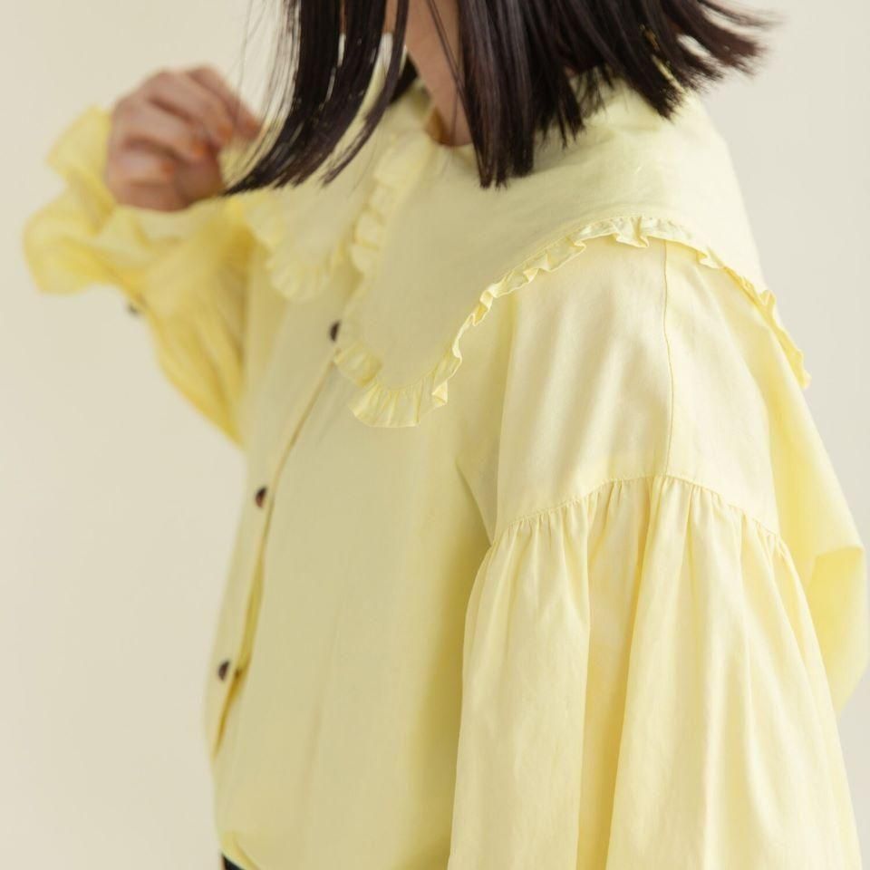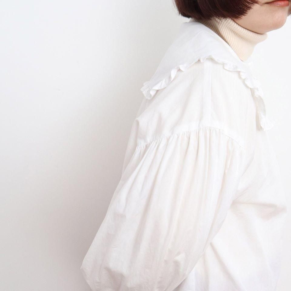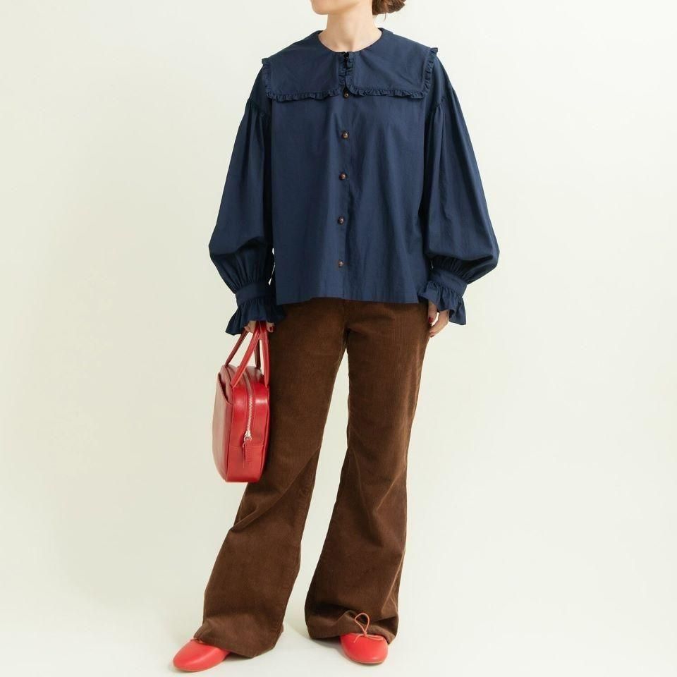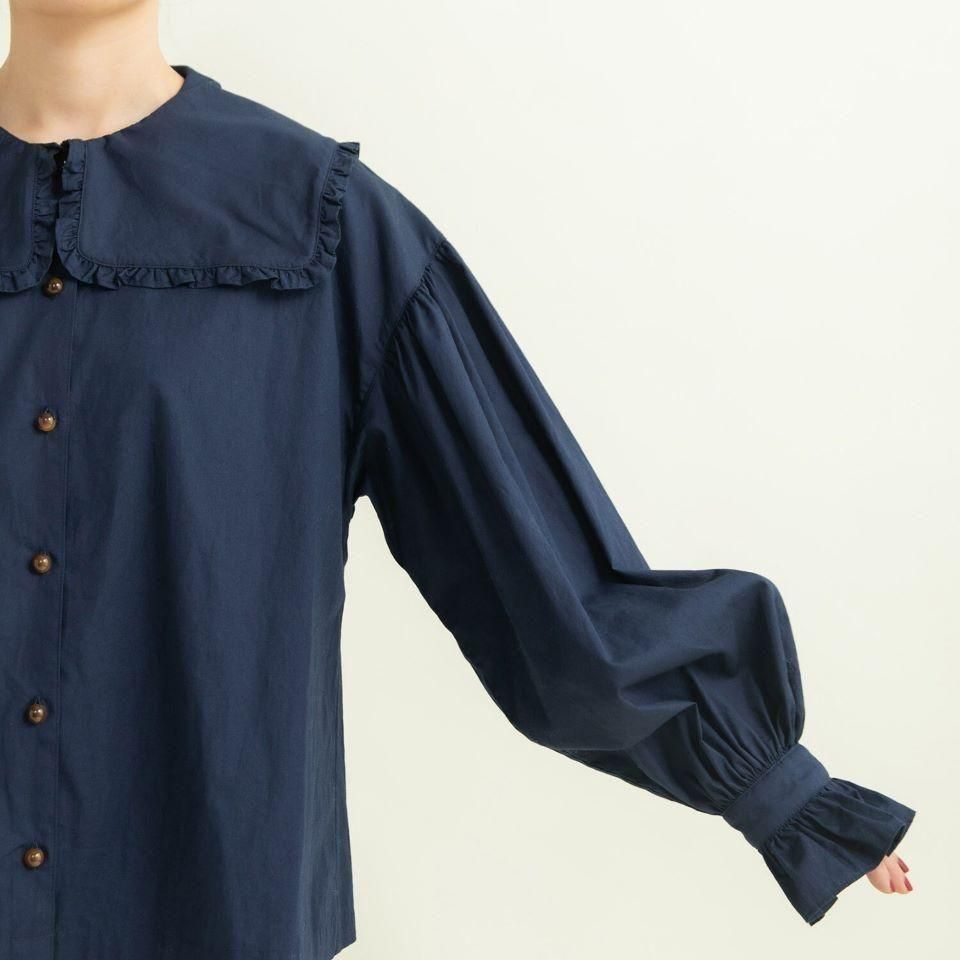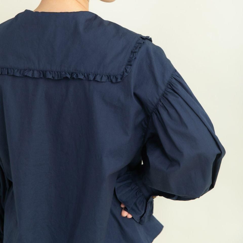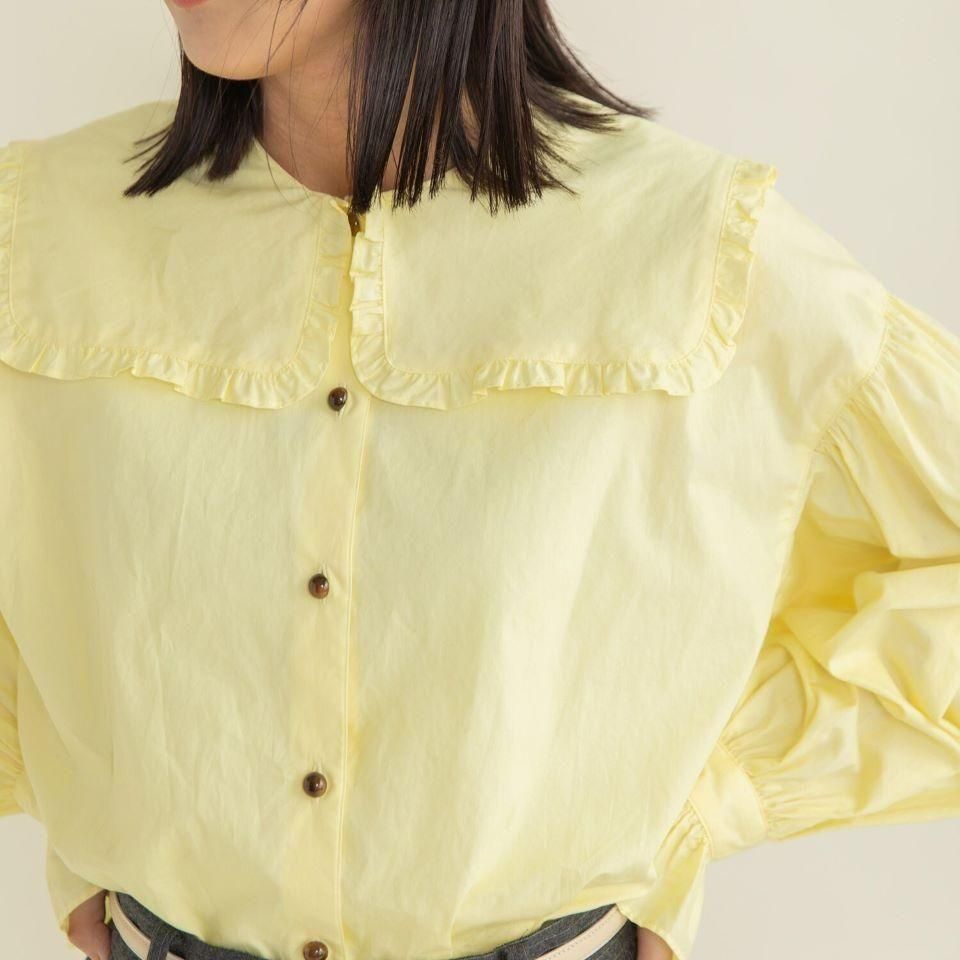 大きめなスクエア襟にさり気なくフリルがついた存在感のあるブラウス。