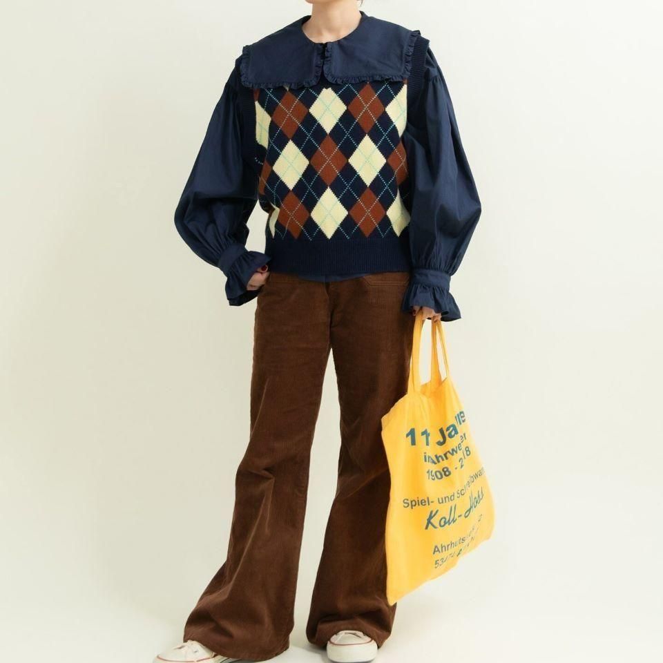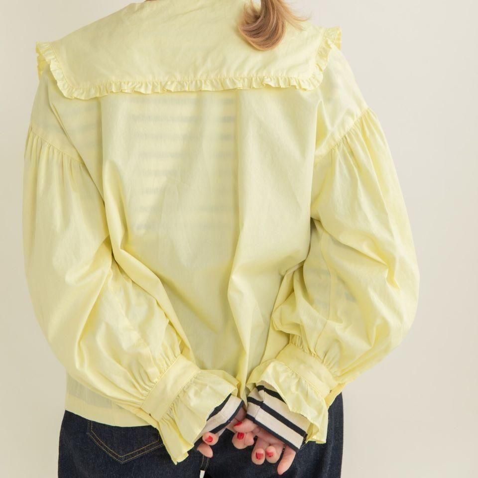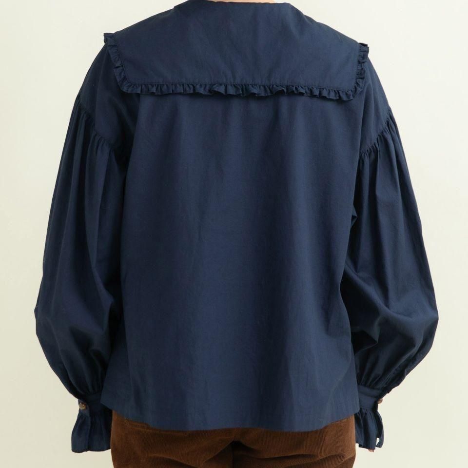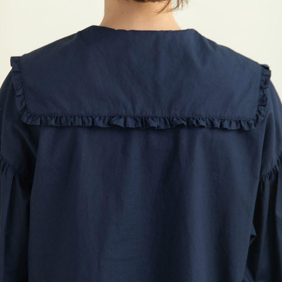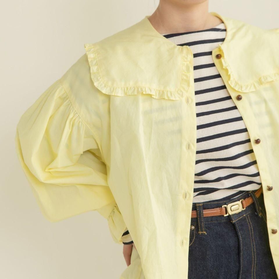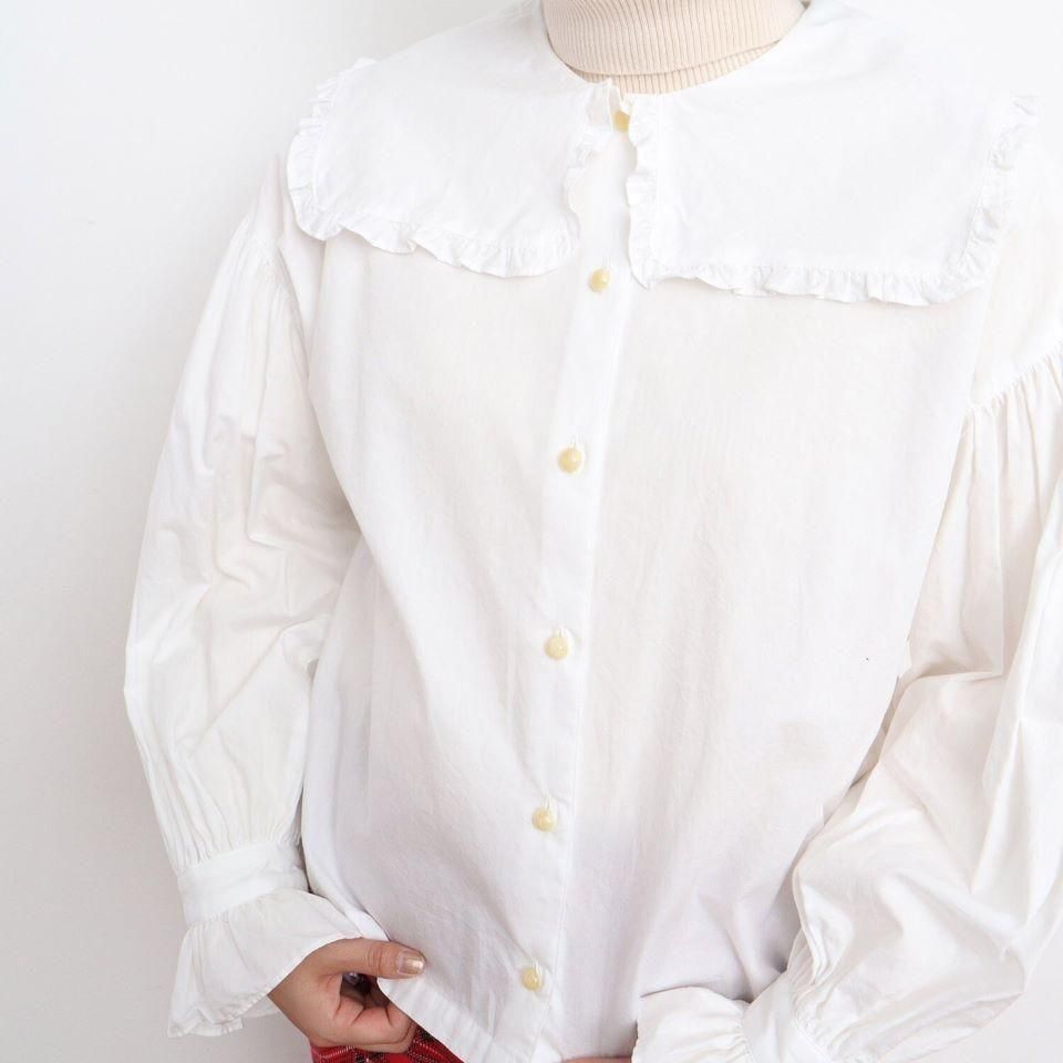 大きめなスクエア襟にさり気なくフリルがついた存在感のあるブラウス。