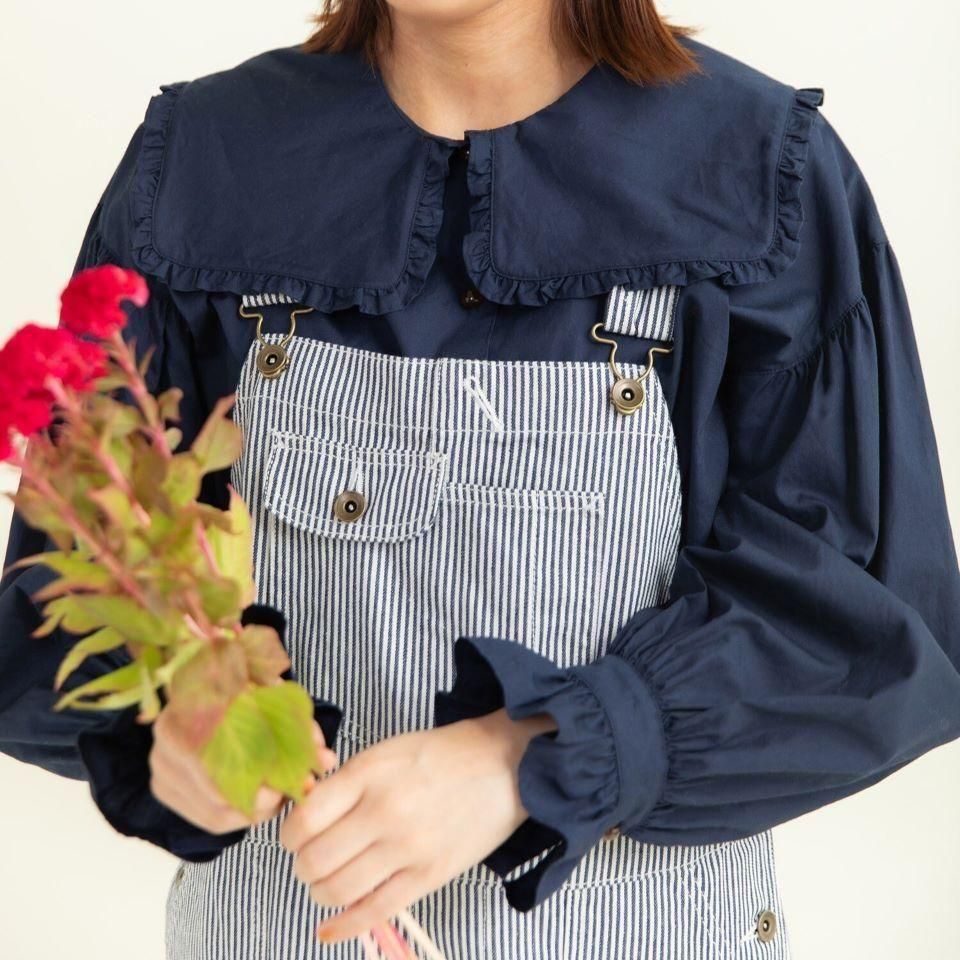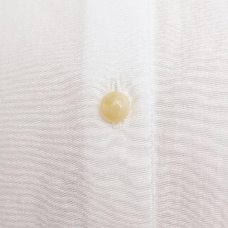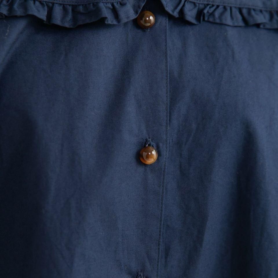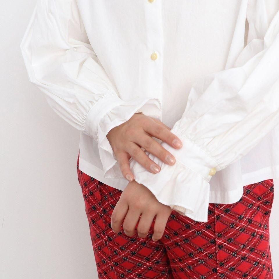 工場の技術によって袖に寄せたたっぷりのギャザーが綺麗に仕上がっているのも魅力の一つで、目を引く飴のようなコロンとした釦もポイントです。