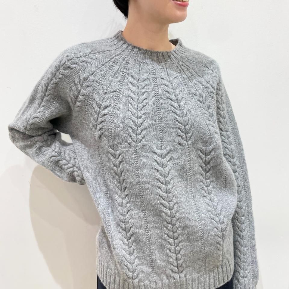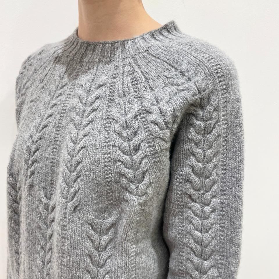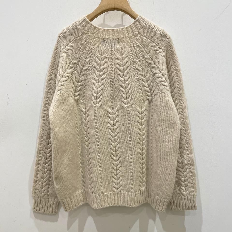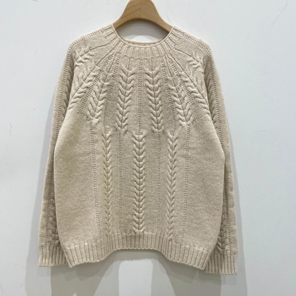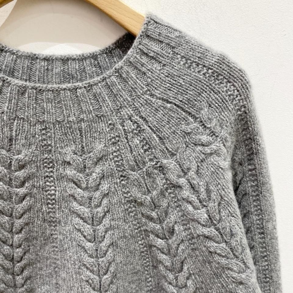 シンプルなクルーネックに袖や身頃に入ったケーブル編みデザインが特徴的なニットです。