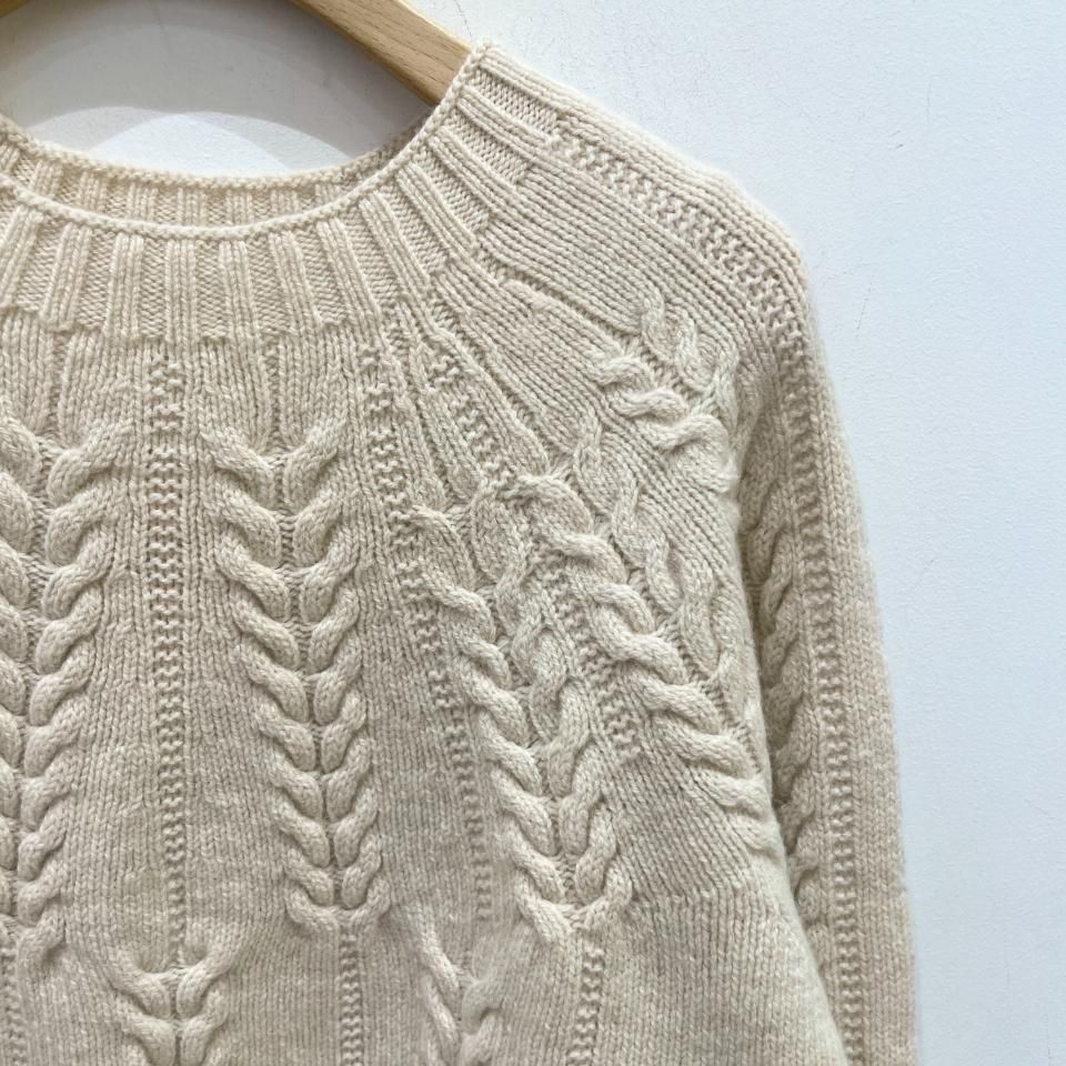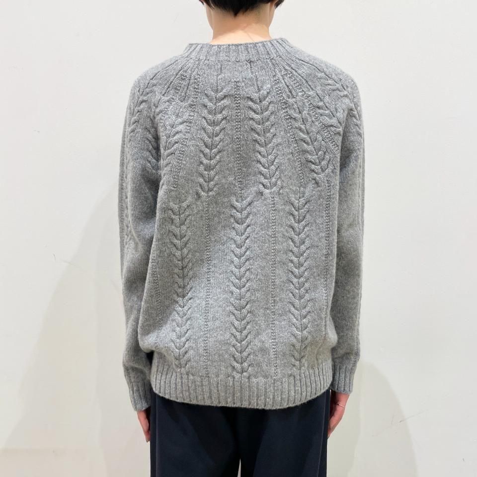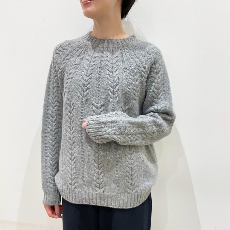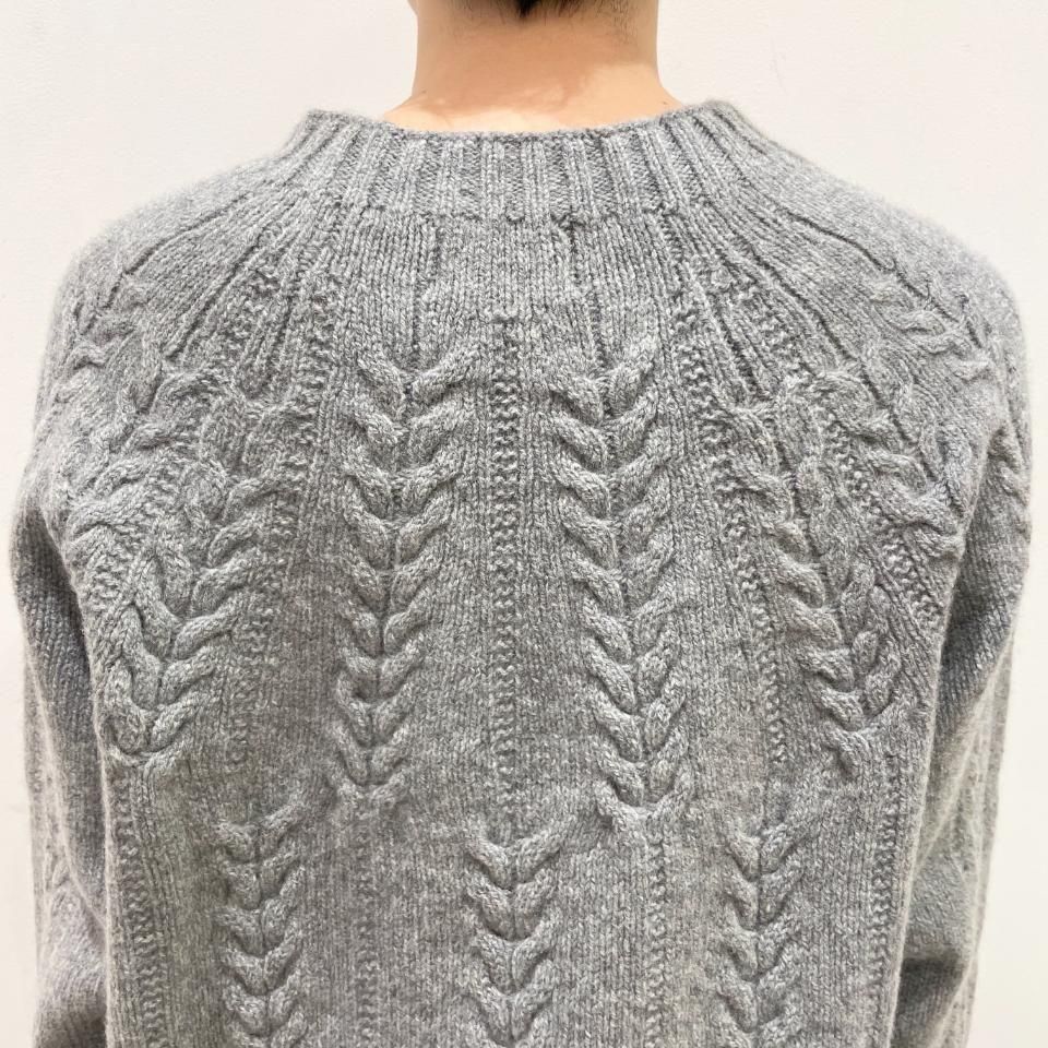 シンプルなクルーネックに袖や身頃に入ったケーブル編みデザインが特徴的なニットです。
