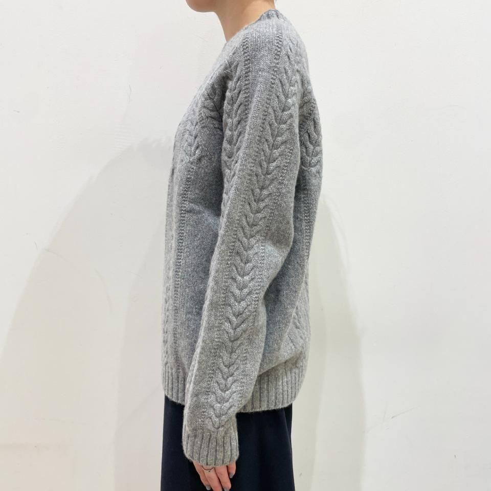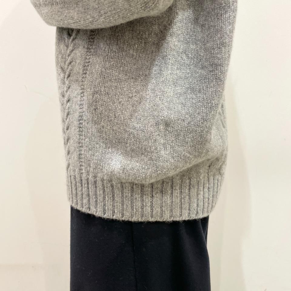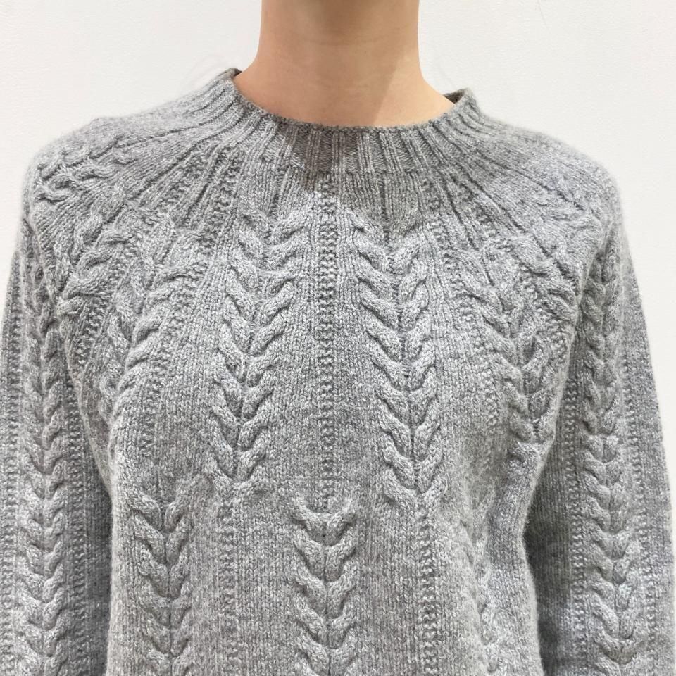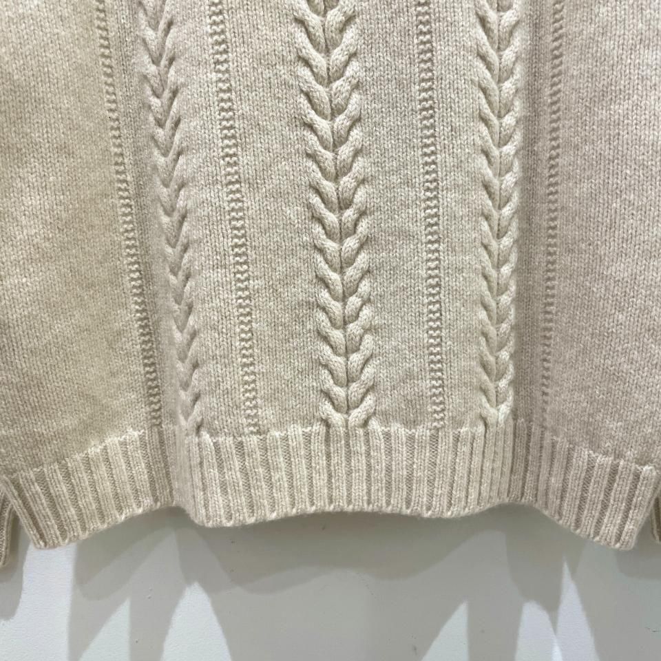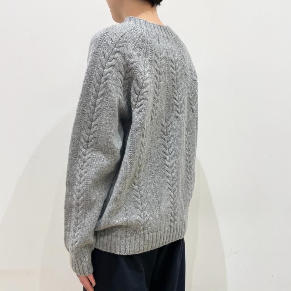 シンプルなクルーネックに袖や身頃に入ったケーブル編みデザインが特徴的なニットです。