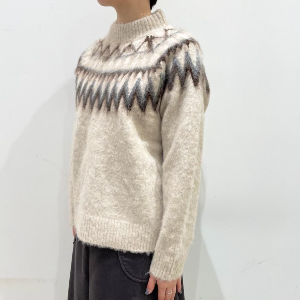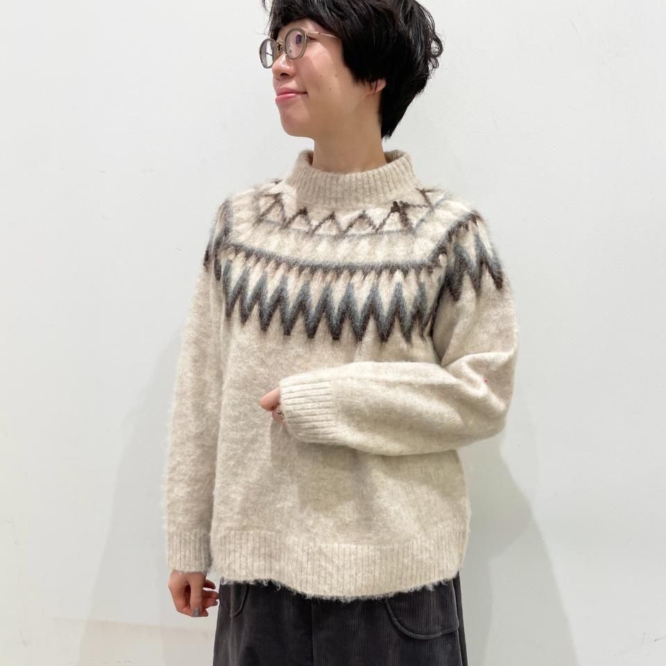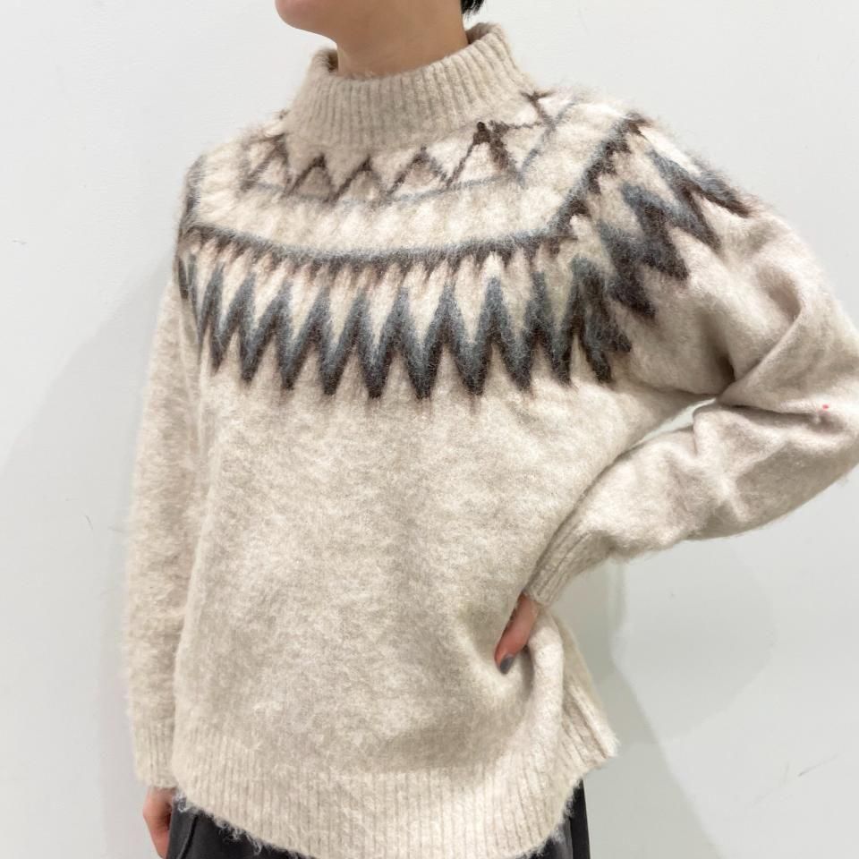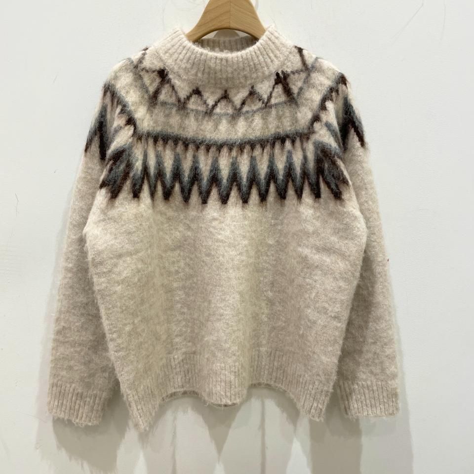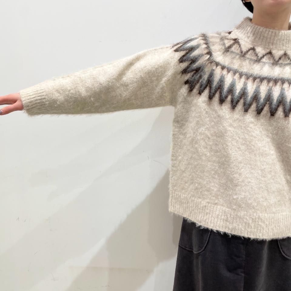 ノルディック柄が印象的なニットプルオーバー。
