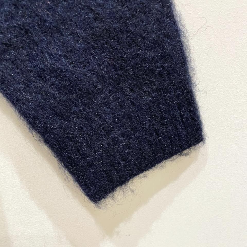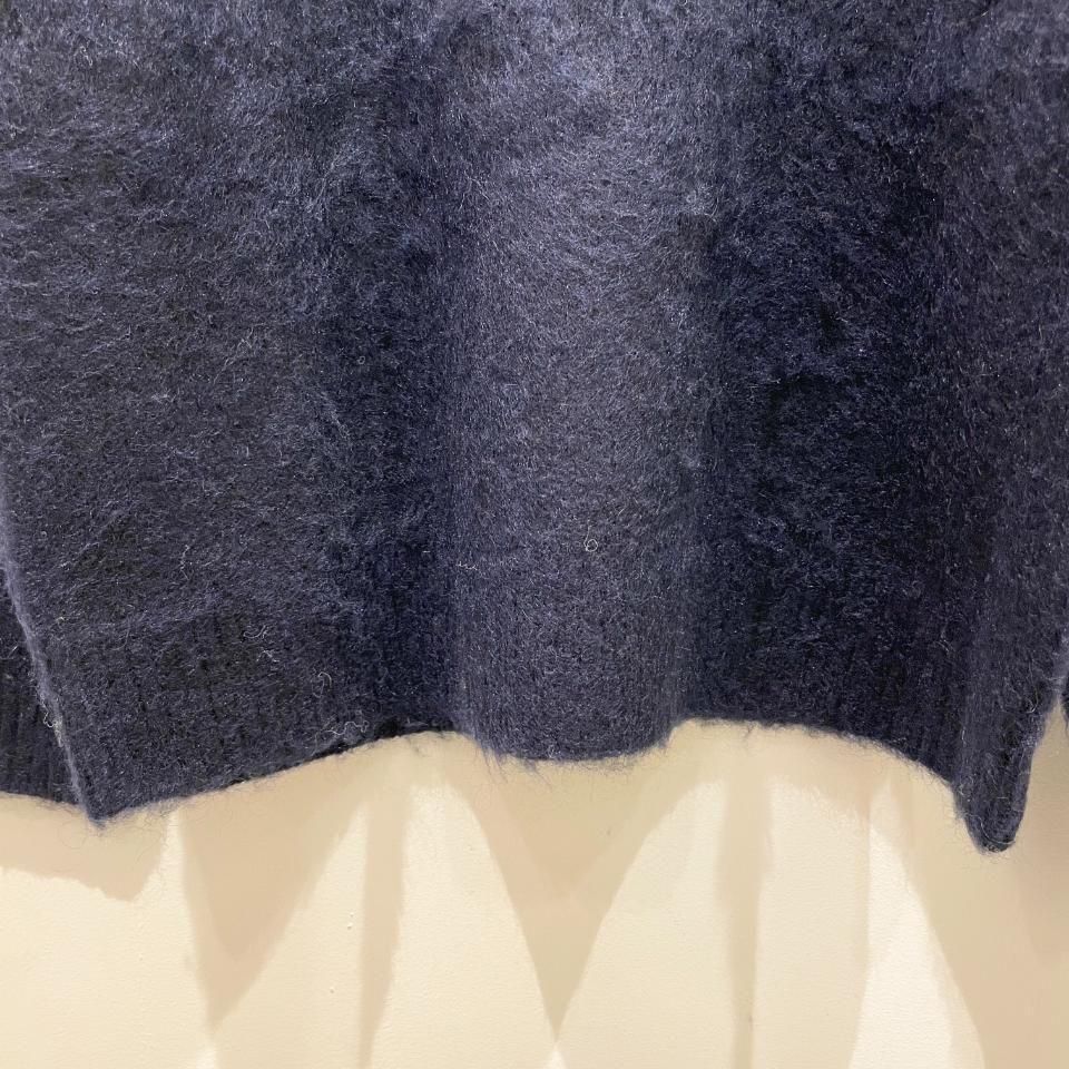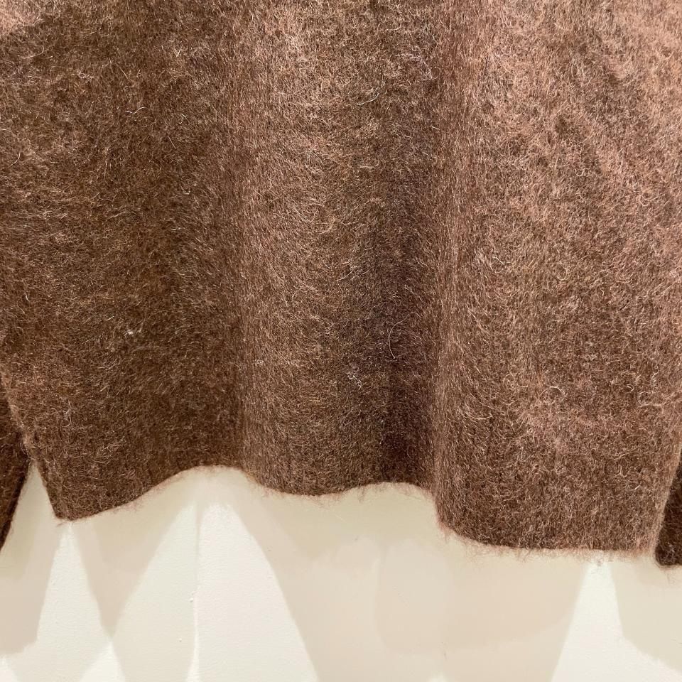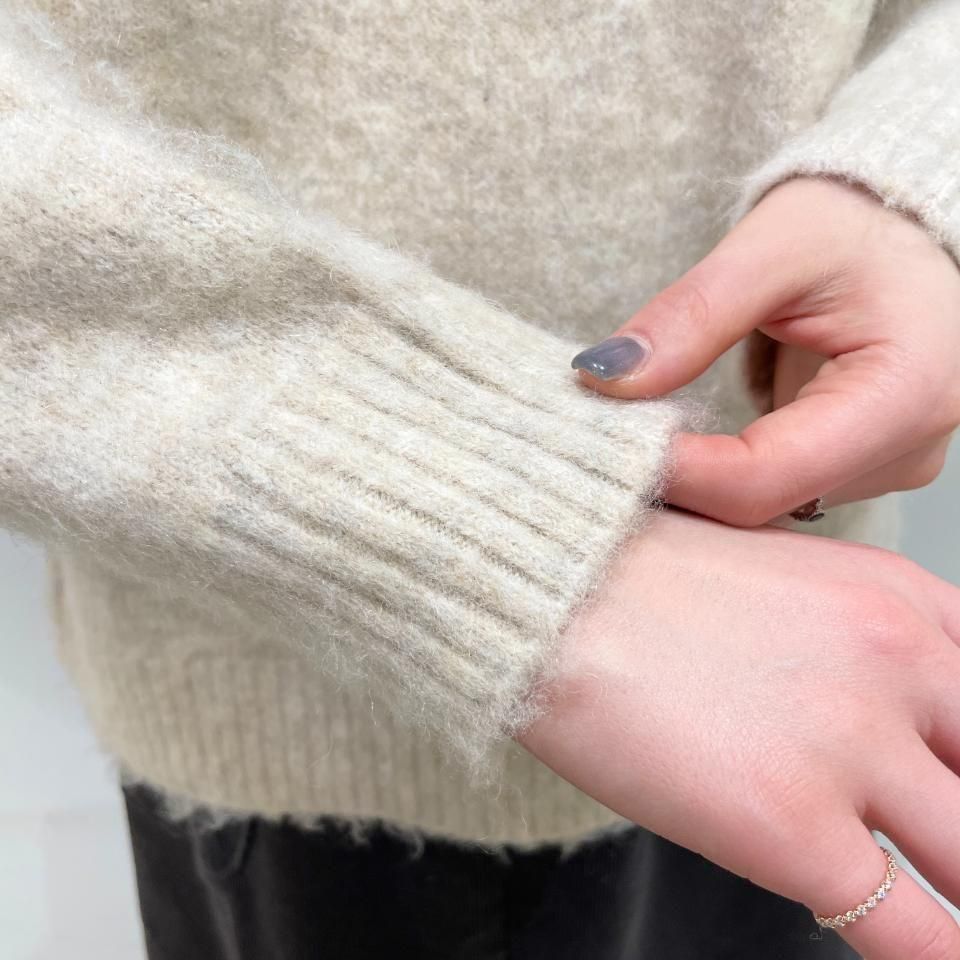 やや浅めのハイネックで、ふわふわとした毛羽が立った質感をもつシャギーニットです。